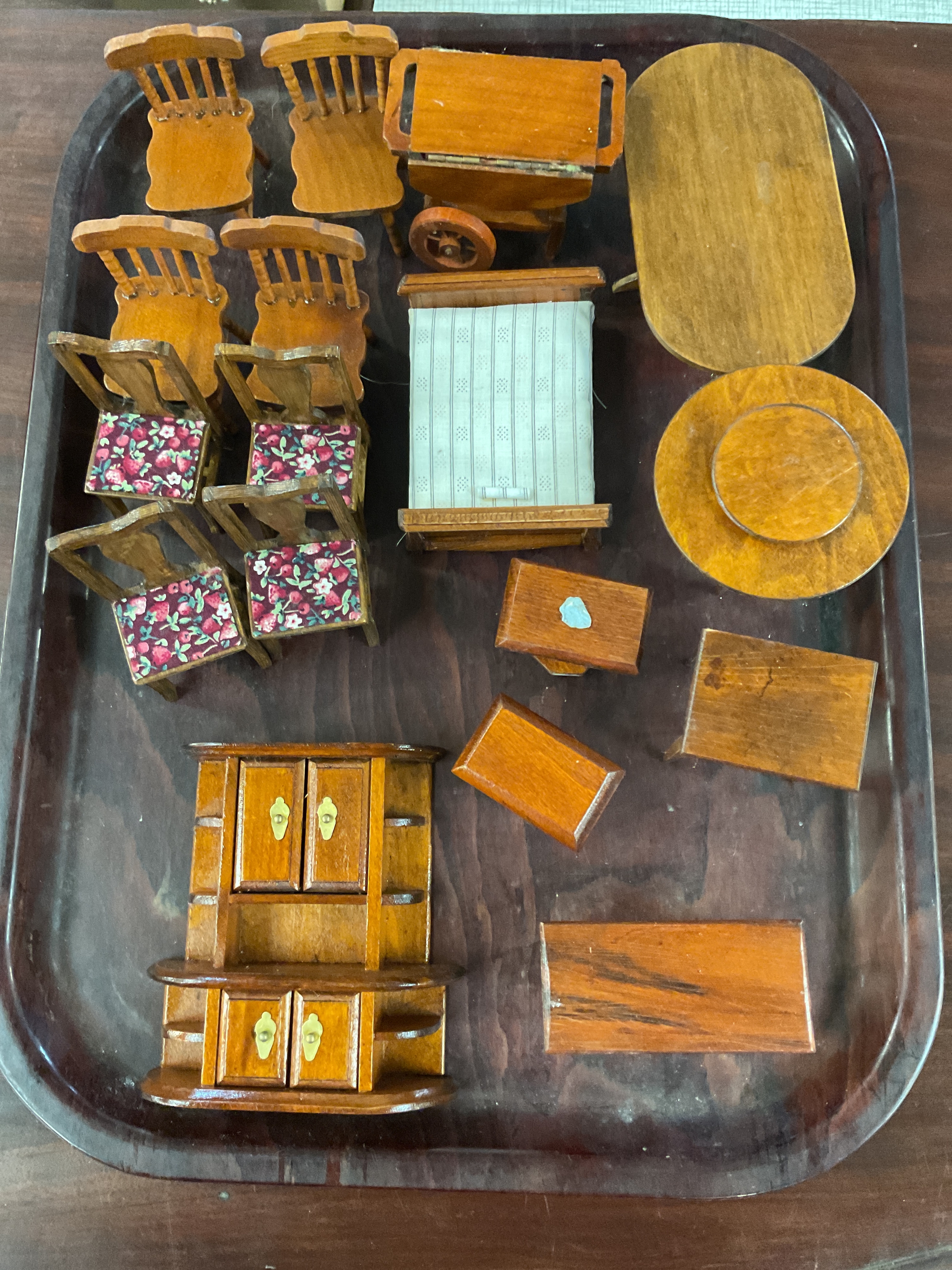 A mixed selection of assorted dolls house furniture to include tables, chairs, dresser etc
