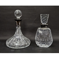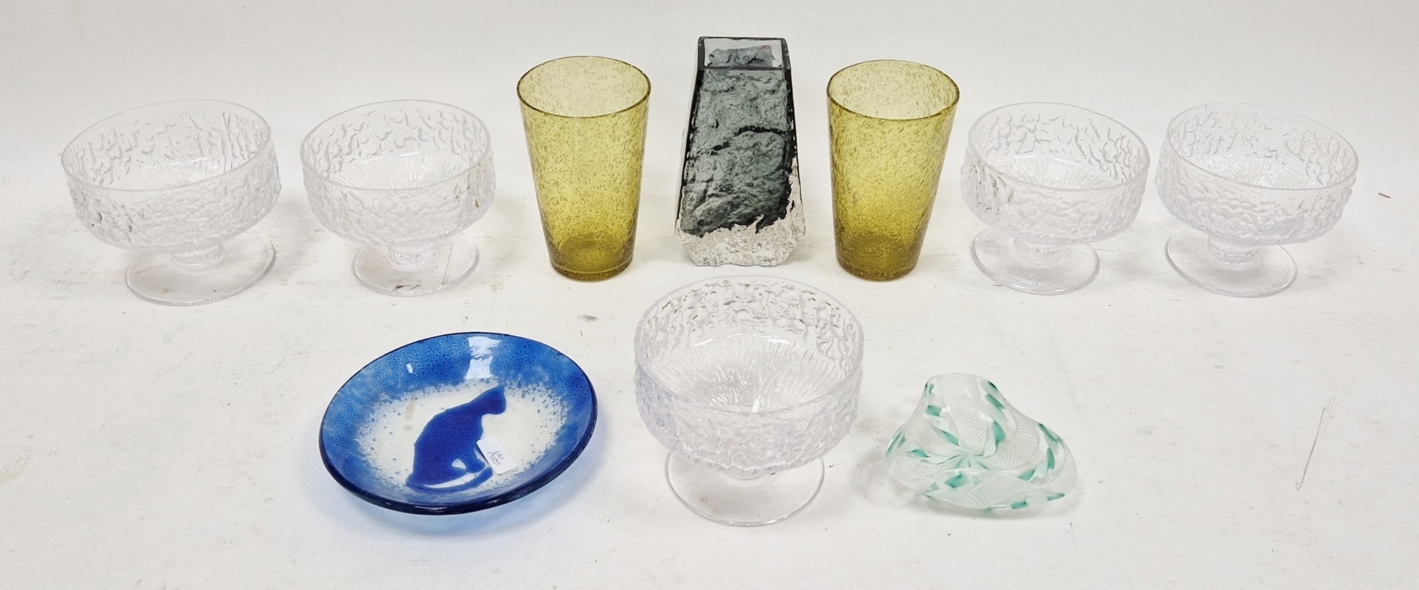 Whitefriars 'coffin' vase designed by Geoffrey Baxter in pewter colourway, 13cm high, a set of five Whitefriars 'glacier' sundae dishes, a Sarah Broadhead blue and clear glass dish with cat decoration, signed to base, diameter 13cm, a Venetian latticino glass dish of tricorn form and a pair of yellow glass drinking glasses (10)