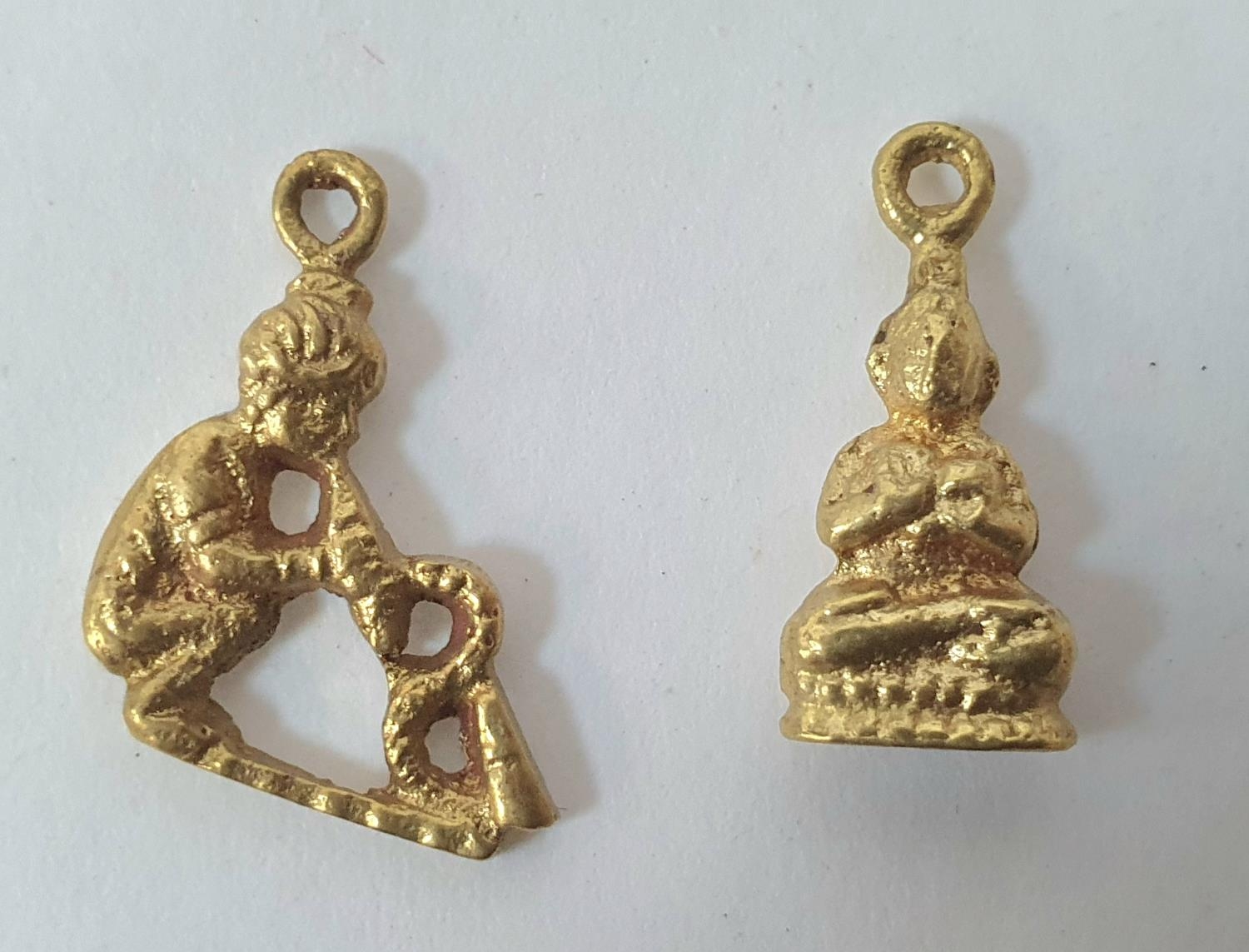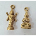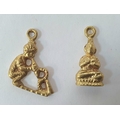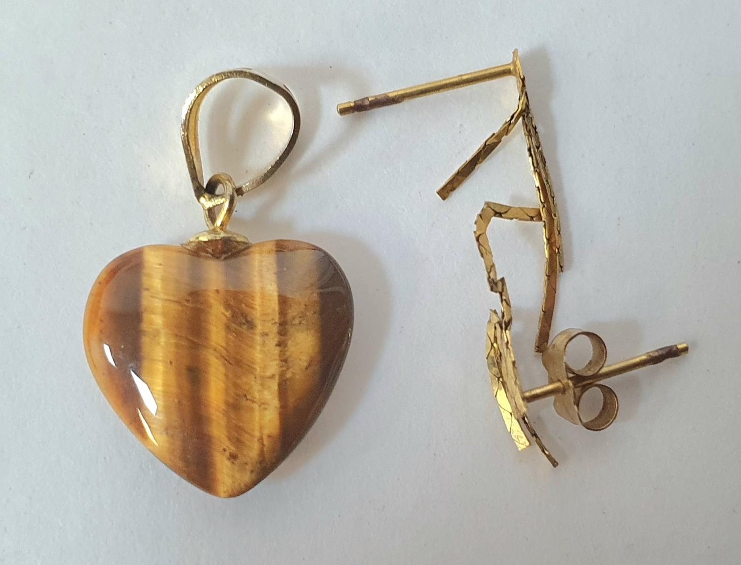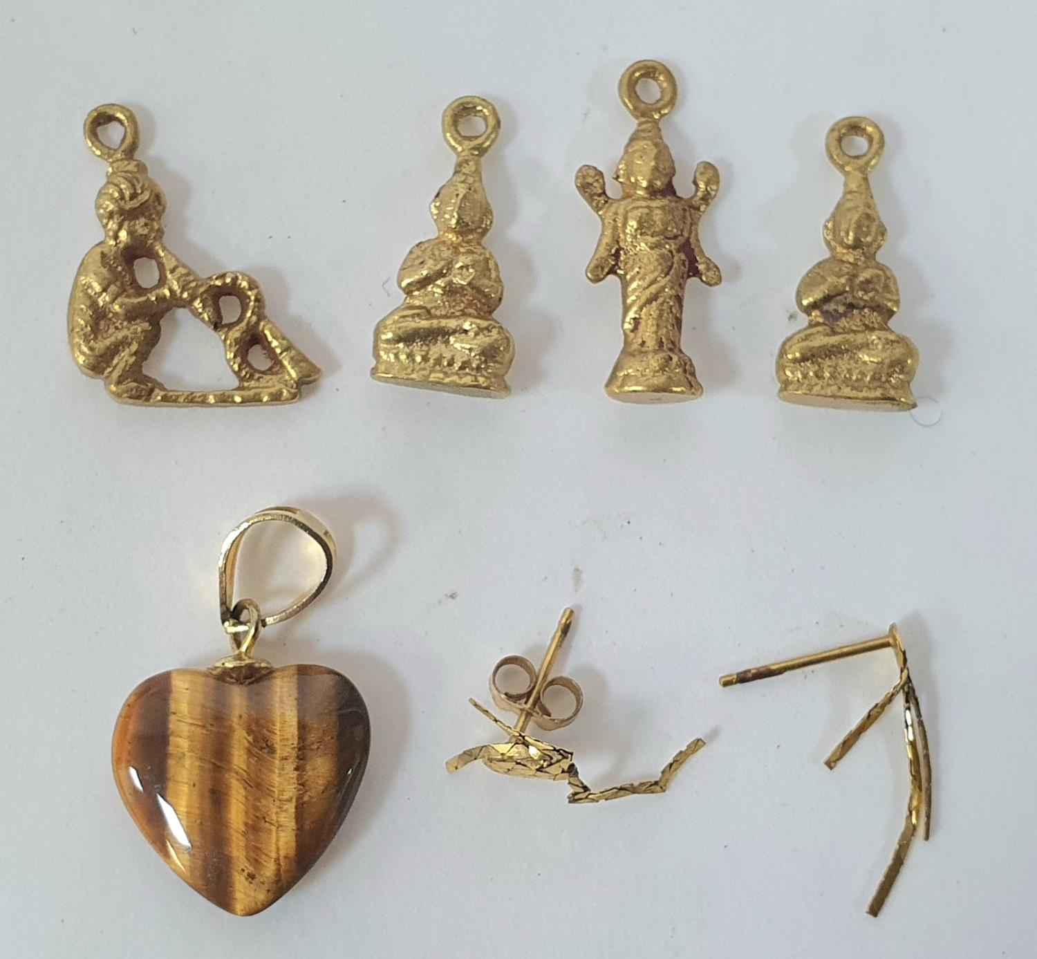 Four unmarked Indian gold charms together with a pair of unmarked gold coloured earrings (6 grams) together with a pair of heart shaped hardstone earrings (6),