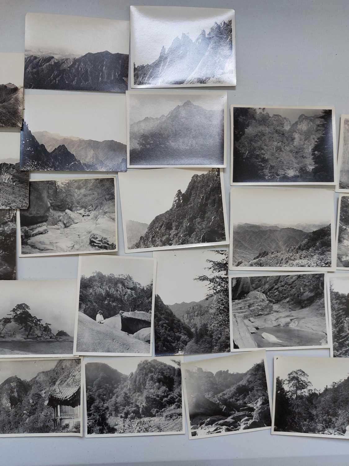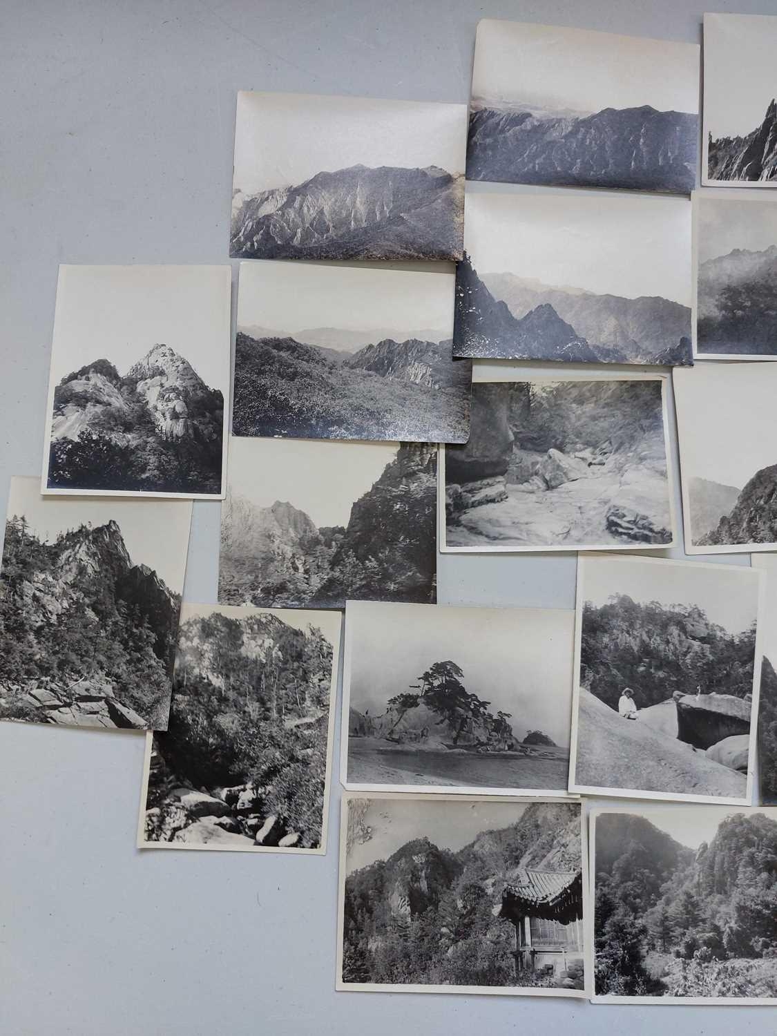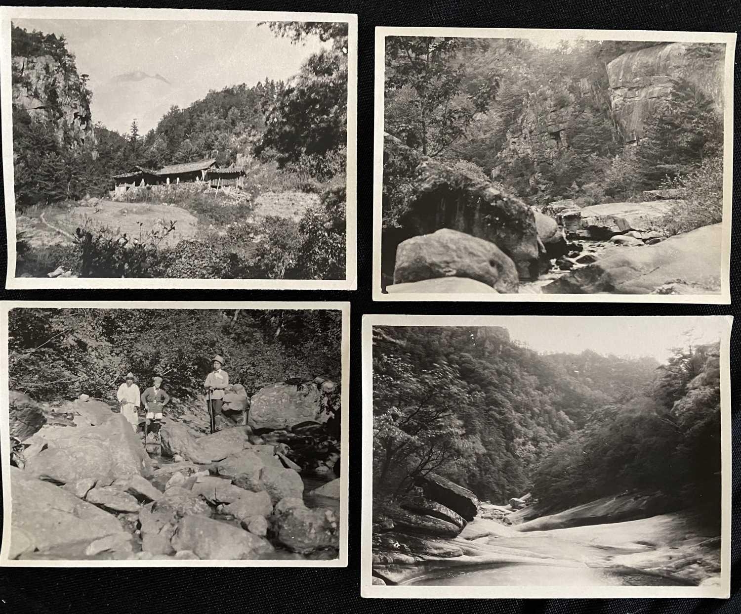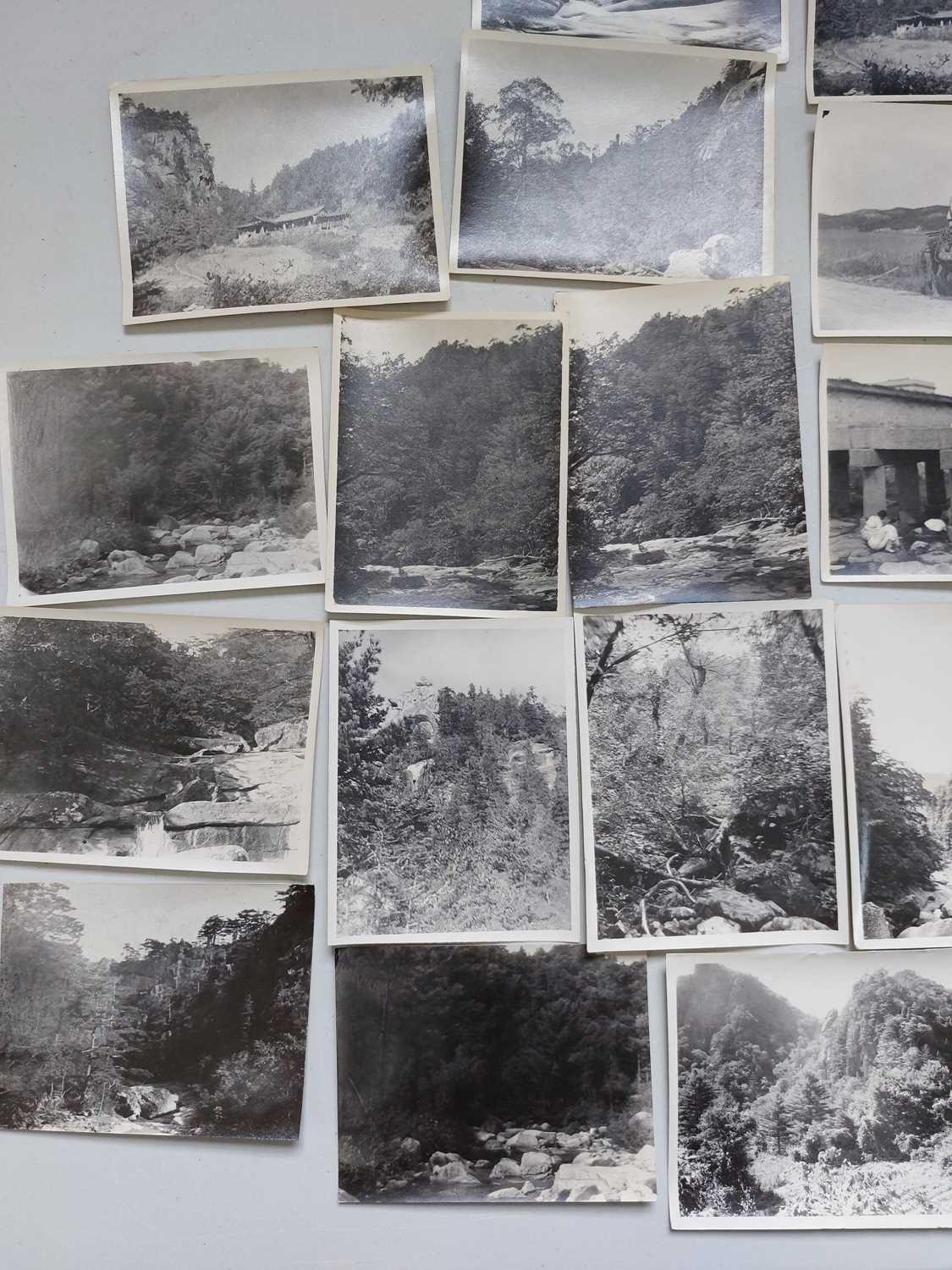Early 20th century photographs. Mount Kumgang, Korea. A collection of one hundred and sixteen b+w photographs, showing the 'Diamond Mountain' region of Korea, including mountain scenes, many temples, priests, forests etc, shot by W. A. B. Leach using either a '3A Graflex' or a 'Thornton Pickard Special Ruby', between the years 1902-1925, (av) size 8cm x 10cm. (116)