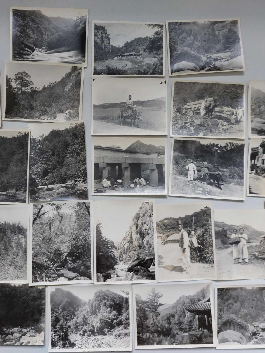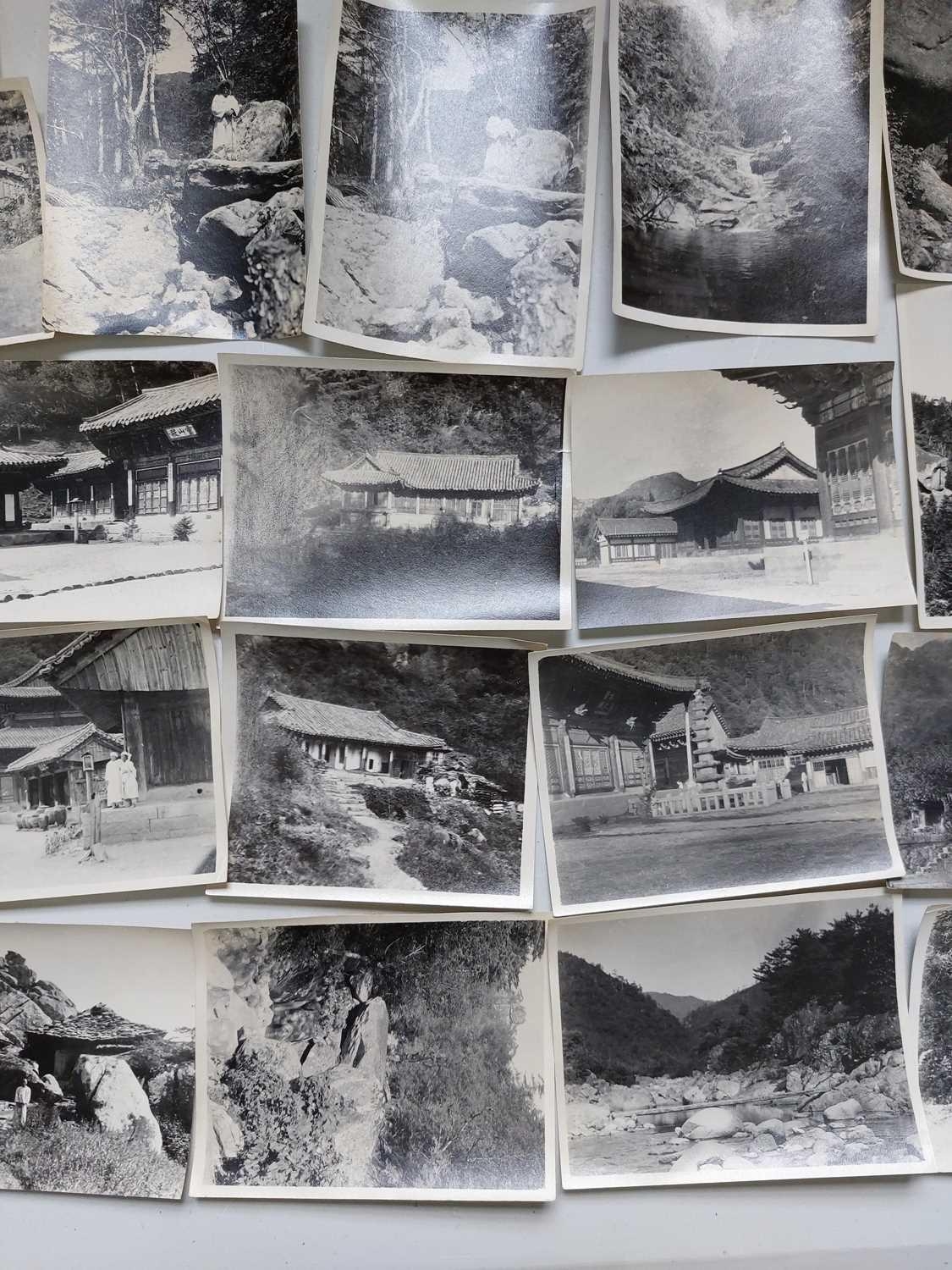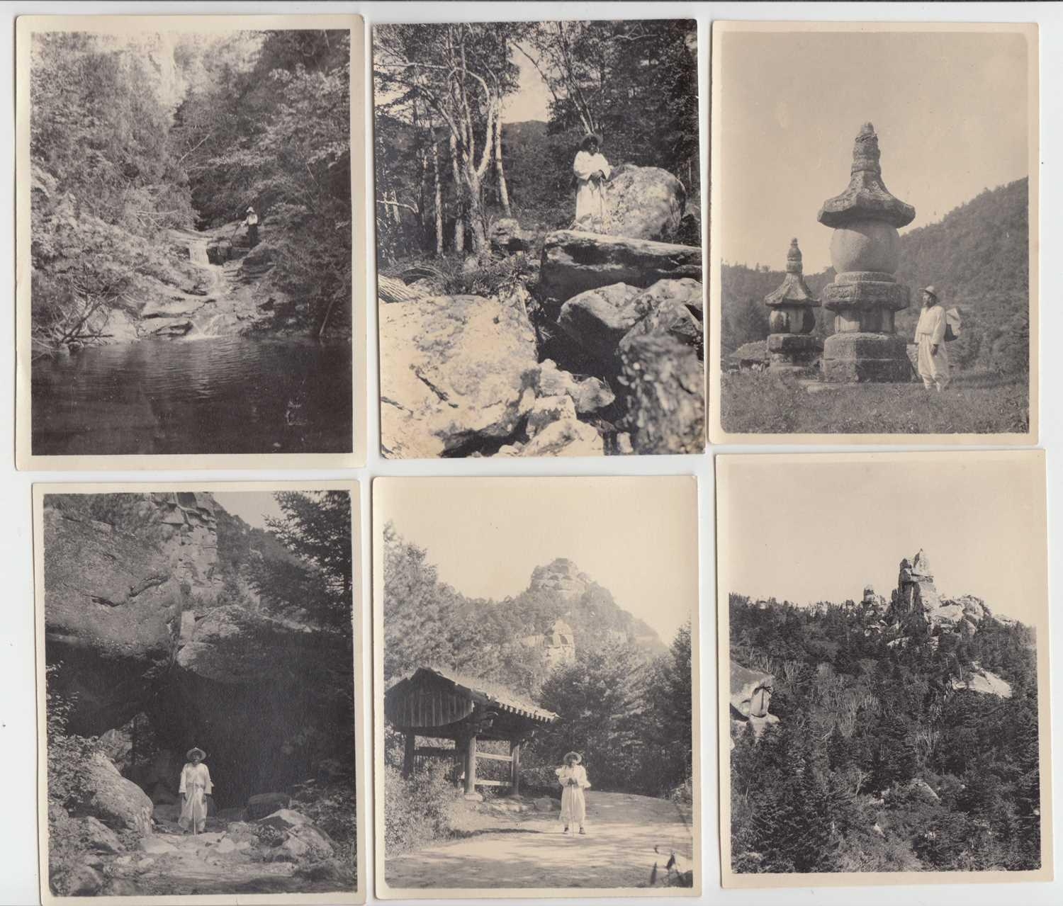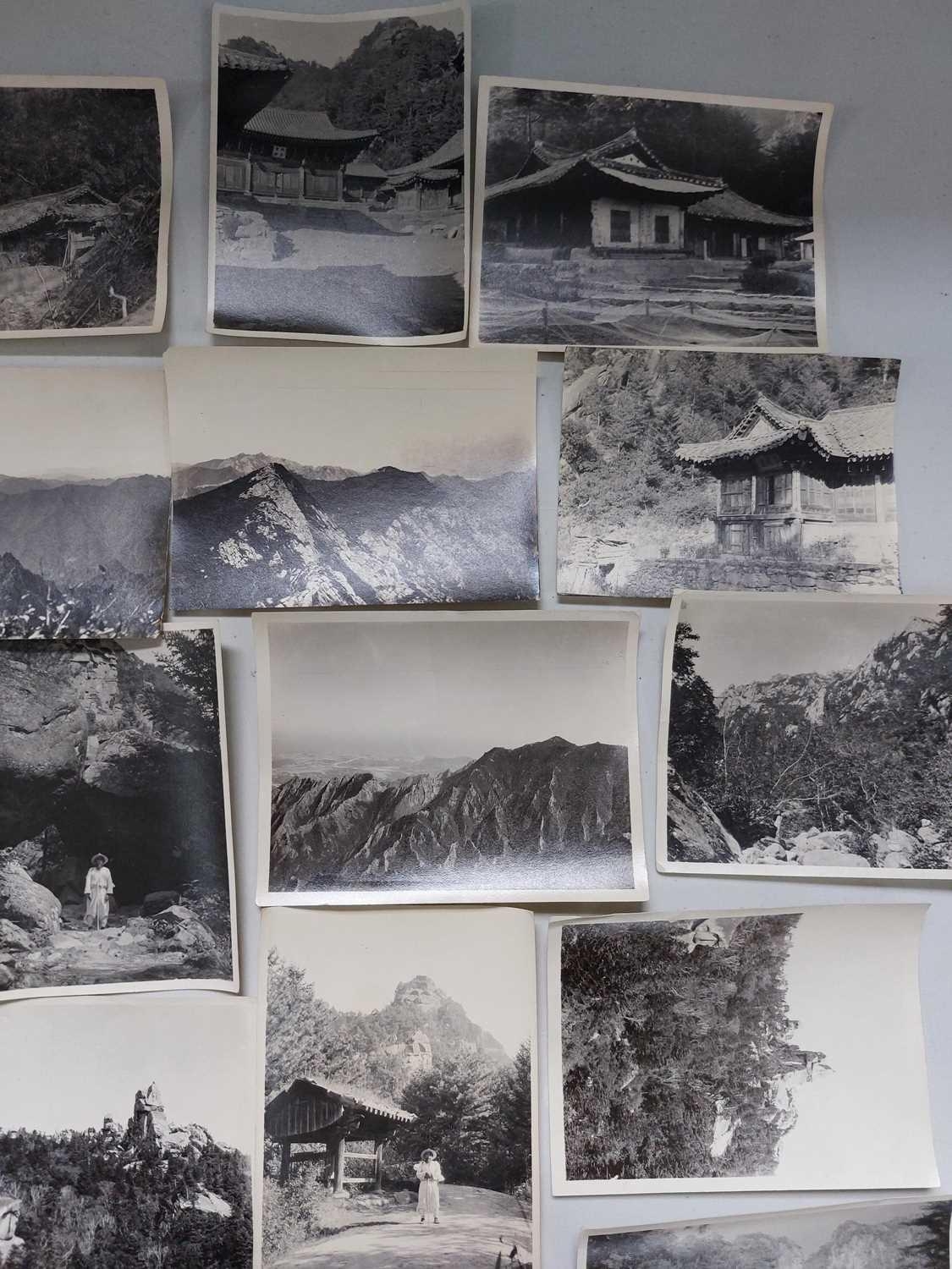 Early 20th century photographs. Mount Kumgang, Korea. A collection of one hundred and sixteen b+w photographs, showing the 'Diamond Mountain' region of Korea, including mountain scenes, many temples, priests, forests etc, shot by W. A. B. Leach using either a '3A Graflex' or a 'Thornton Pickard Special Ruby', between the years 1902-1925, (av) size 8cm x 10cm. (116)