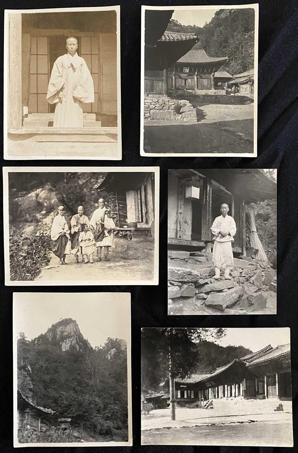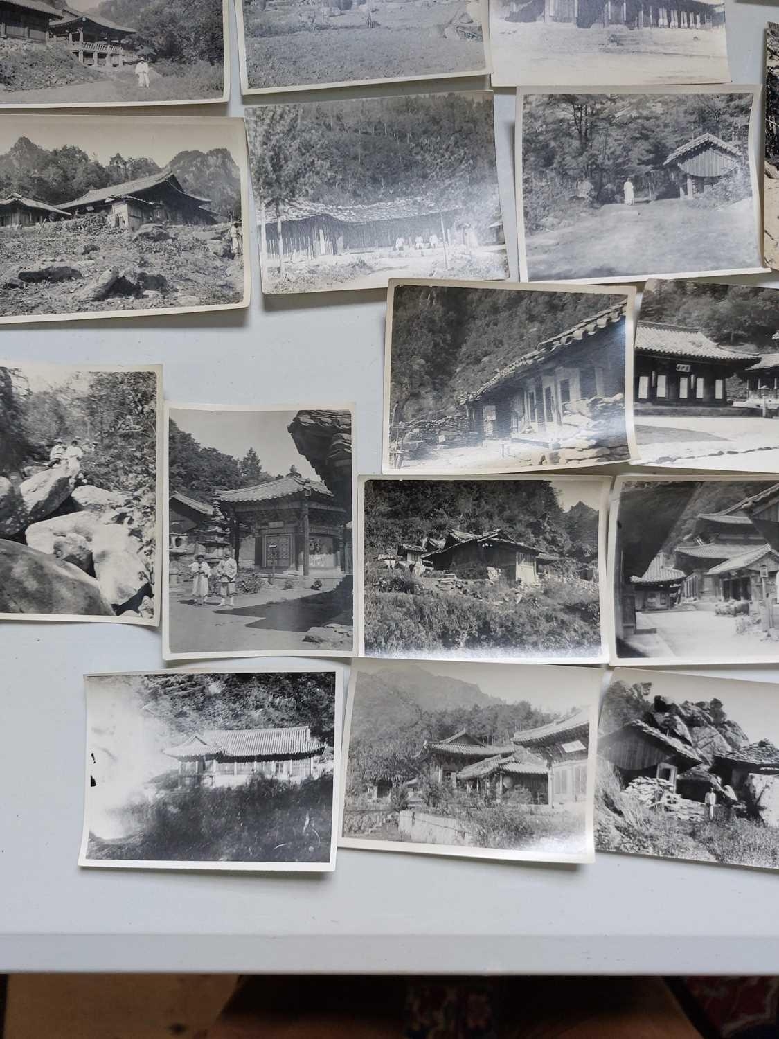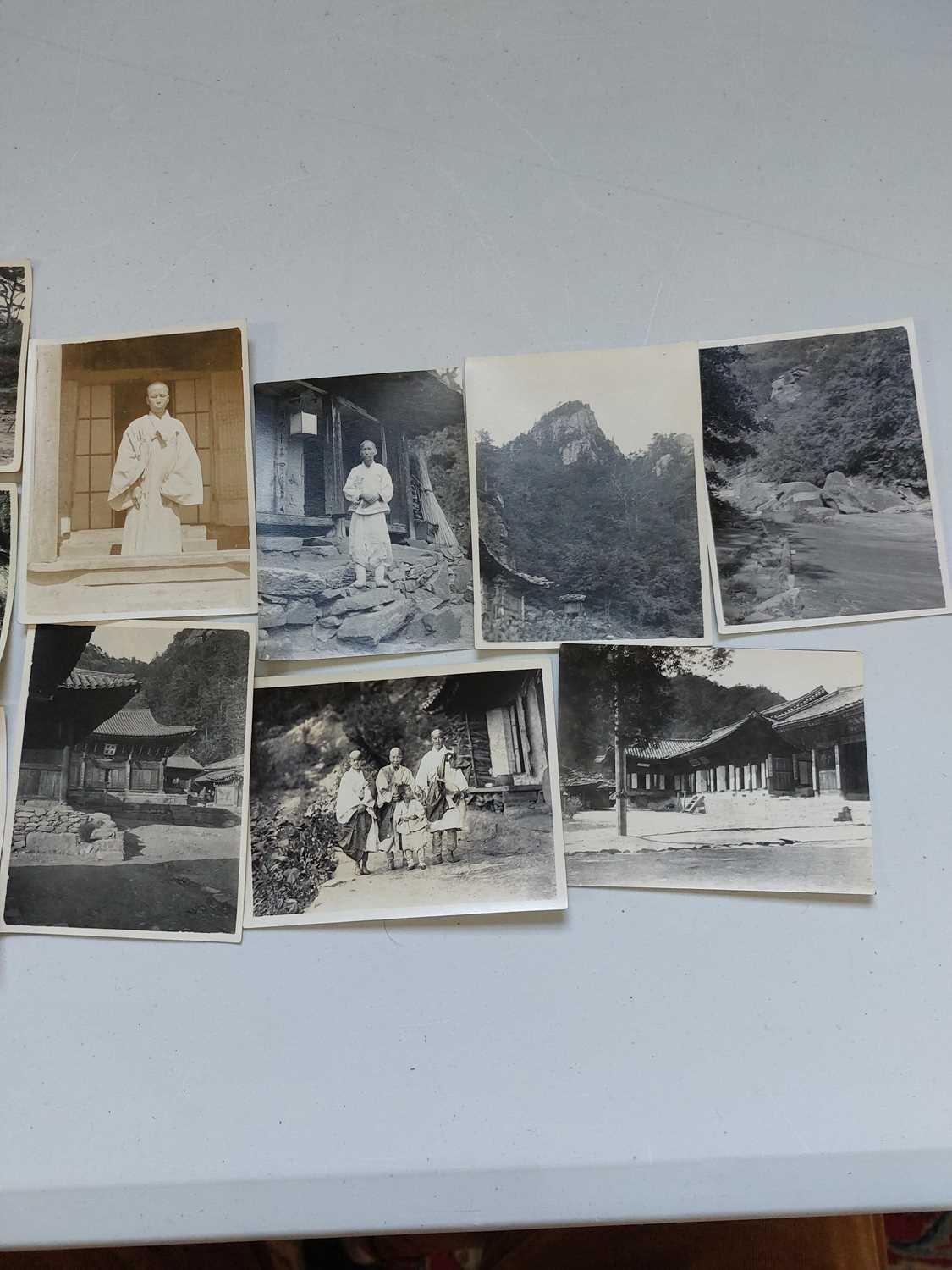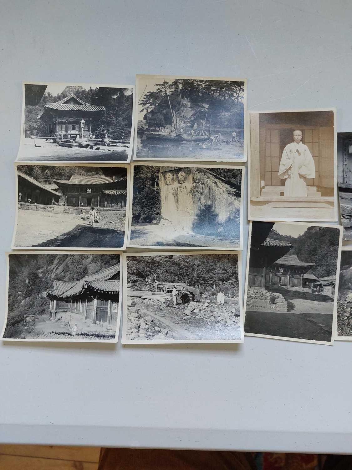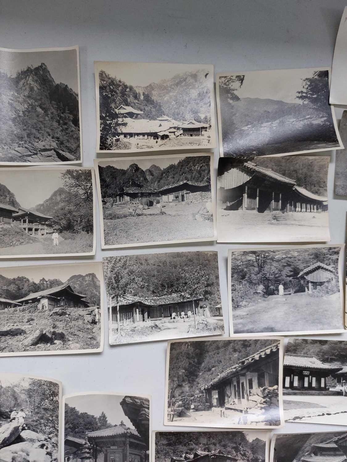 Early 20th century photographs. Mount Kumgang, Korea. A collection of one hundred and sixteen b+w photographs, showing the 'Diamond Mountain' region of Korea, including mountain scenes, many temples, priests, forests etc, shot by W. A. B. Leach using either a '3A Graflex' or a 'Thornton Pickard Special Ruby', between the years 1902-1925, (av) size 8cm x 10cm. (116)