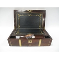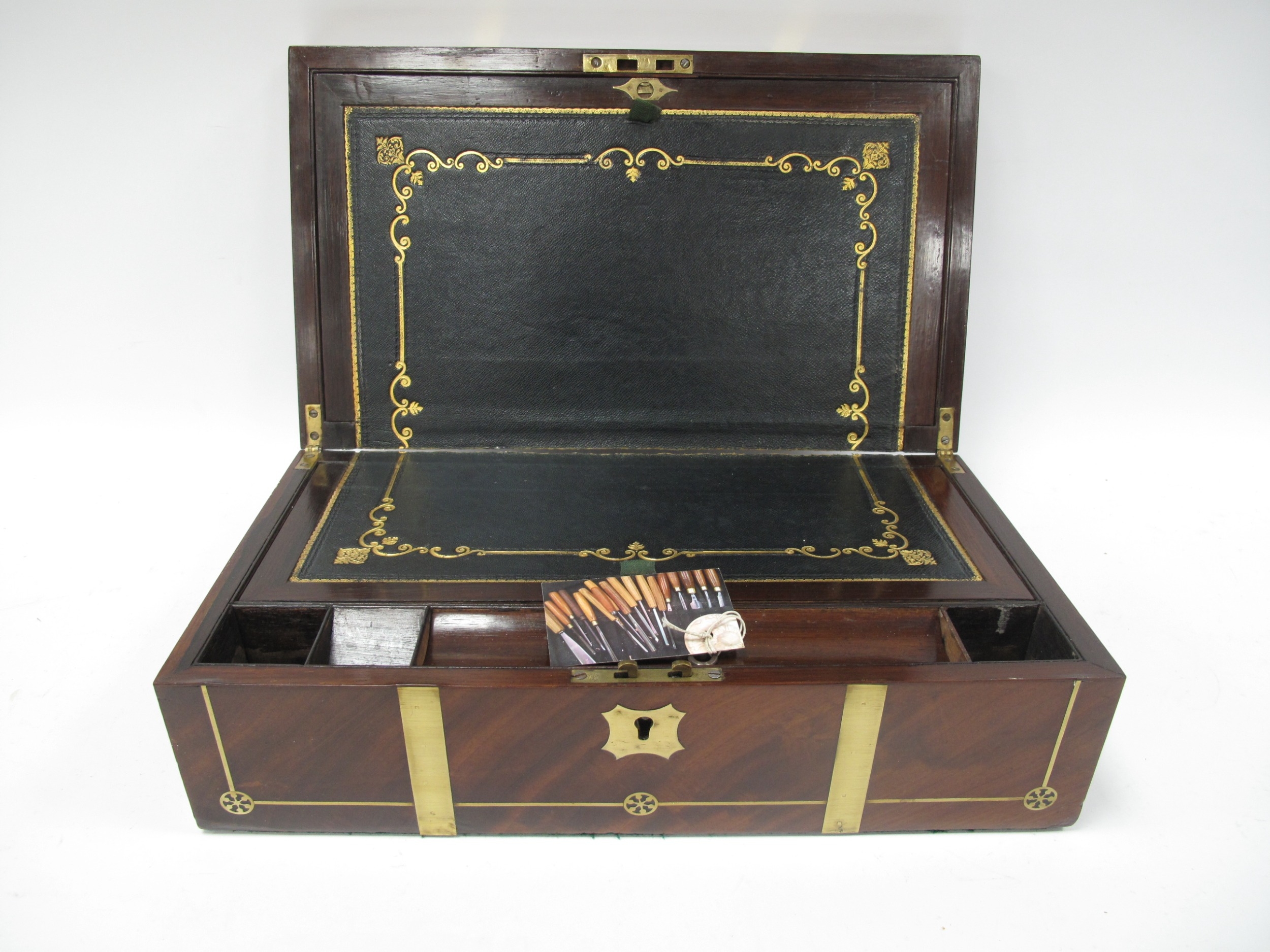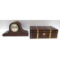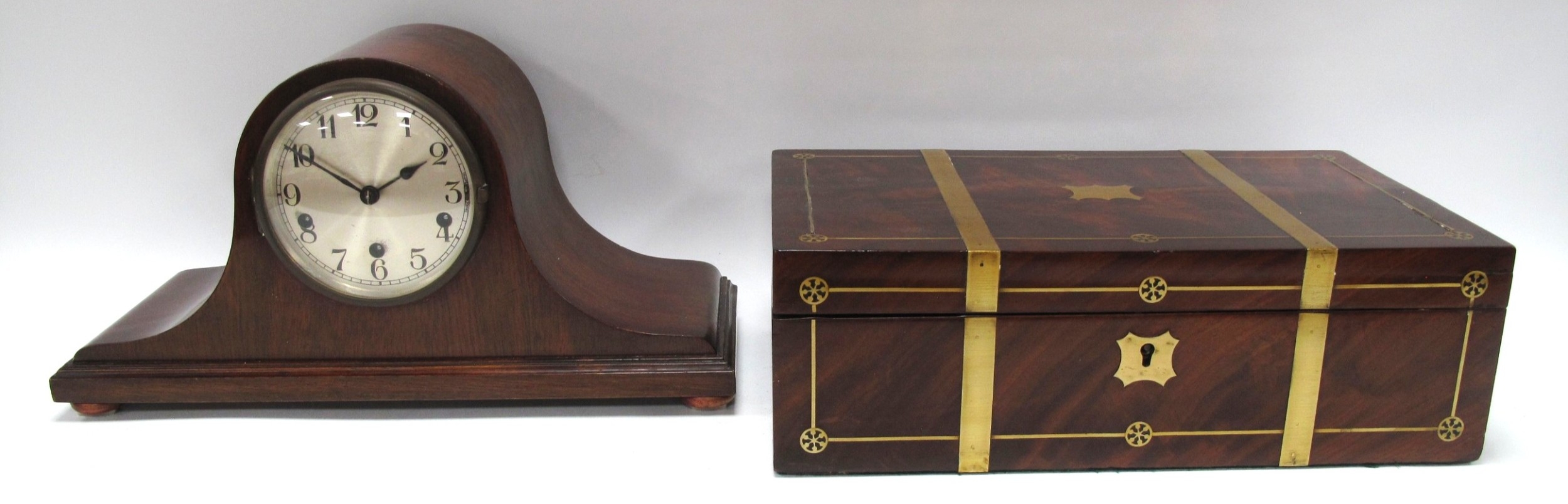 Late XIX Century Mahogany Writing Slope with decorative brass inlay, a Napoleon style mahogany Westminster chimes mantle clock with Arabic numerals to silvered dial, both with keys (2).