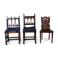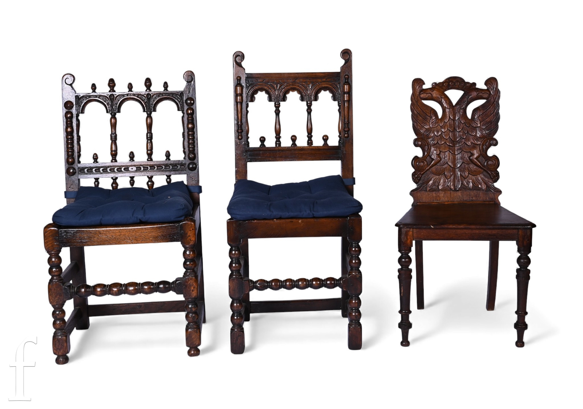 A pair of 17th Century style oak standard chairs on bobbin turned legs and an oak hall chair with carved griffin back. (3)