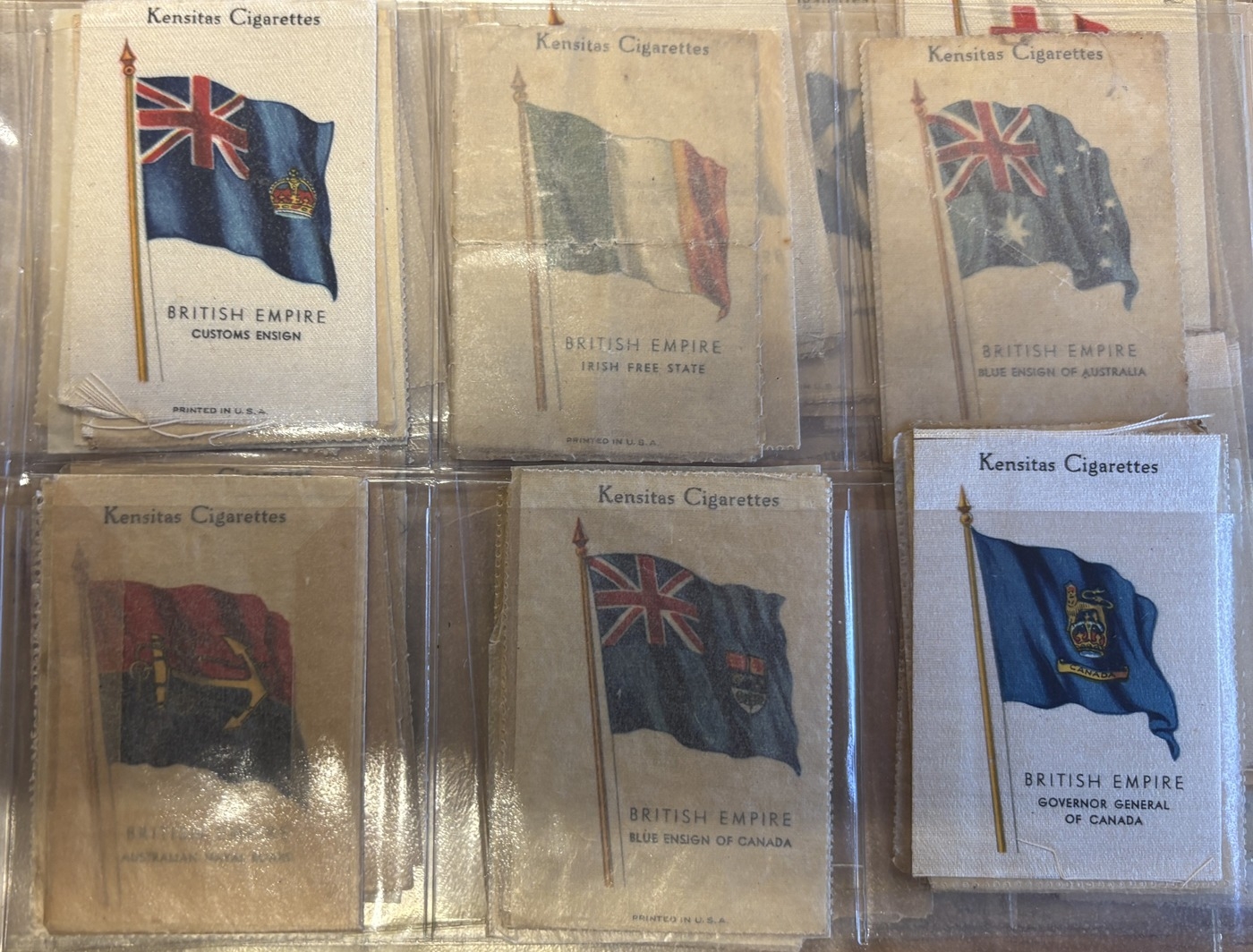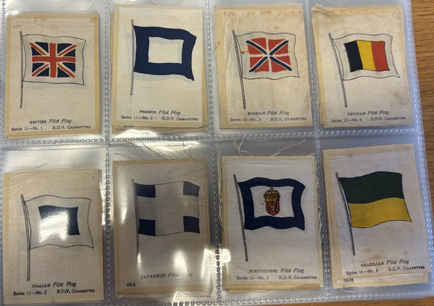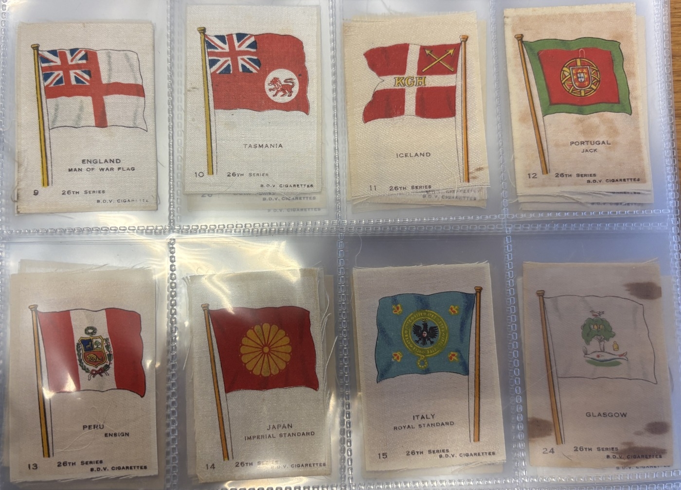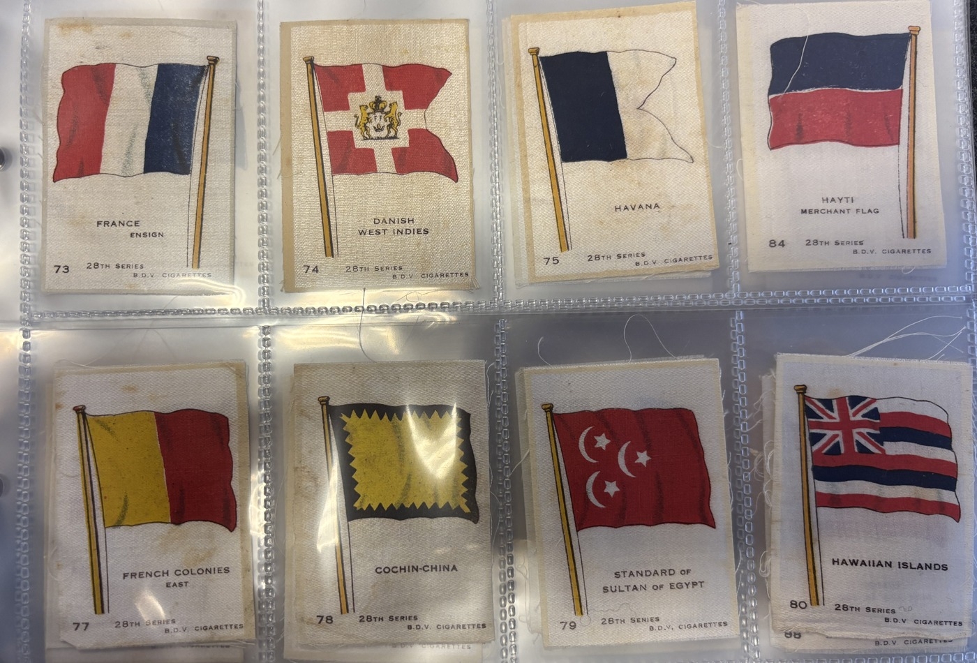 Collection of mostly part set silk flags in one album, generally very good, including ranges of BDV Naval Flags, National flags with series ranging between 5 to 28, Kensitas British Empire and National Flags. Qty. Approx 300+. (V)