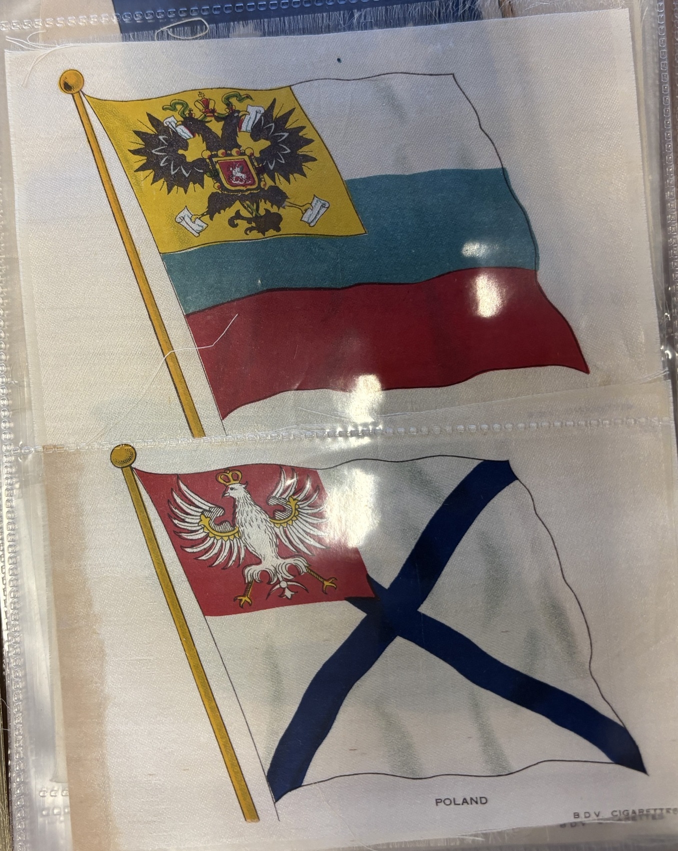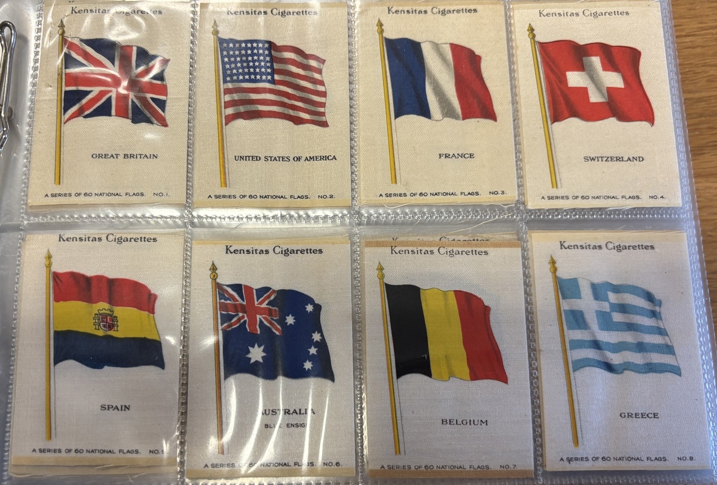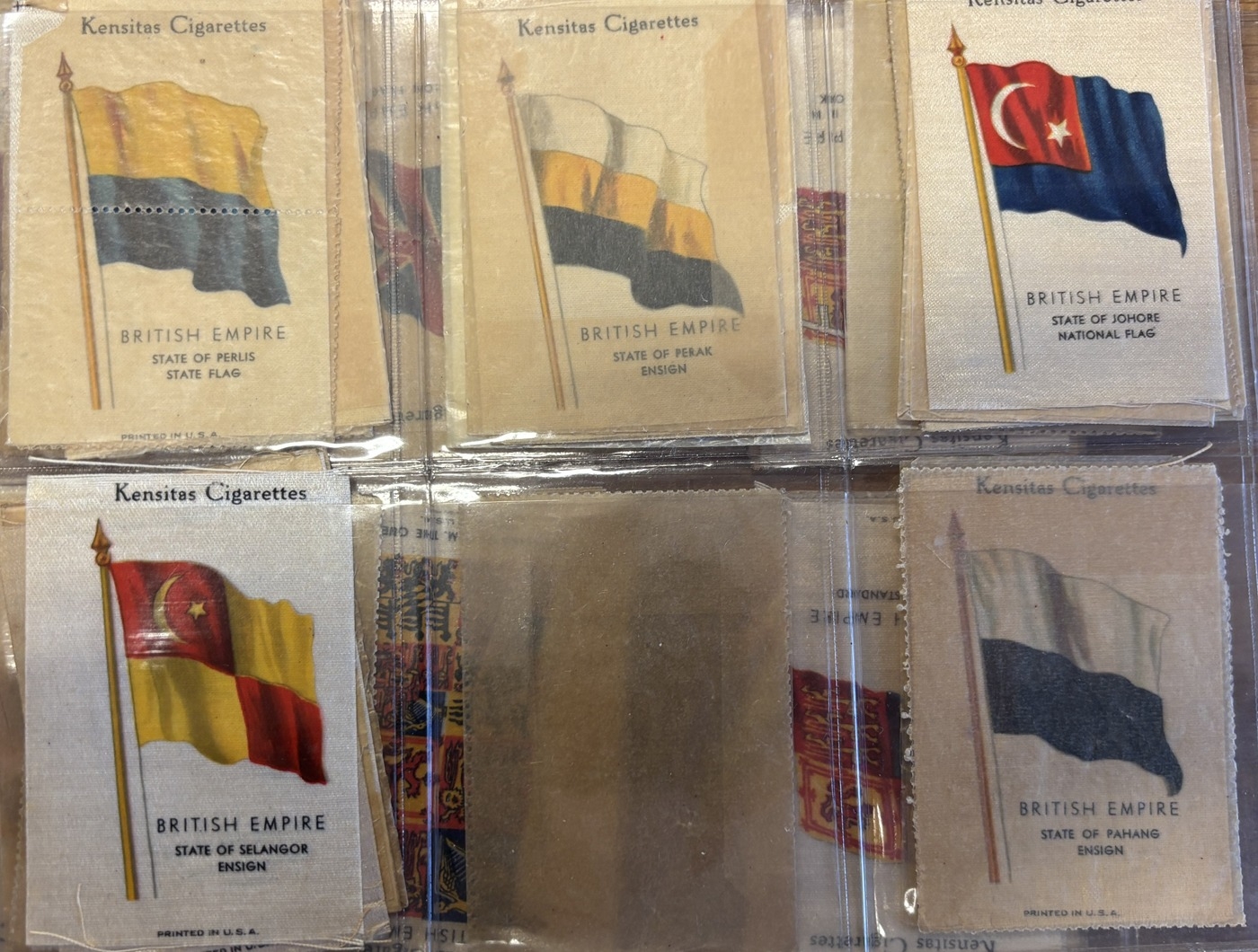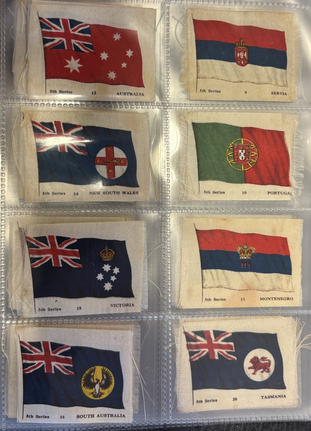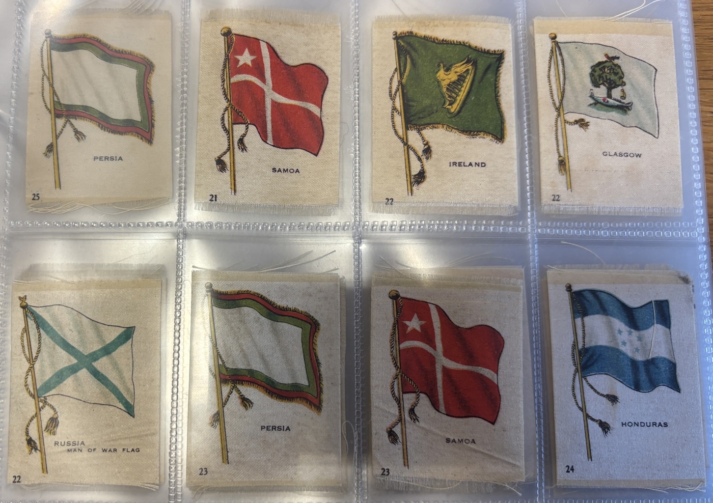 Collection of mostly part set silk flags in one album, generally very good, including ranges of BDV Naval Flags, National flags with series ranging between 5 to 28, Kensitas British Empire and National Flags. Qty. Approx 300+. (V)