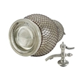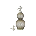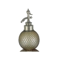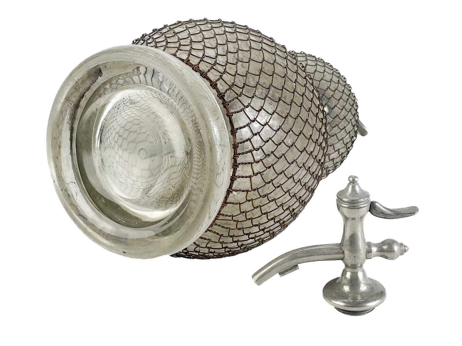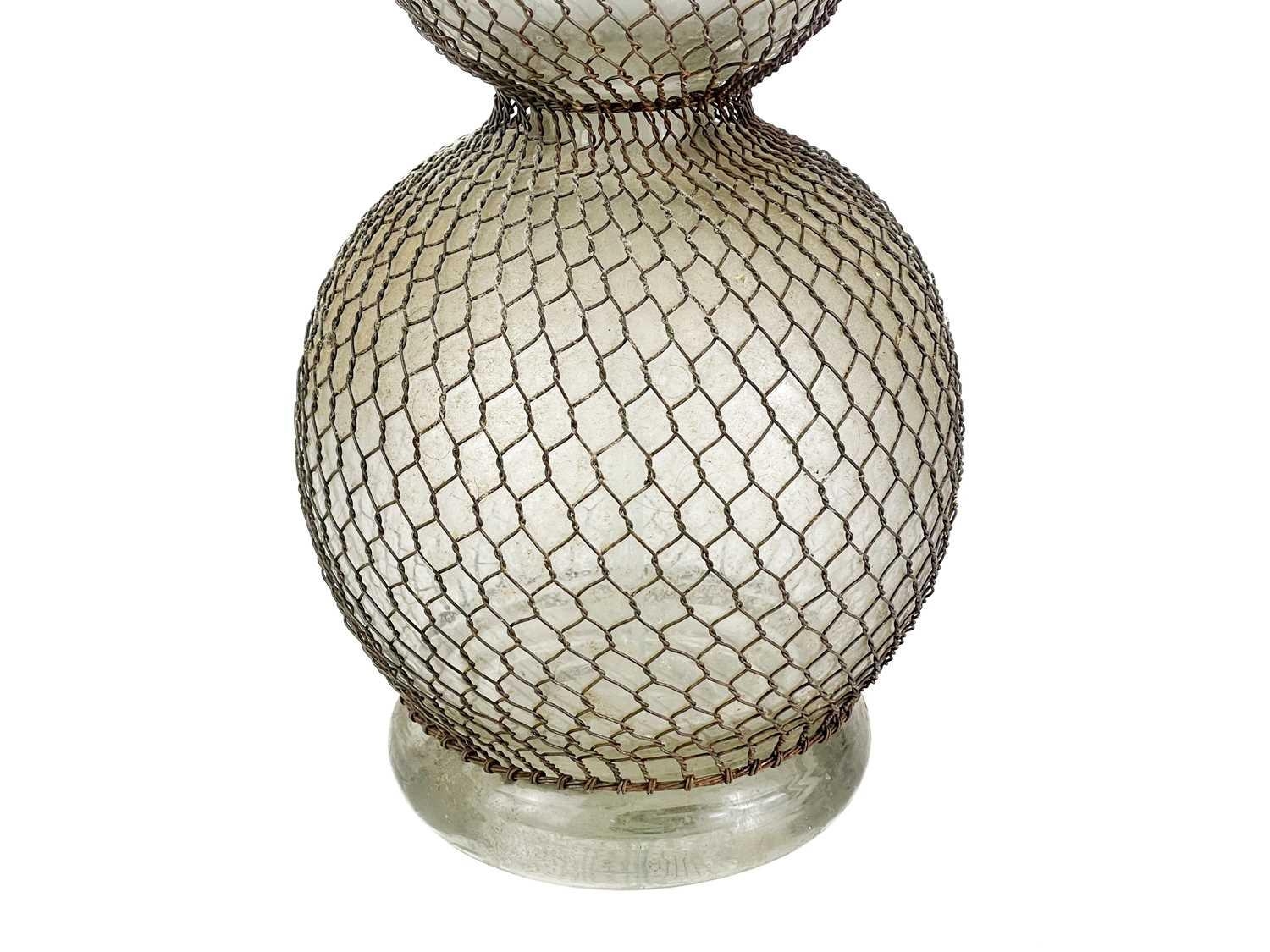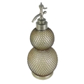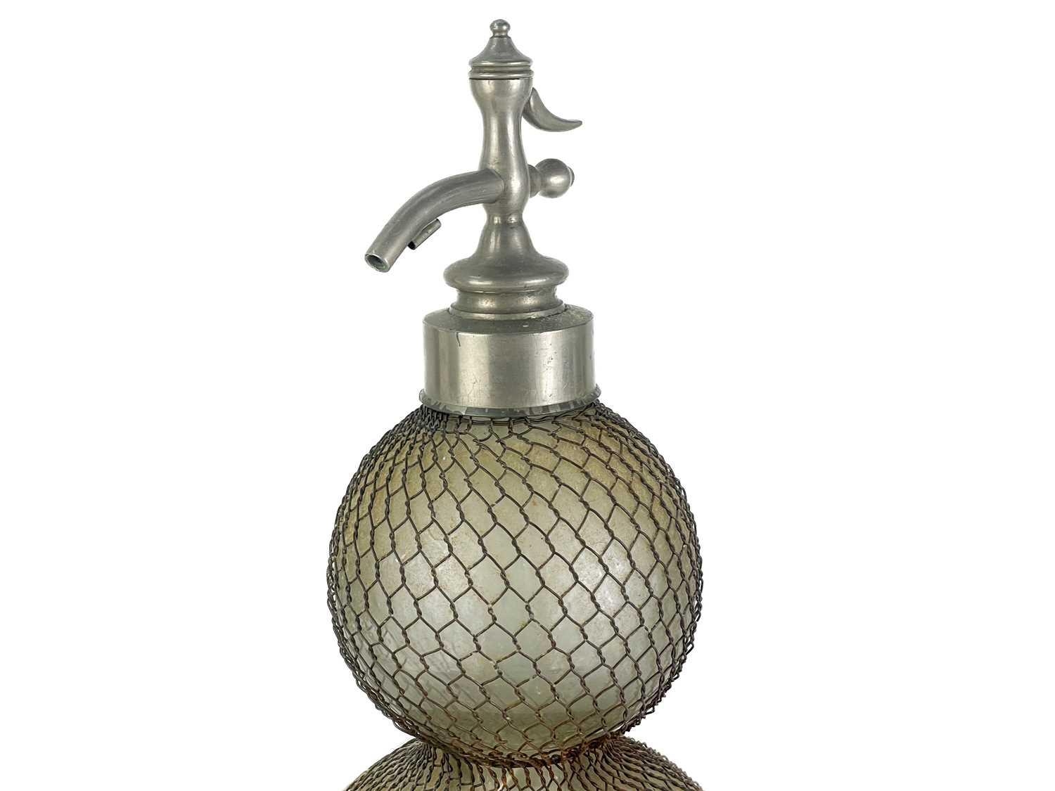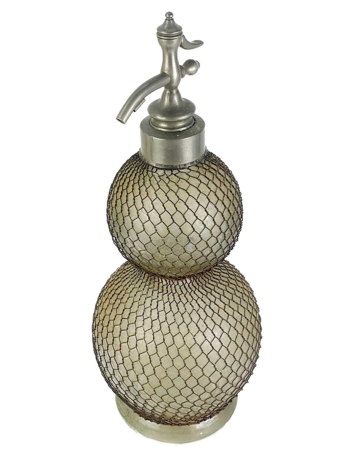 A large early 20th century glass double gourd soda siphon with wire mesh surround. Height 47cm together with a siphon lever spigot. (2)
