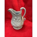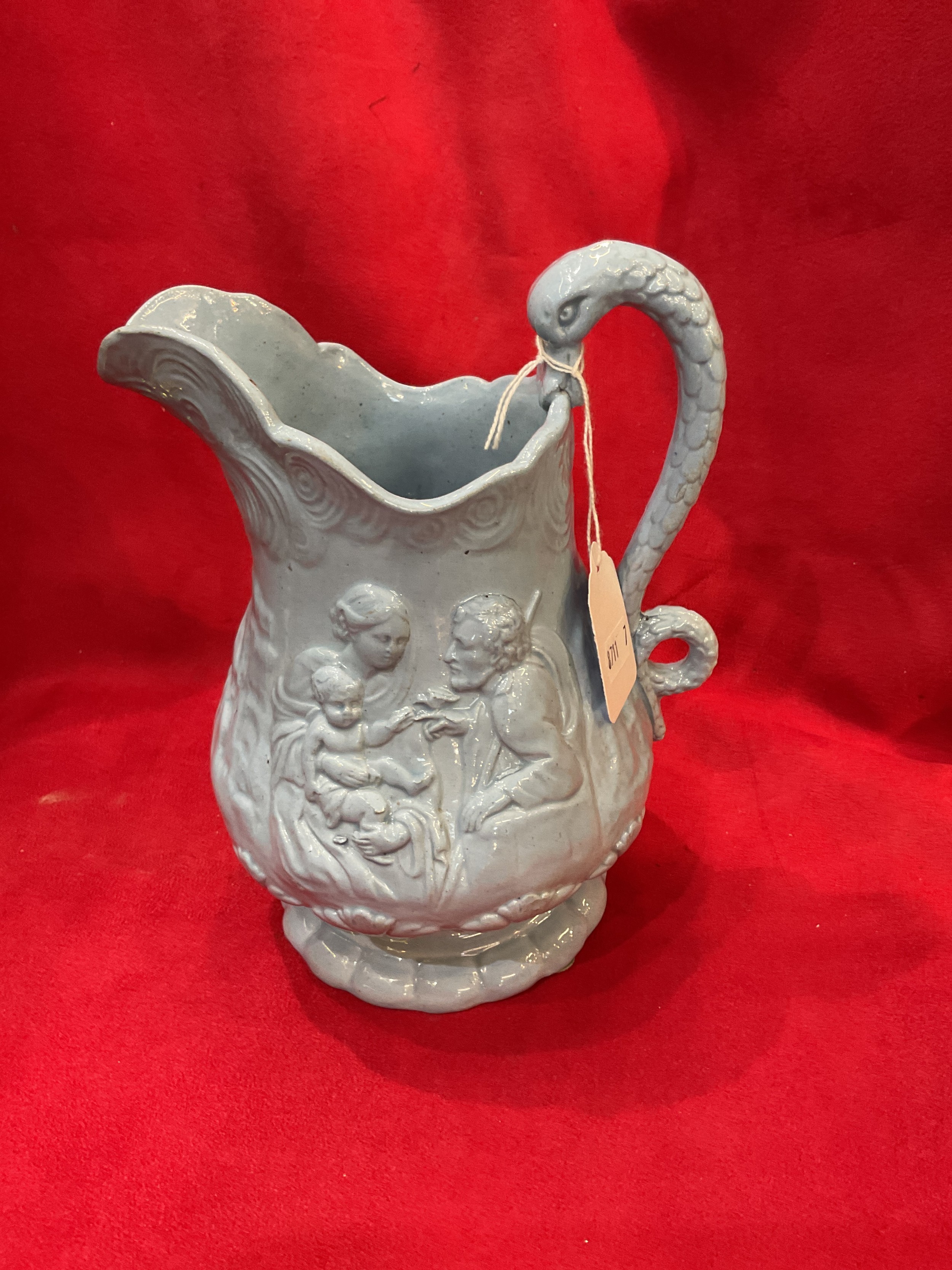 An antique blue glazed jug depicting religious figures with serpent handle