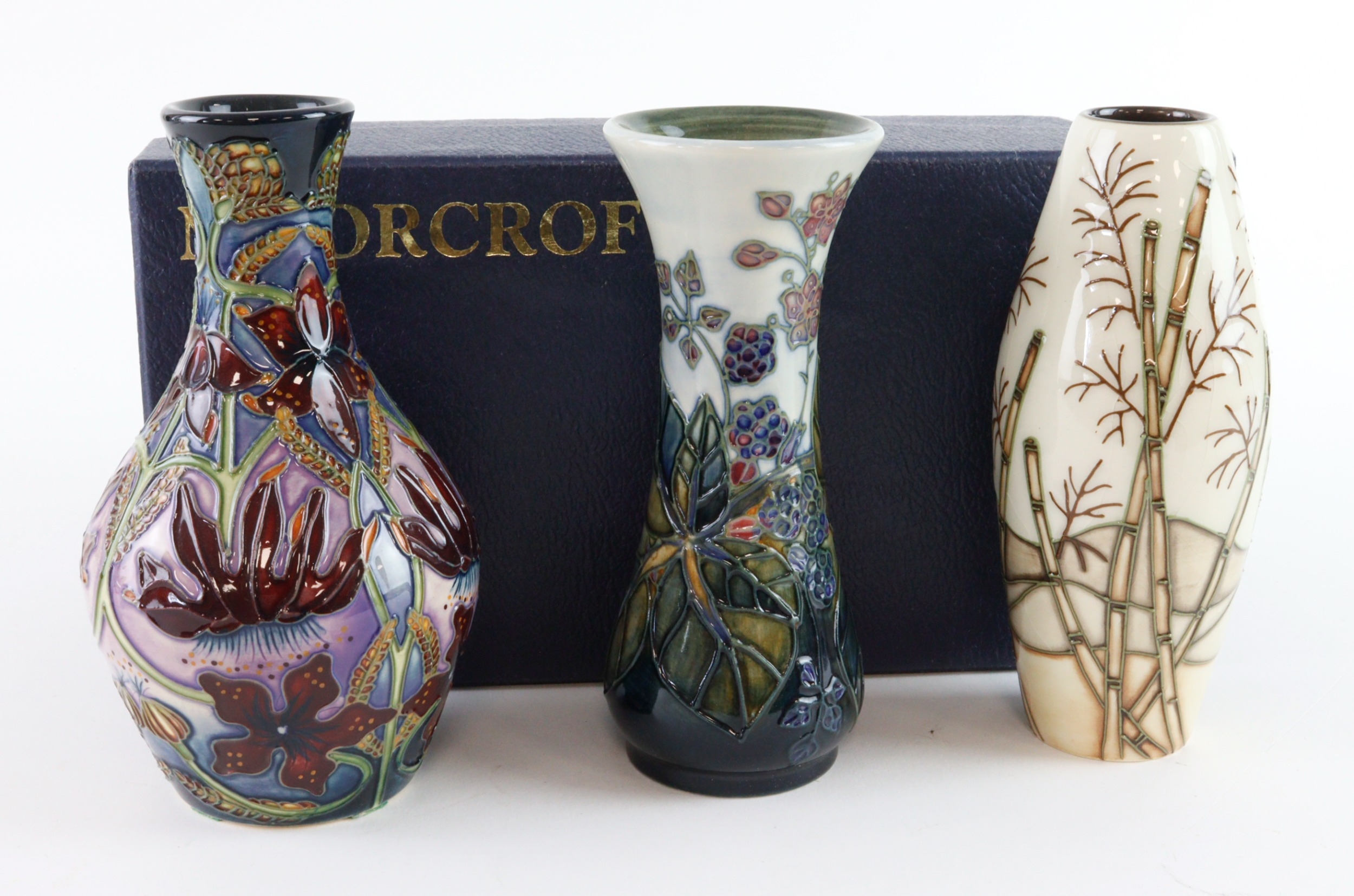 Moorcroft. Three small Moorcroft vases, various patterns, including Delonix, each with makers marks to base, tallest 13cm approx.