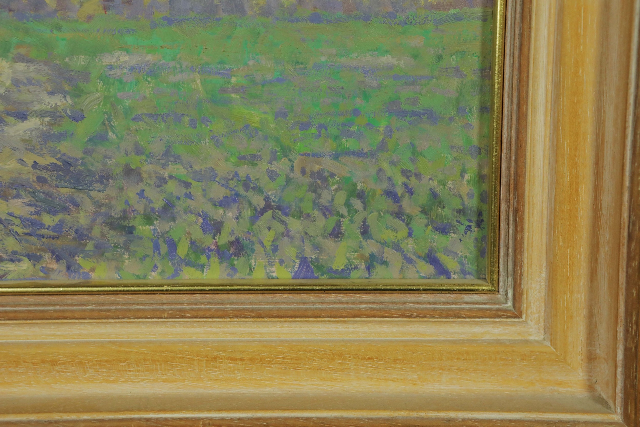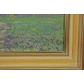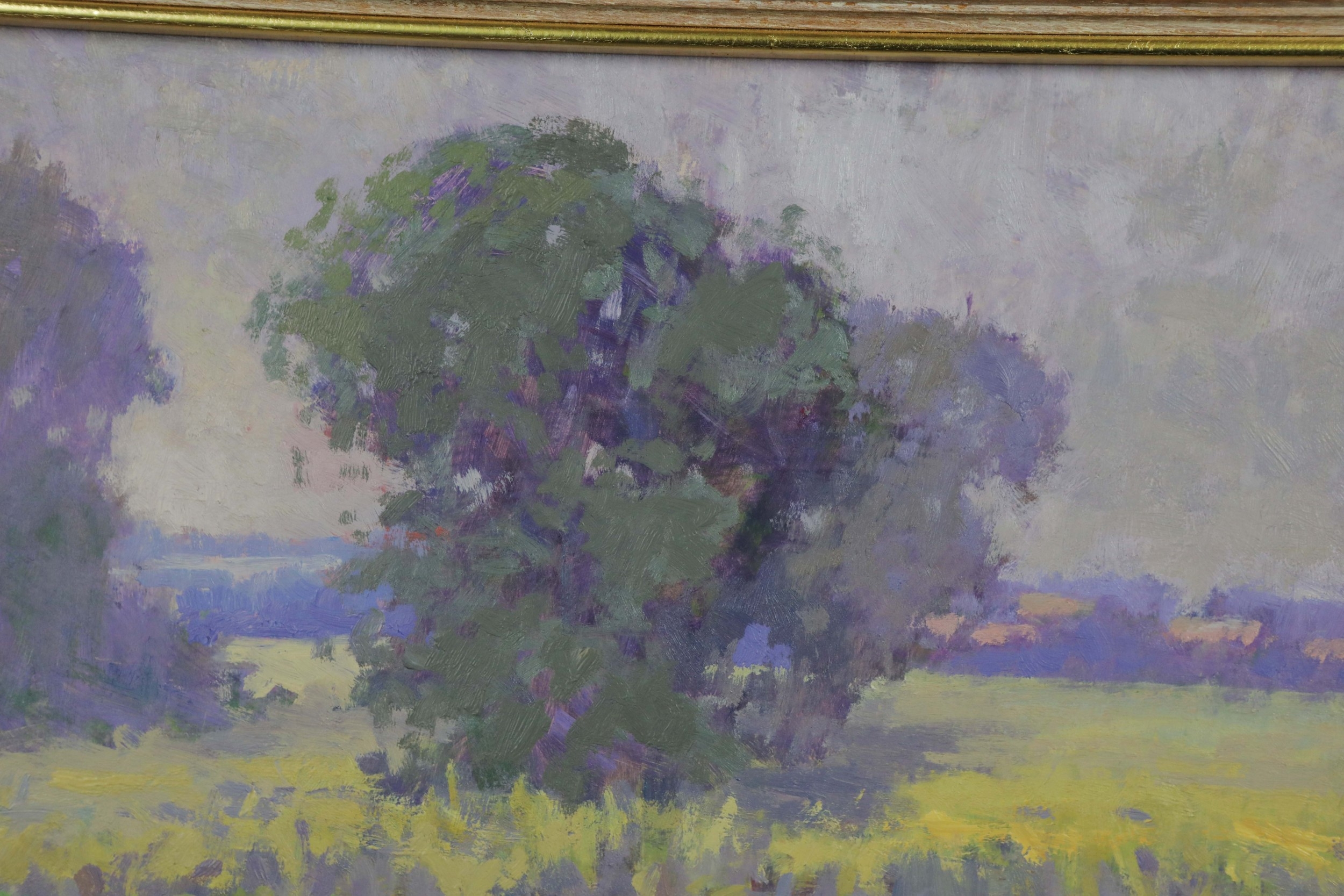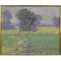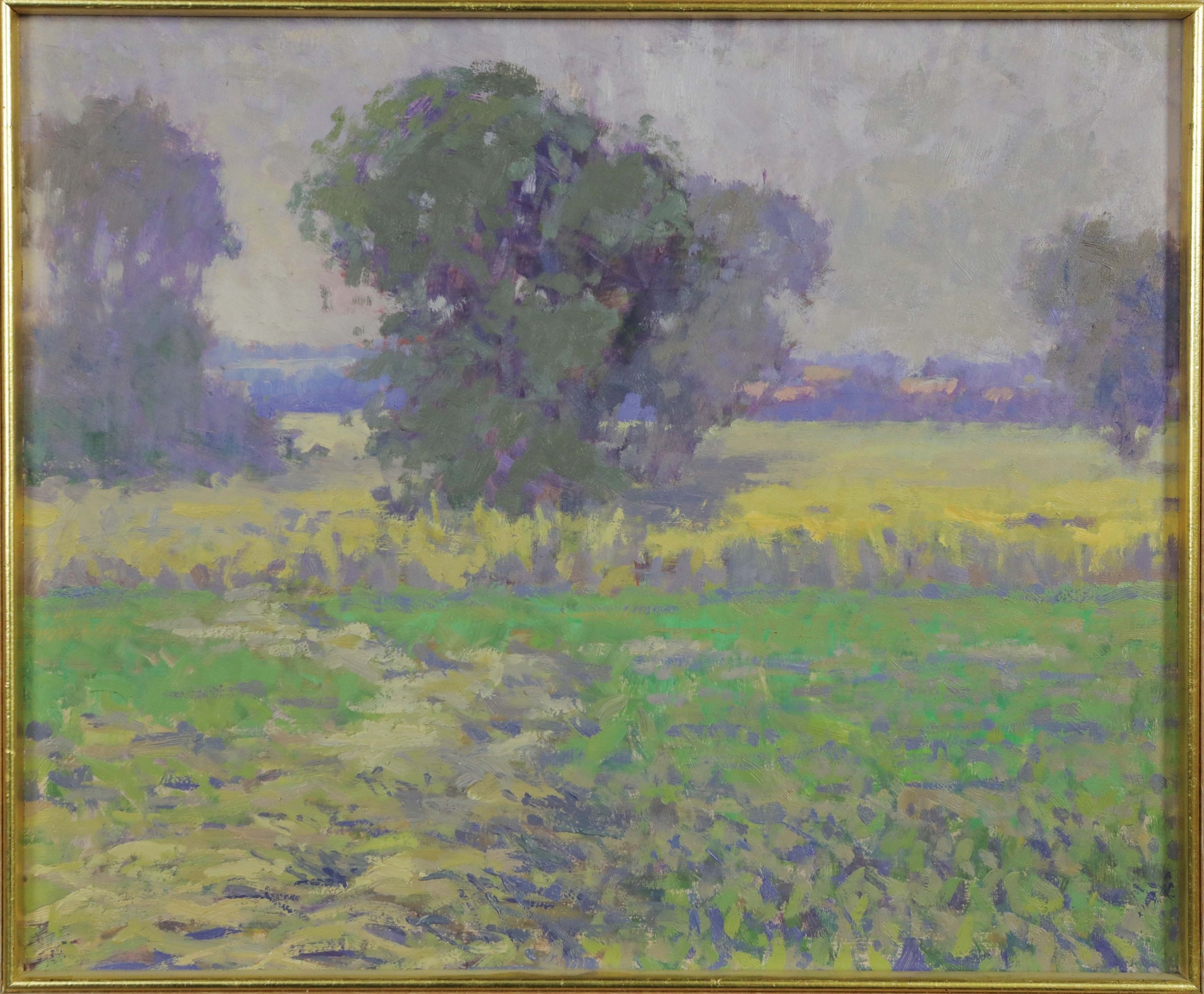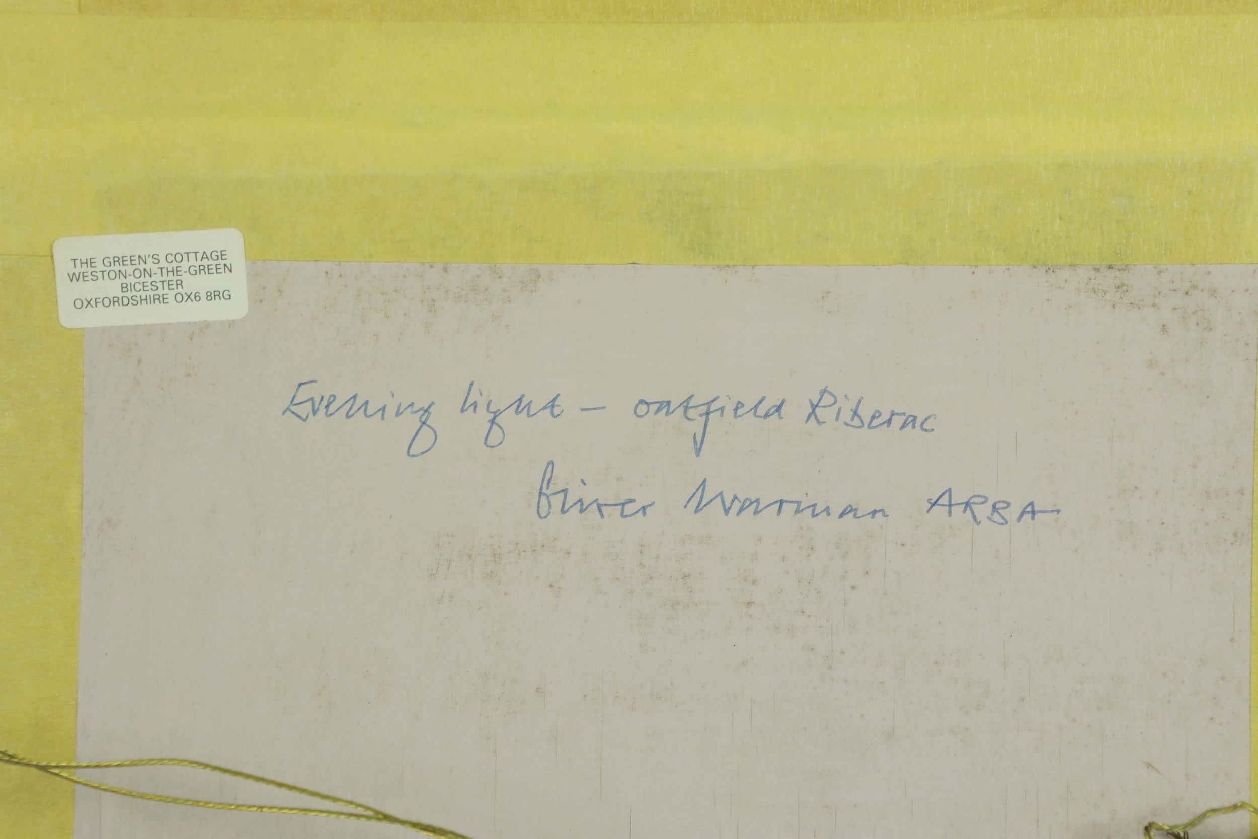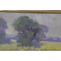 OLIVER WARMAN (1932-2017). EVENING LIGHT - OATFIELD RIBERAC. oil on board, image 24cm x 29cm, framed.