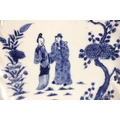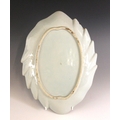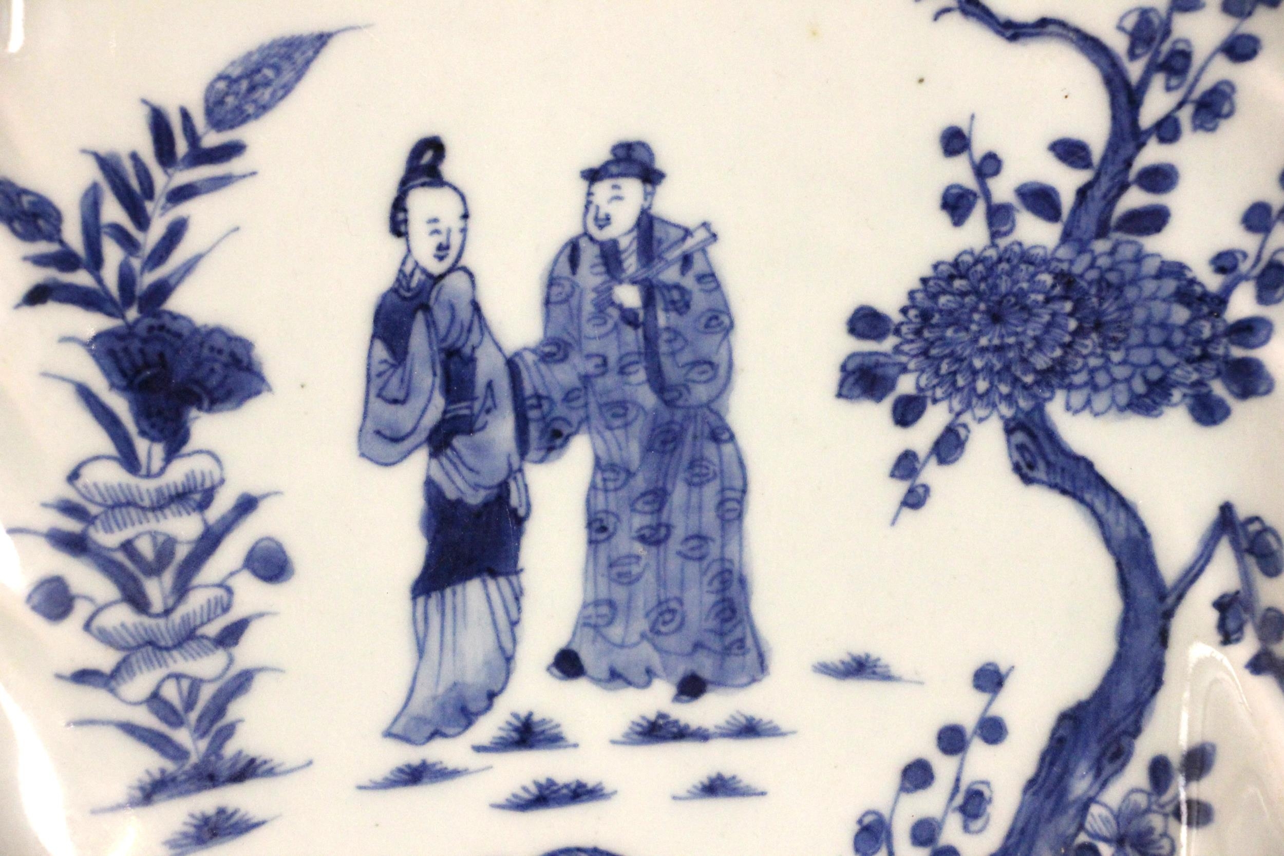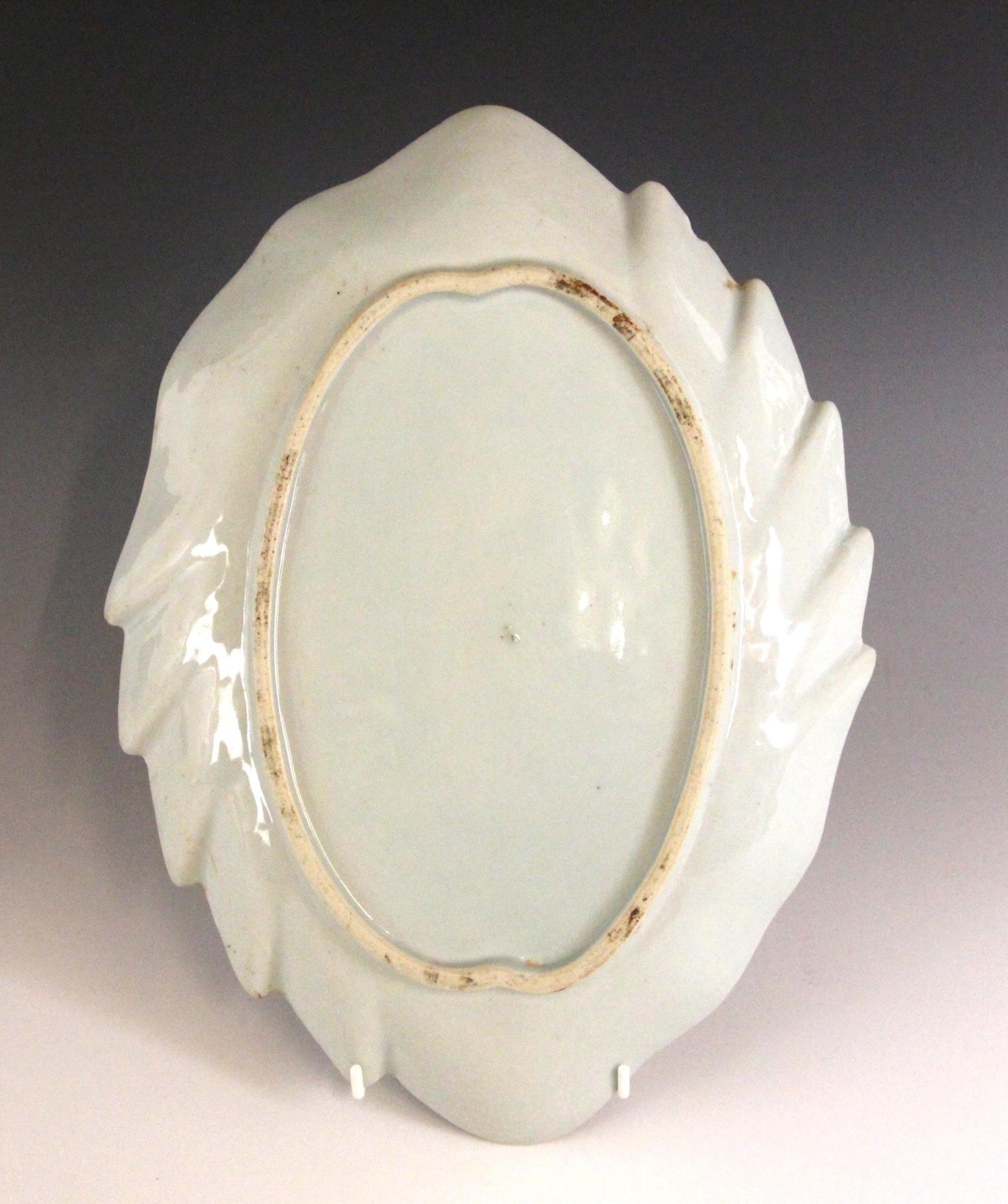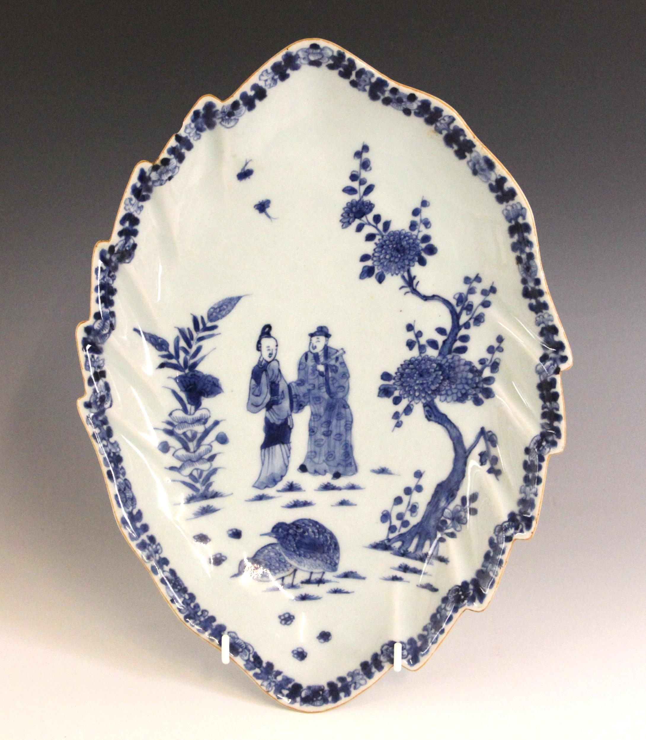 A Chinese export porcelain blue and white 'leaf' dish, 18th century, the leaf shaped shallow dish centrally decorated with two figures and two quail in a garden, 31.5cm long