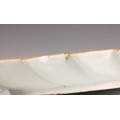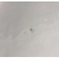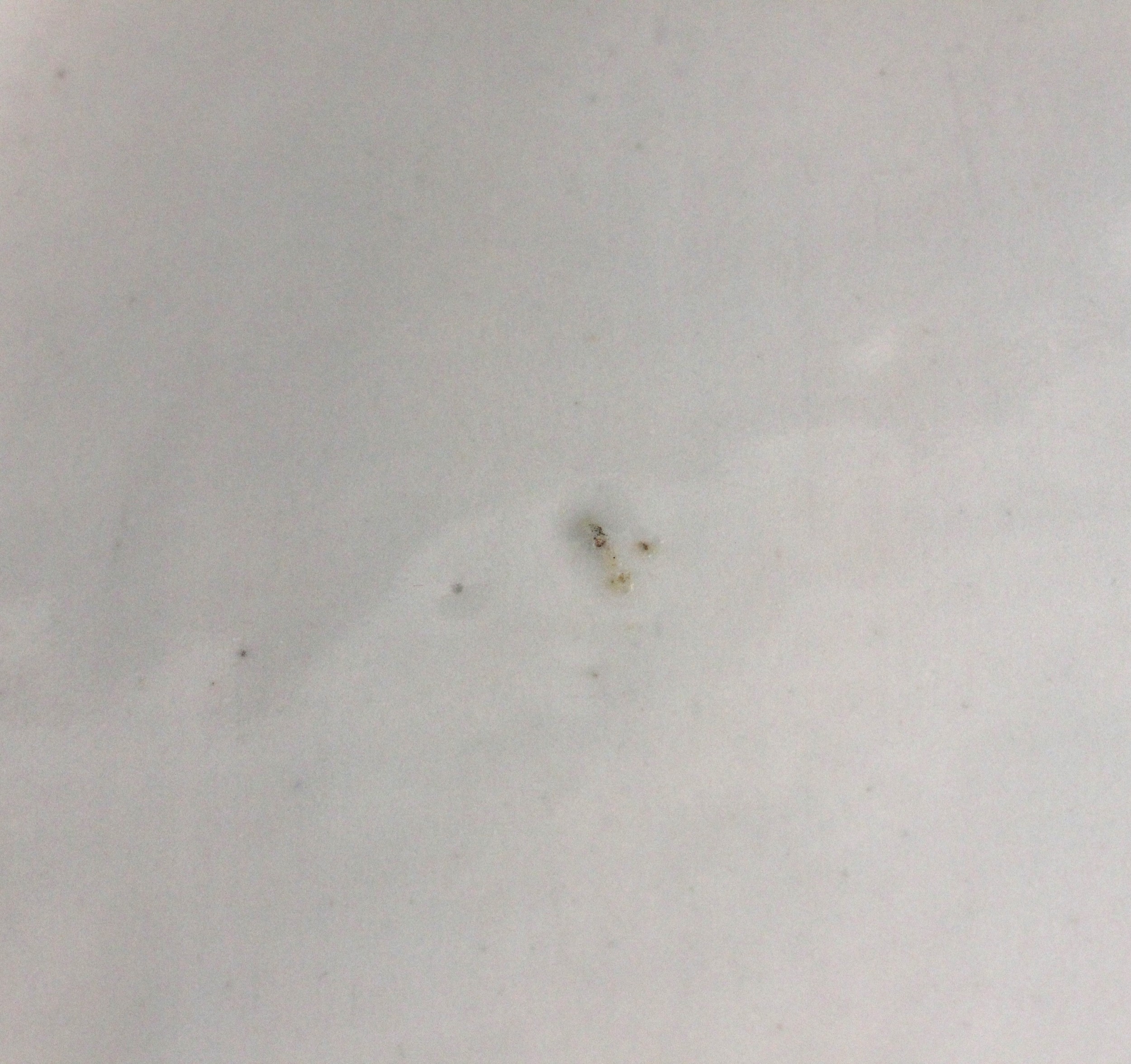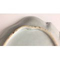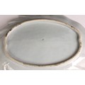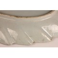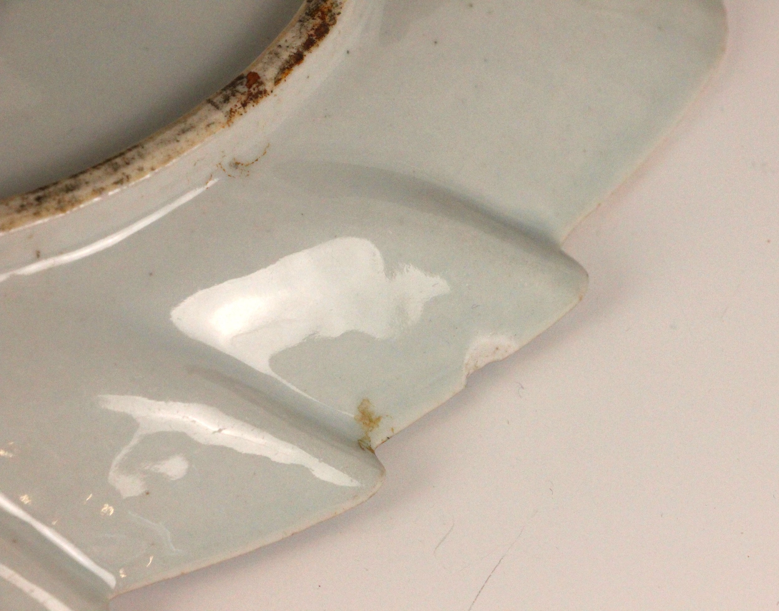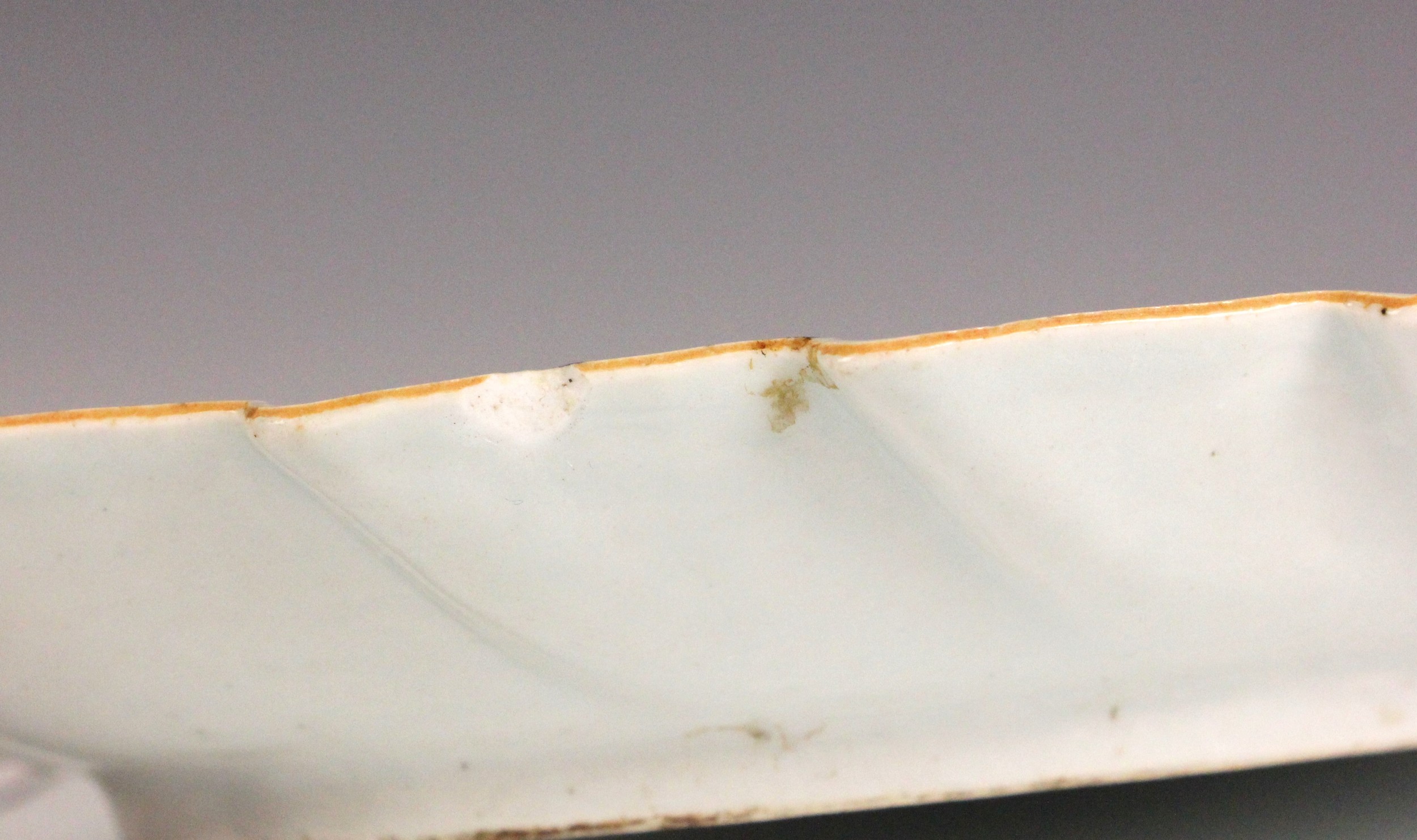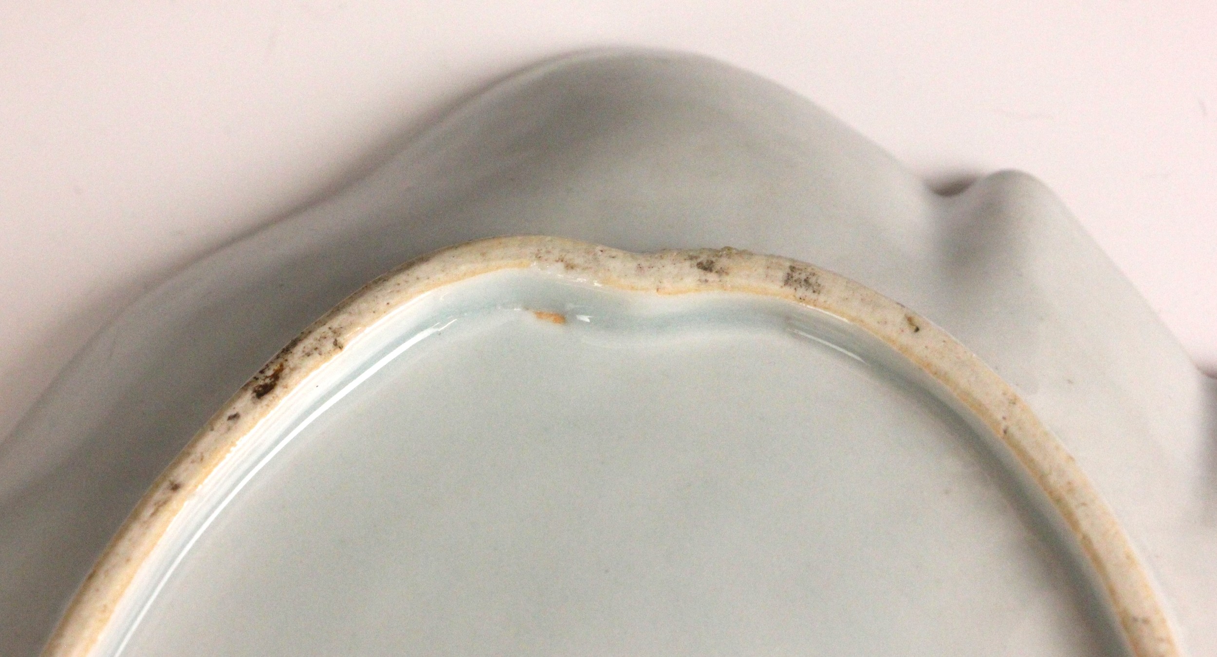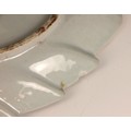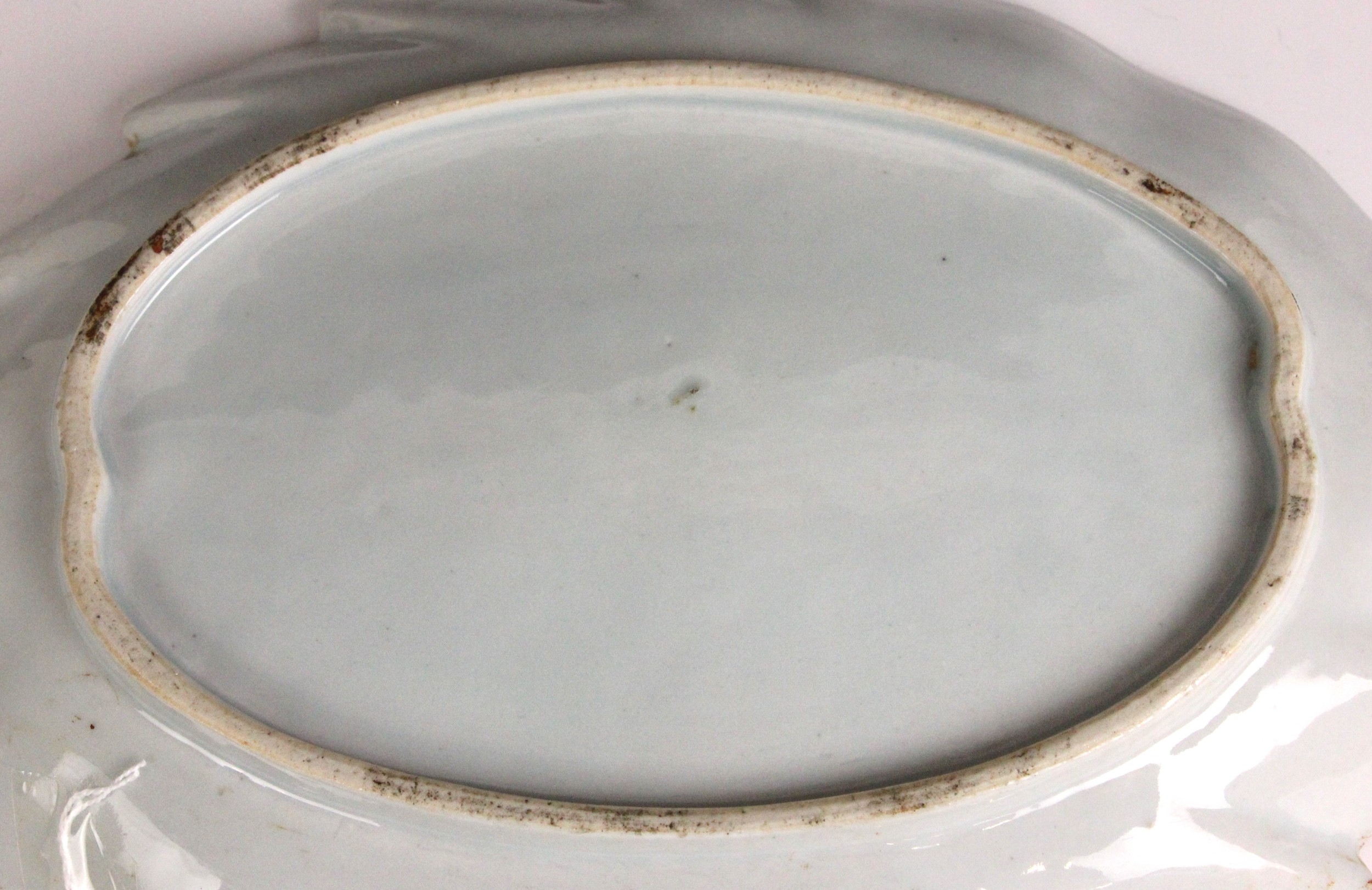 The dish shows a chip to the rim approximately 11mm wide, with small stains, pits and frits, and small glazing faults to the underside. The well shows minor surface wear, but no cracks, crazing or evidence of restoration.