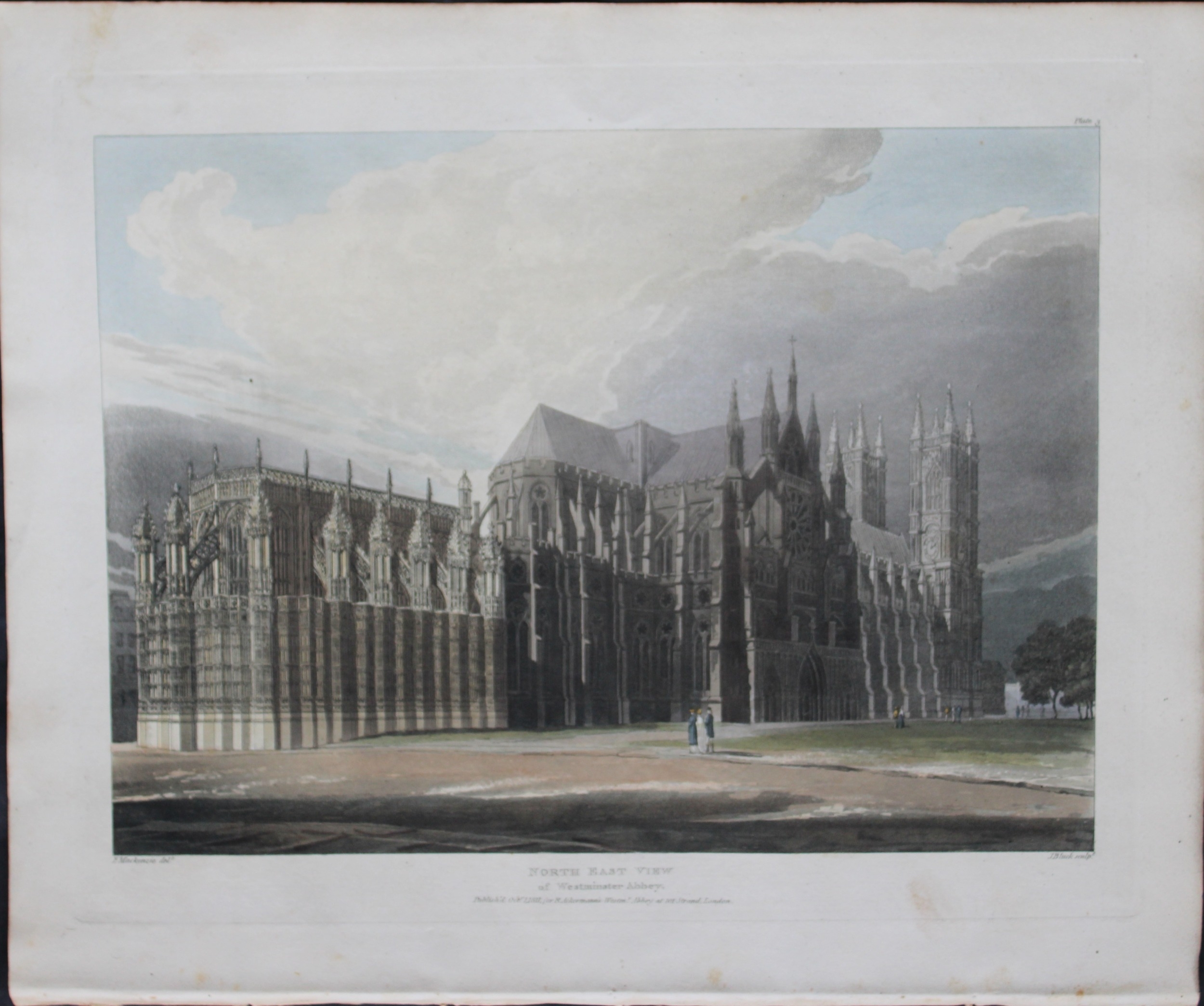 A Pugin - North East View of Westminster Abbey engraved by J Bluck 1812. This aquatint print is from The History of the Abbey Church of St. Peter's Westminster, Its Antiquities and Monuments by Rudolph Ackermann and William Combe, published in London 1812.