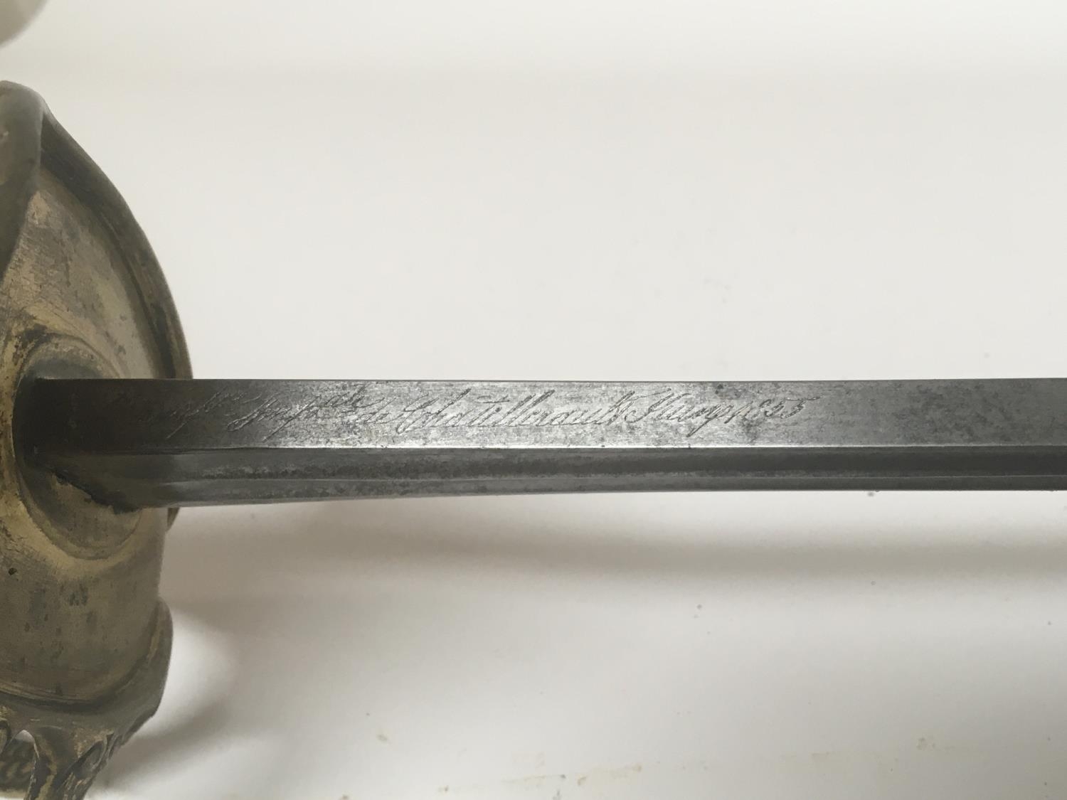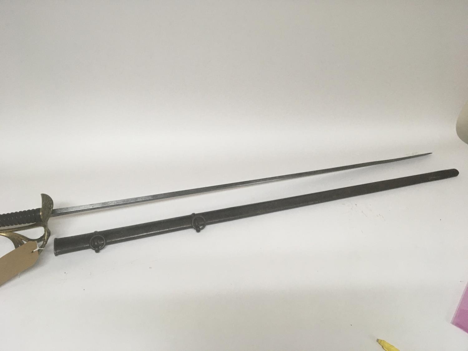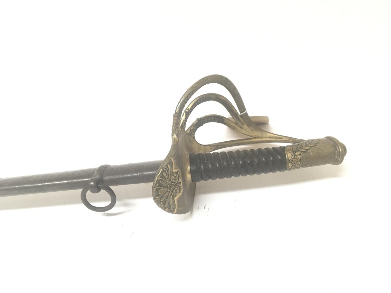 A French 1855 pattern cavalry sword with a patterned gilt brass Guard steel blade with inscriptions wooden grip. Steel scabbard. Length 113cm