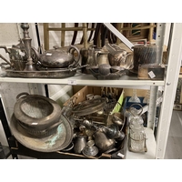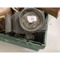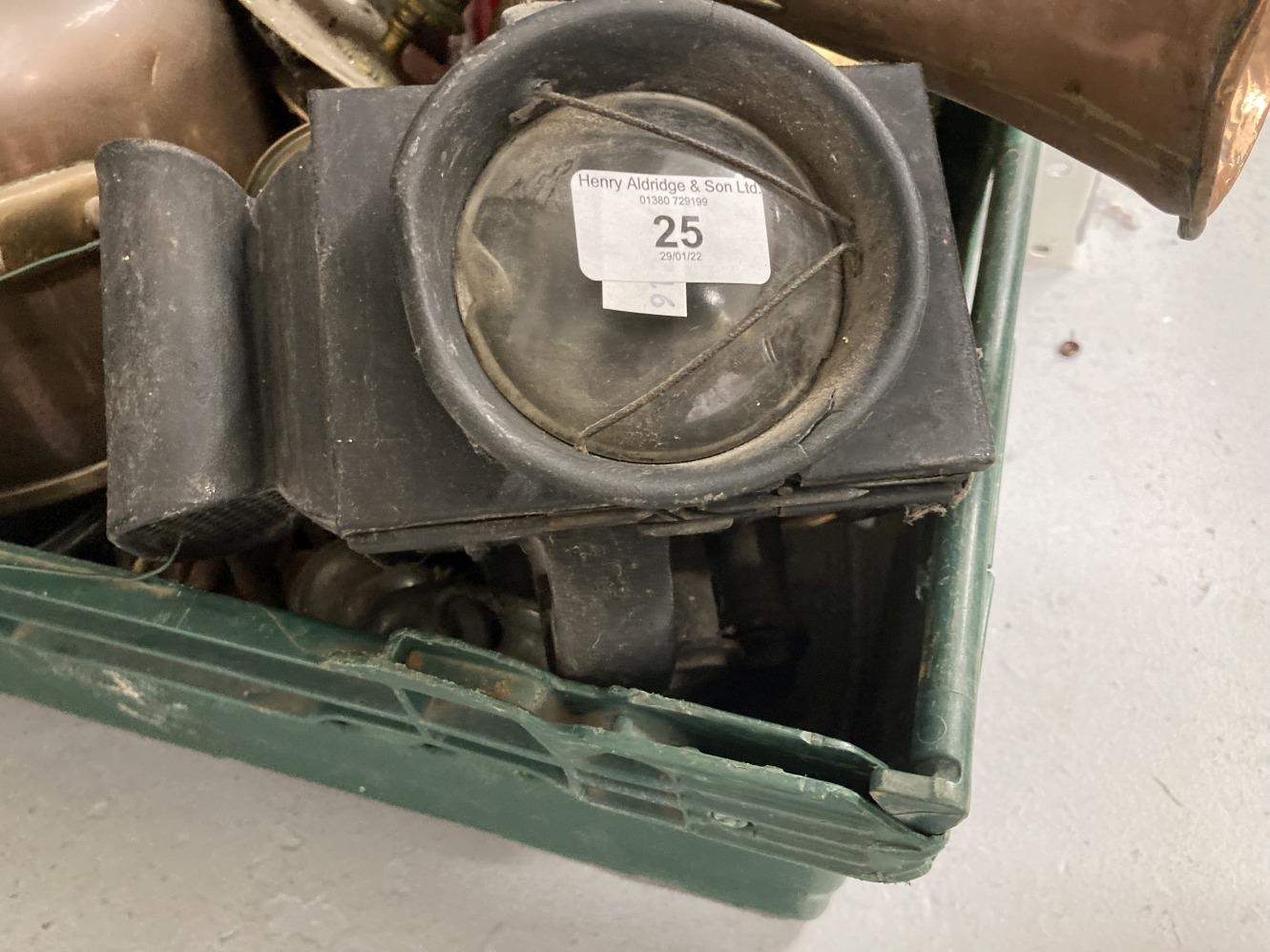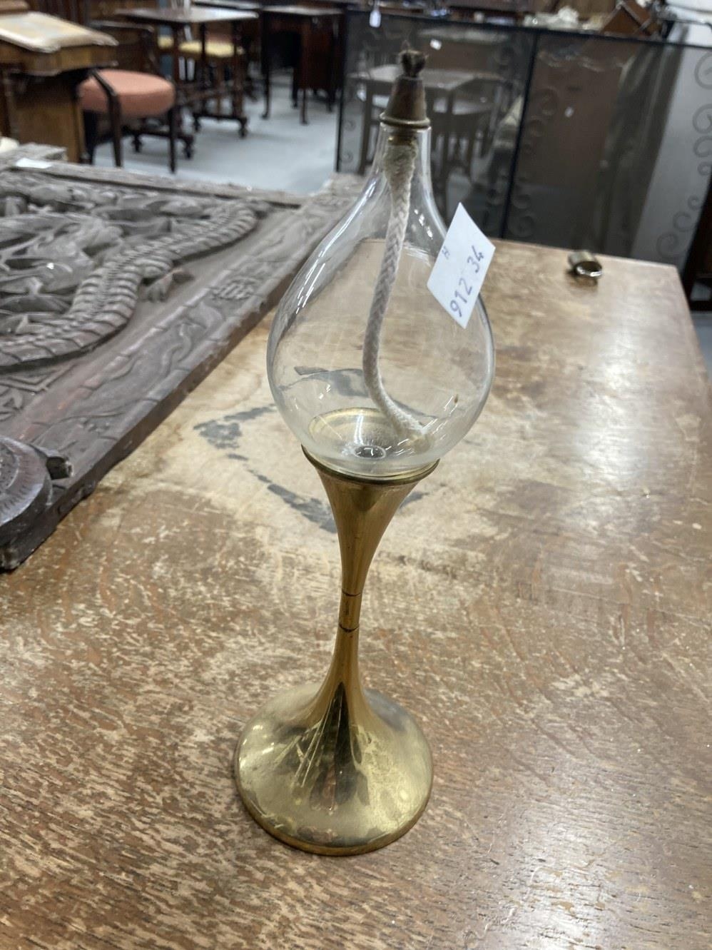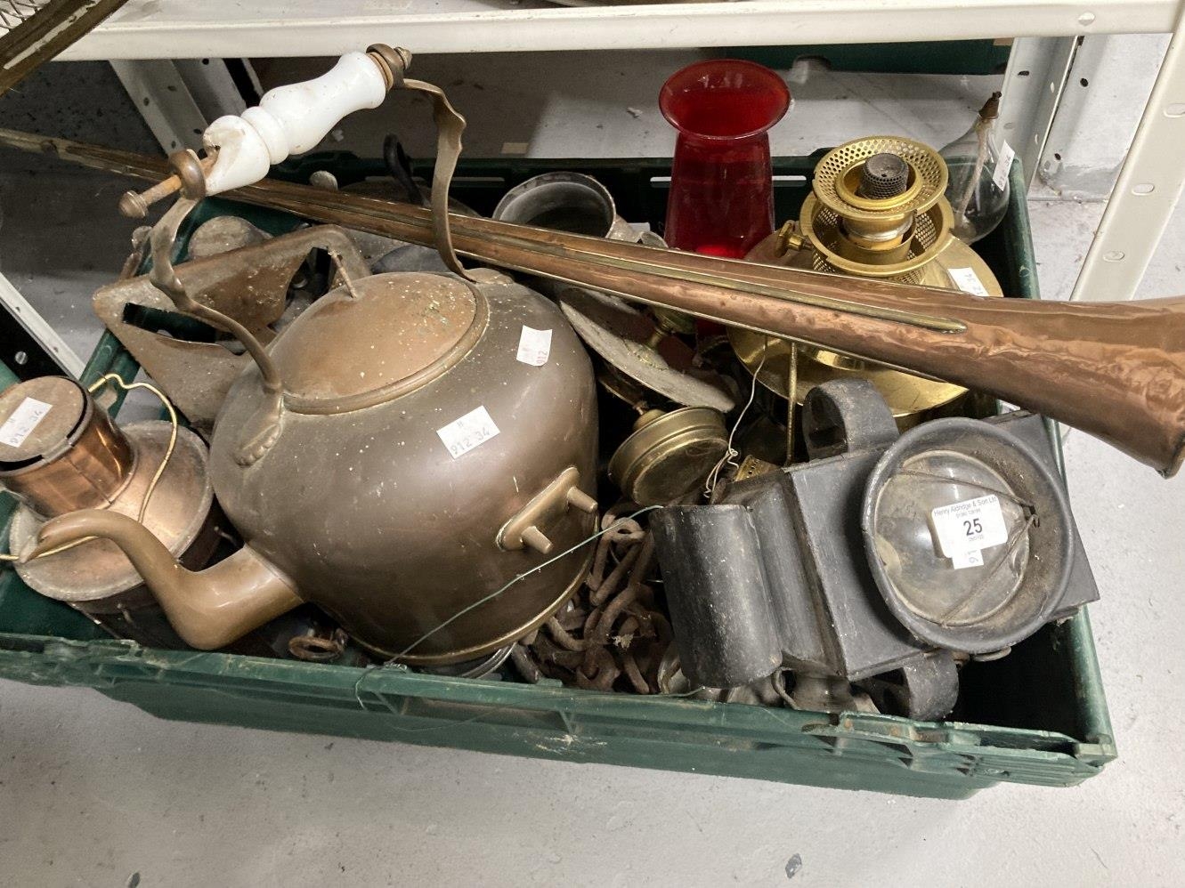 Metalware: Brass and pewter assorted lamps includes a Freddie Anderson clear drop, and an early 20th cent. Raydyot carriage lamp plus copper kettle and pewter measuring jugs.