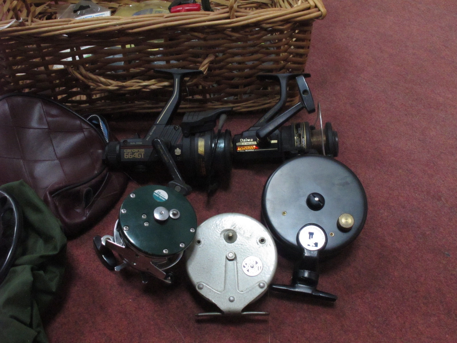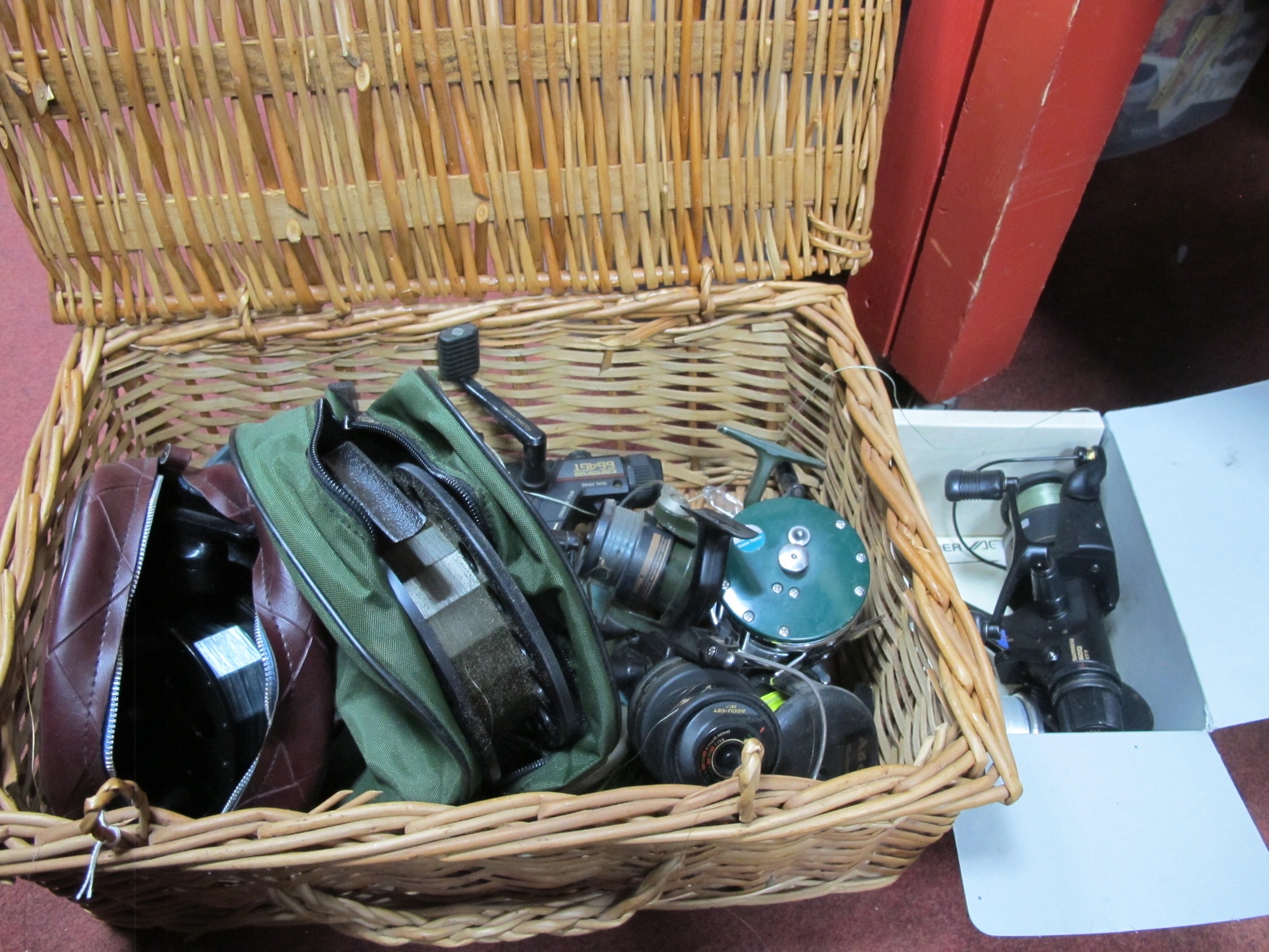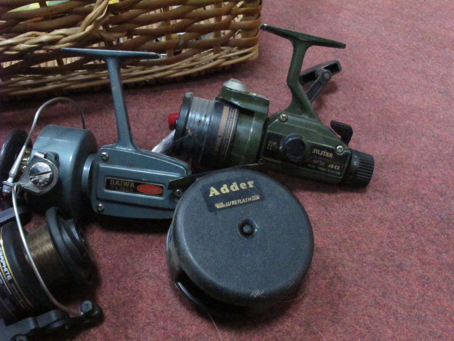 Fishing Reels - Daiwa, Silstar, Adder, Abu, Strike Right, The Leeds reel, Lewtham, Shimano 6Q10 etc in wicker case.