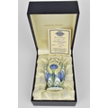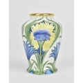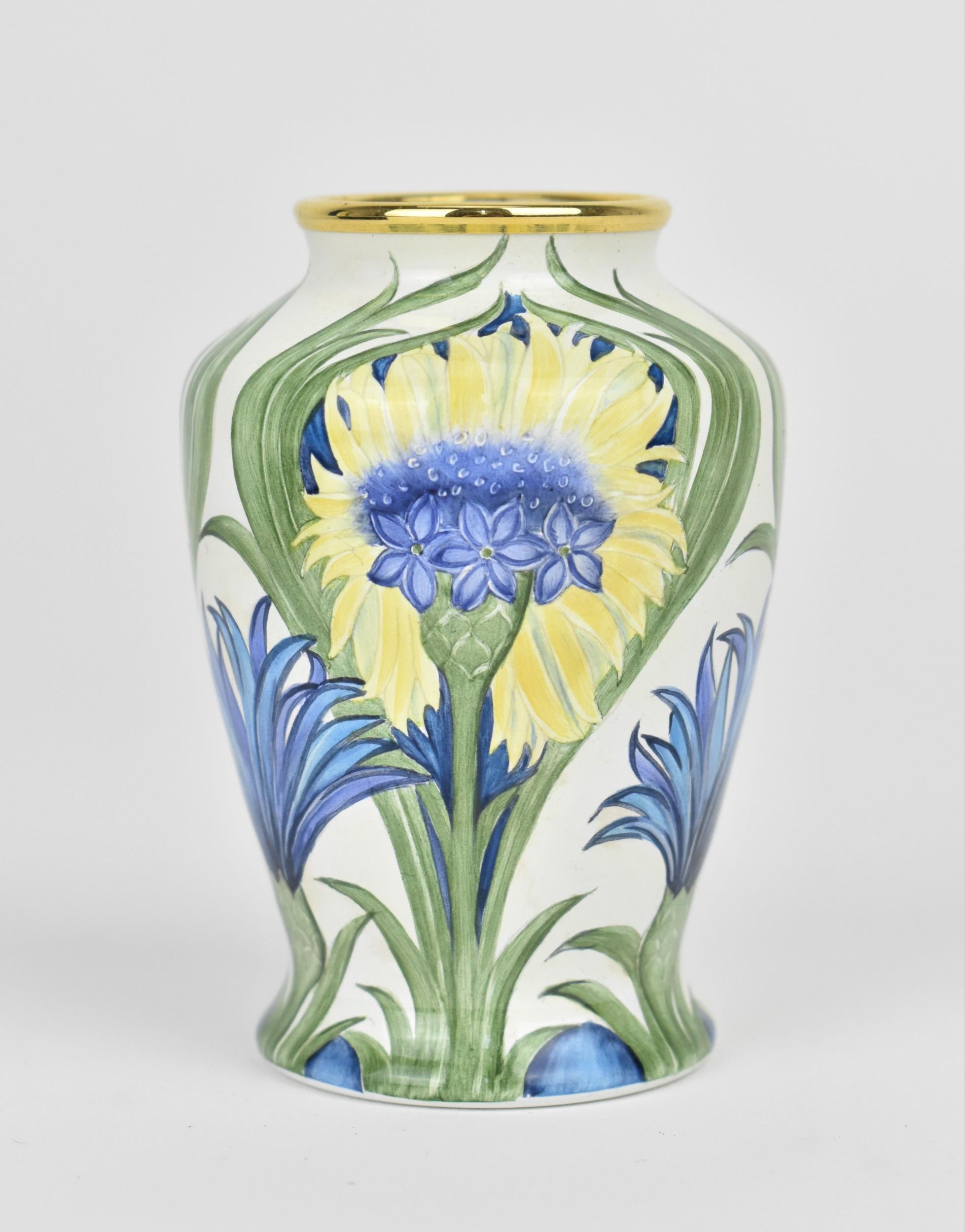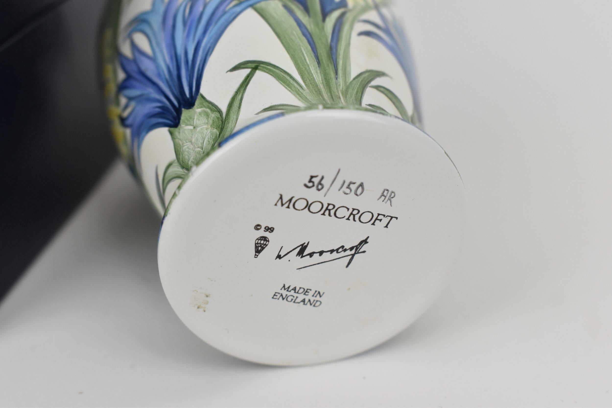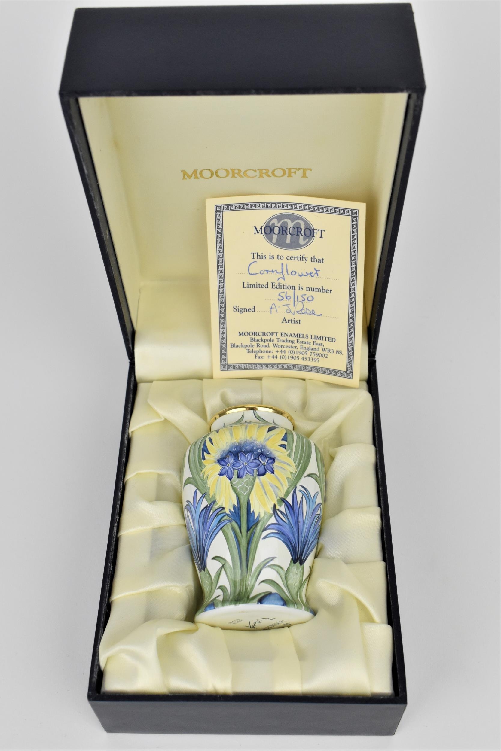 A limited edition Moorcroft Enamels Ltd miniature vase in the cornflower pattern, florian ware style, signed by the painter 'A.R', no. 56/150, in original fitted box with certificate, 8 cm high