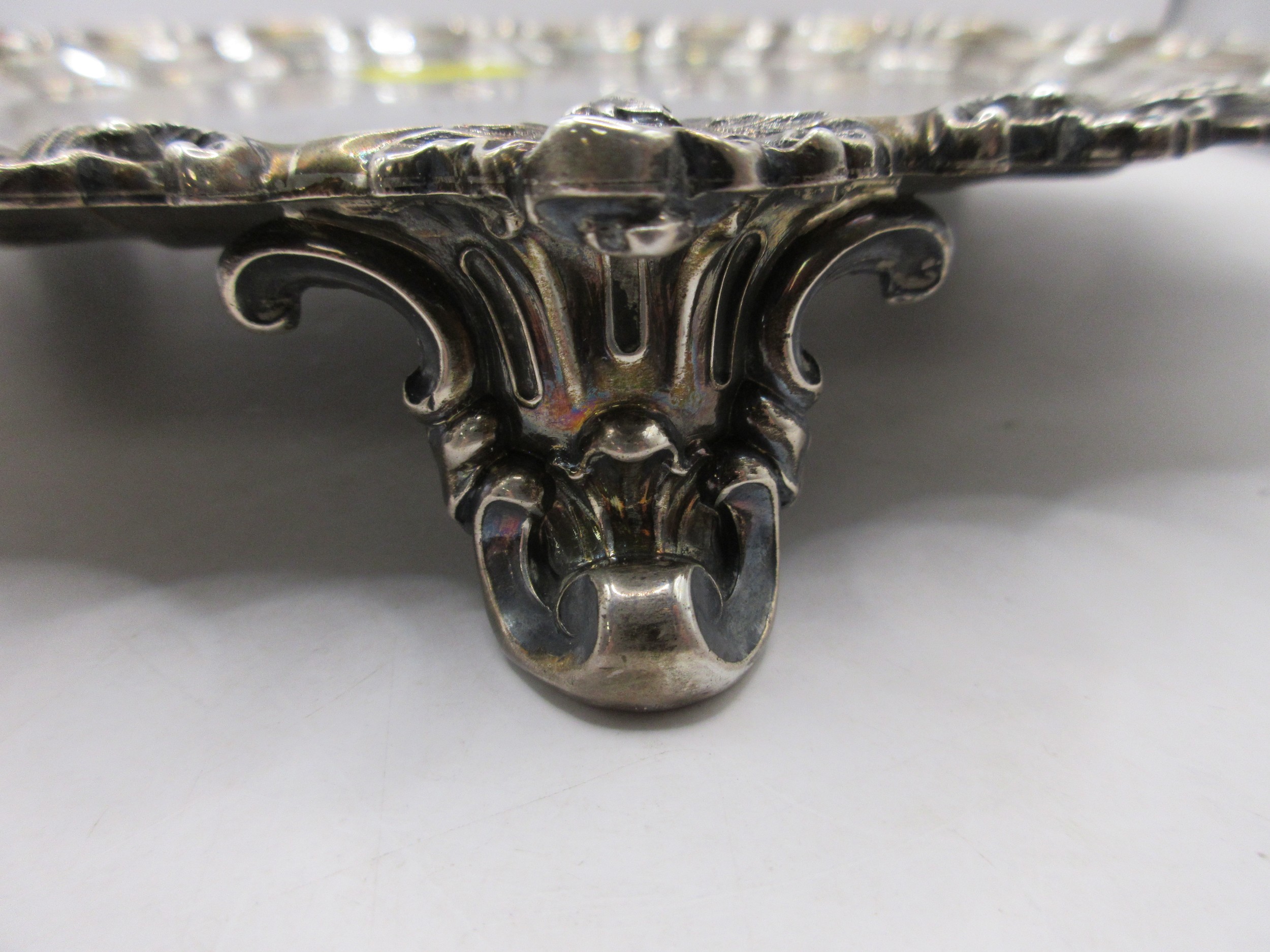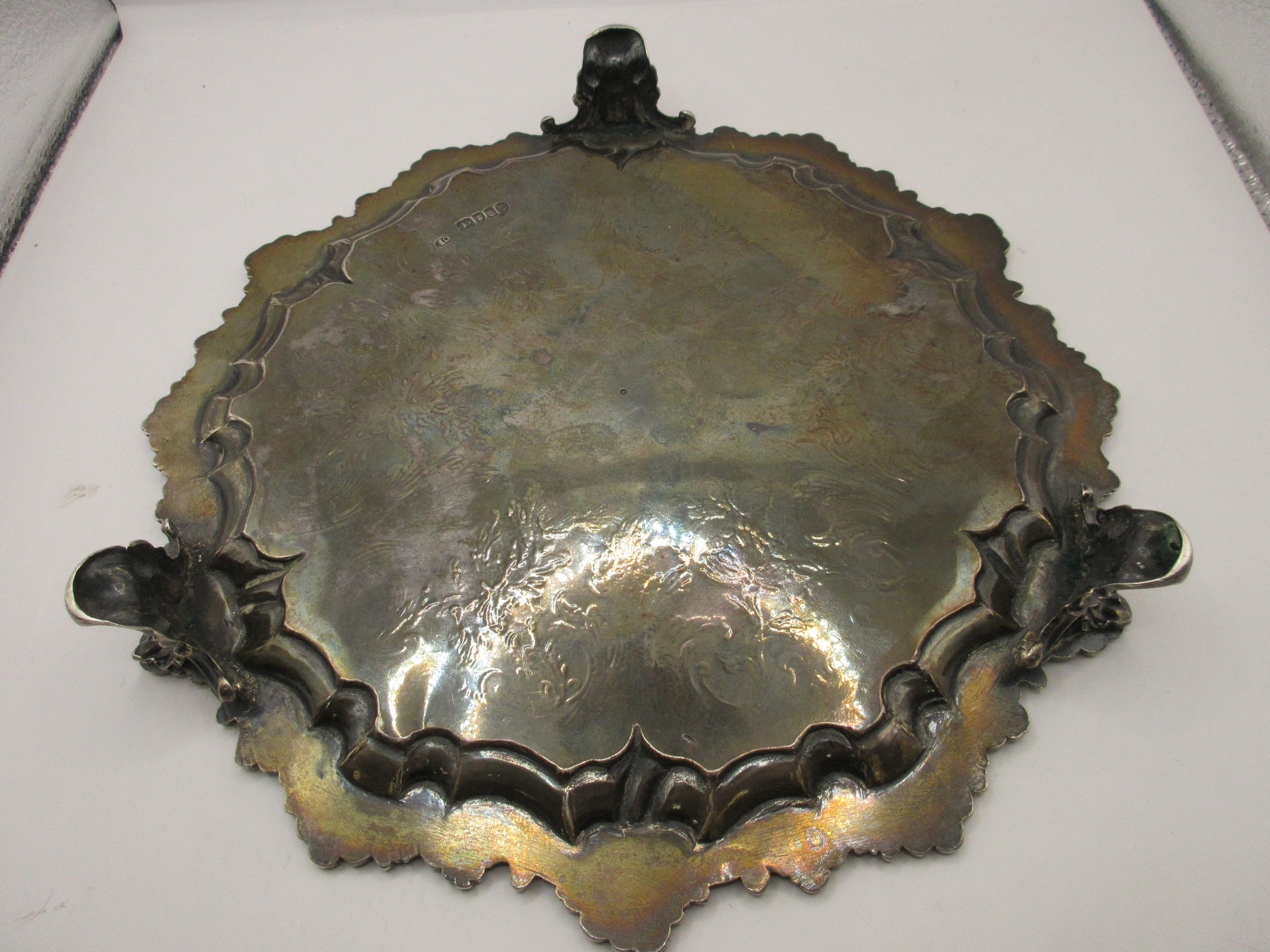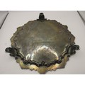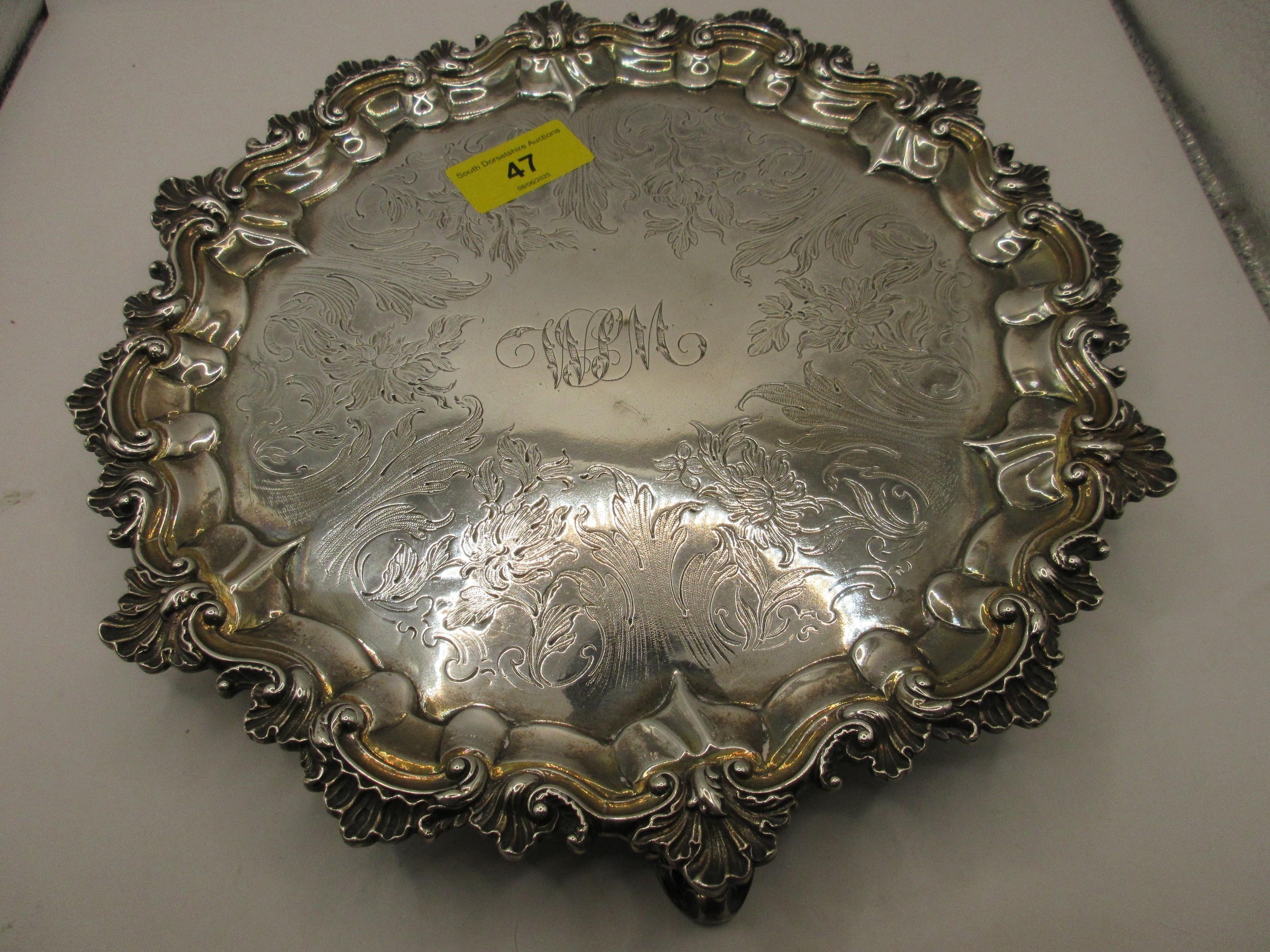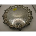 A substantial circular sterling silver salver on scrolled feet with scrolled acanthus rim, script initials to centre, in good order, hallmarked for London 1854 by Charles Fox, approx weight 600g