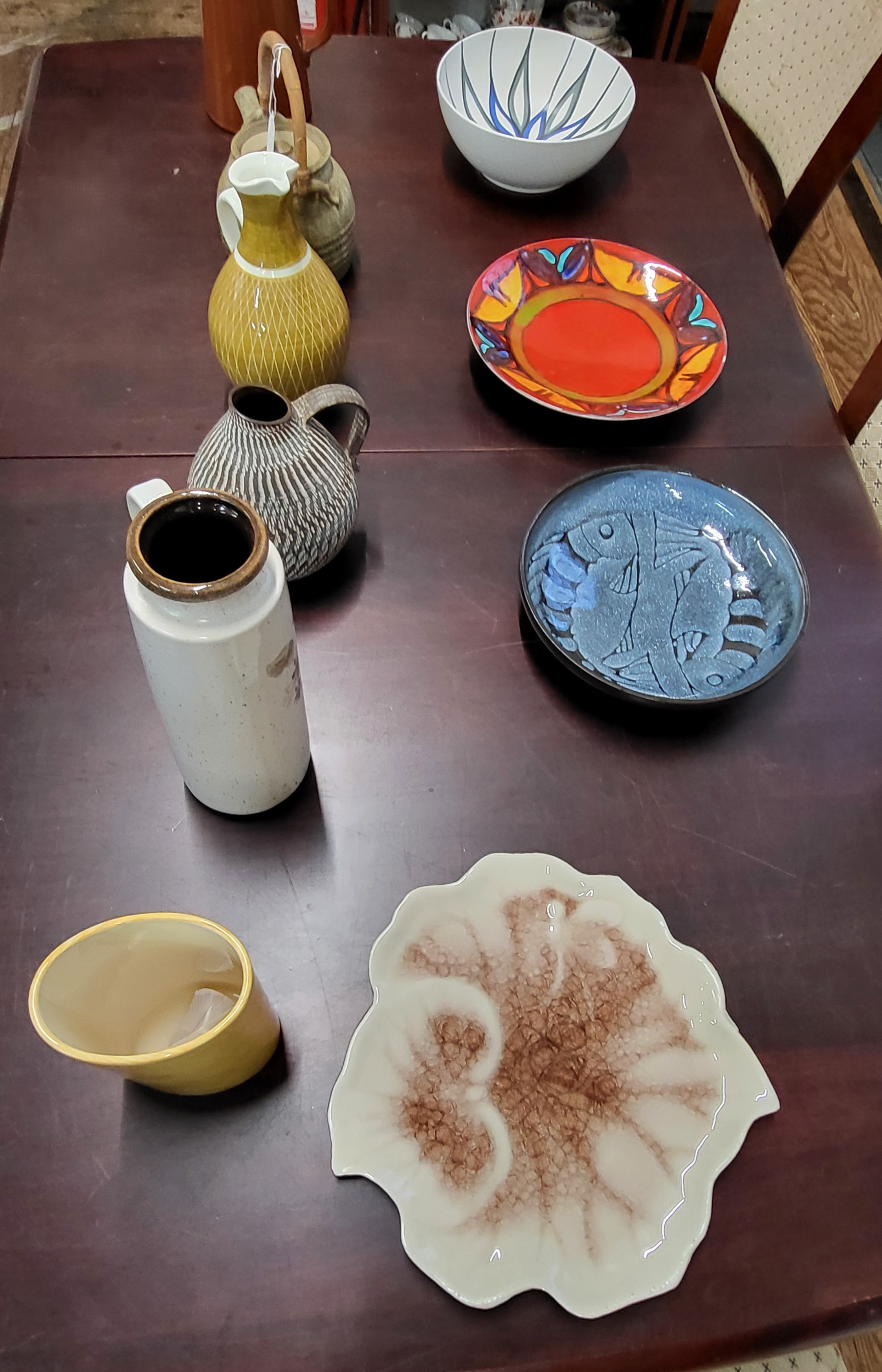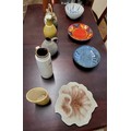 A Poole Delphis bowl 26.5cm diameter, Poole Fresco vase by Rachel Barker 18.5cm, German Dee-Cee 236/18 jug 16.5cm, West German Scheurich 401-28 28cm, Lovatt's lidded jug 25cm, and five pieces of Studio pottery. (10)