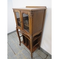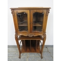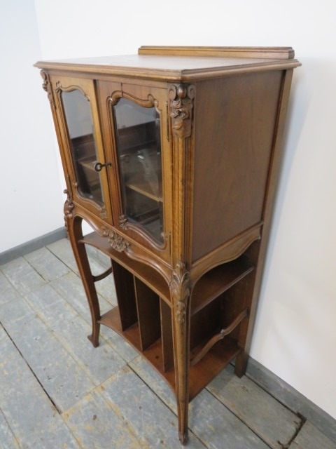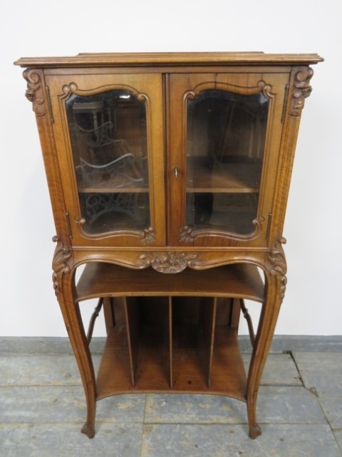 An early 20th Century French walnut music cabinet with glazed cupboard doors, raised on slender cabriole supports with scroll feet. 109 x 55 x 36cms (approx)