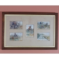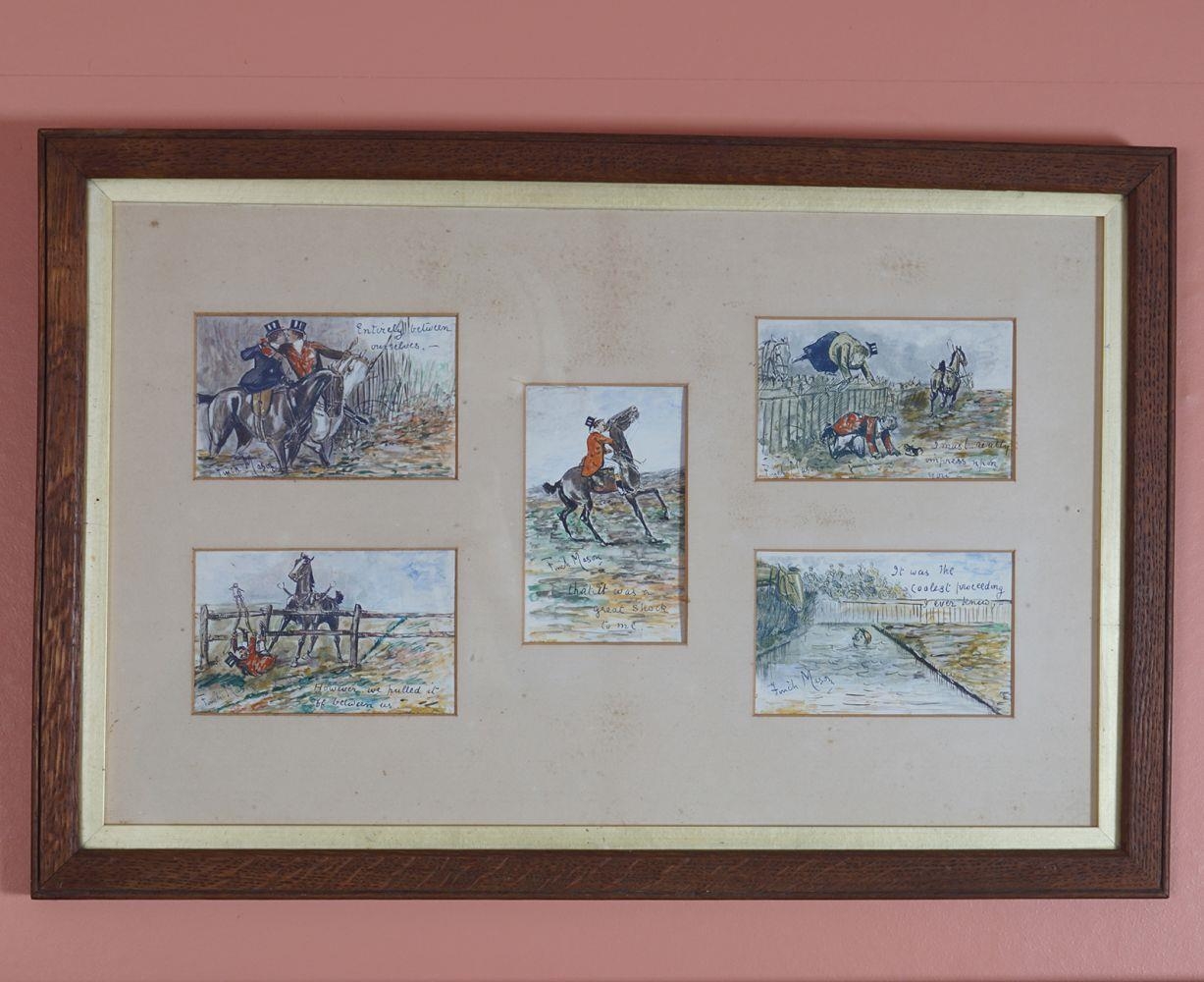 Collage of 5 equestrian caricatures, each a watercolour. Signed. Framed as one. 14 x 8.5 cm. (5)