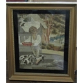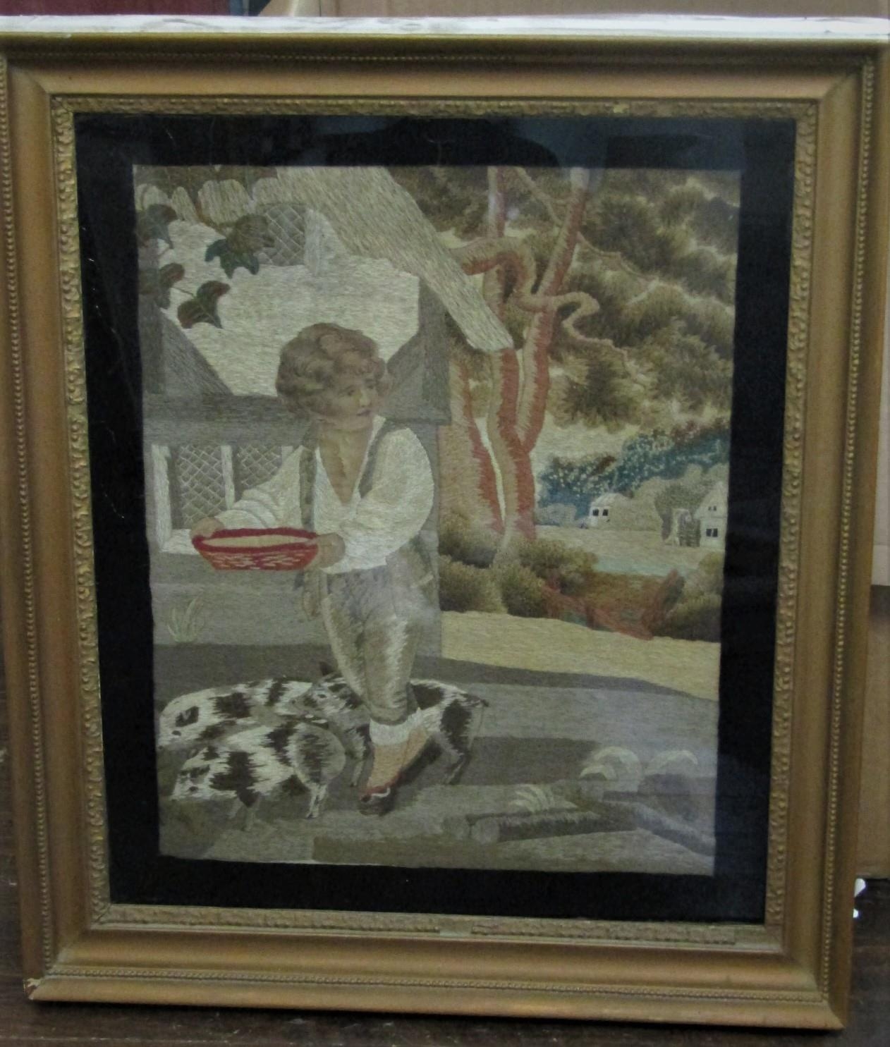 An early 19th century needlework picture of a boy feeding piglets, 42 x 33cm approx, in gilt frame