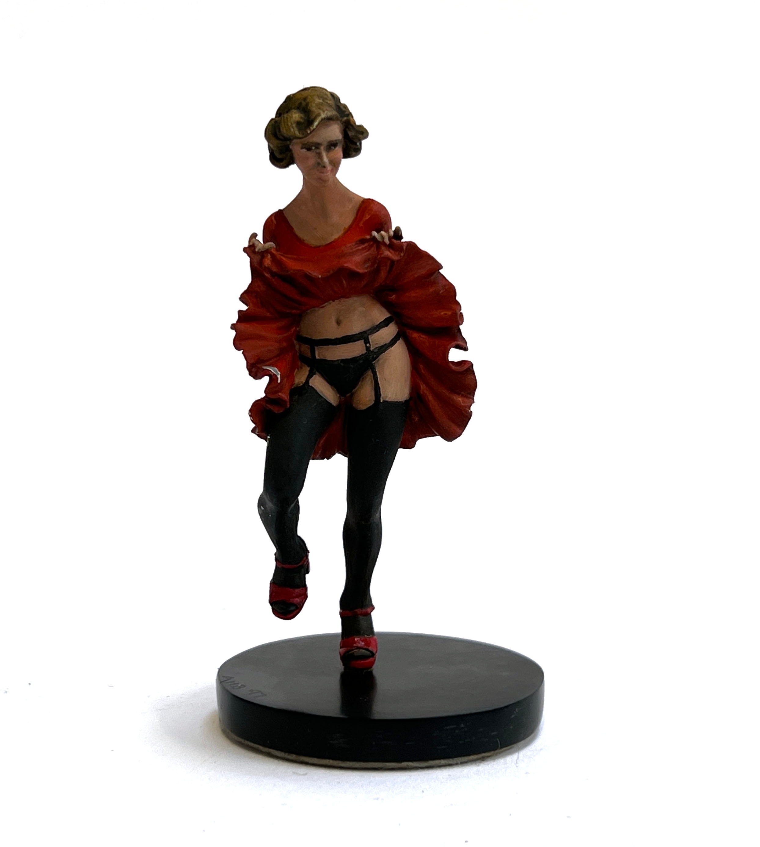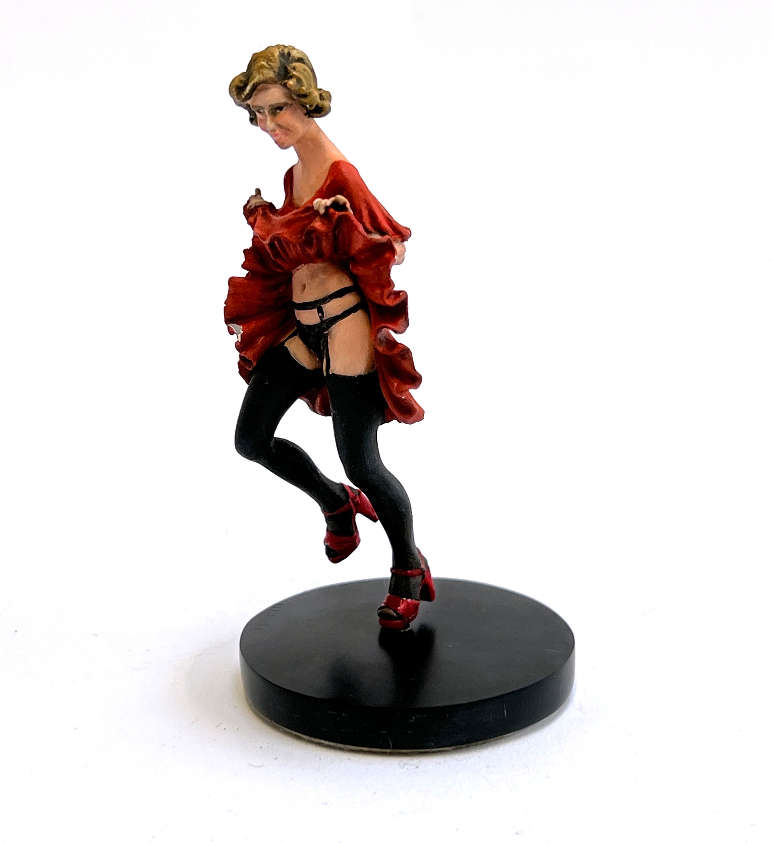 A painted cast metal figurine of a burlesque dancer, the base signed AHB 97, 9cmH