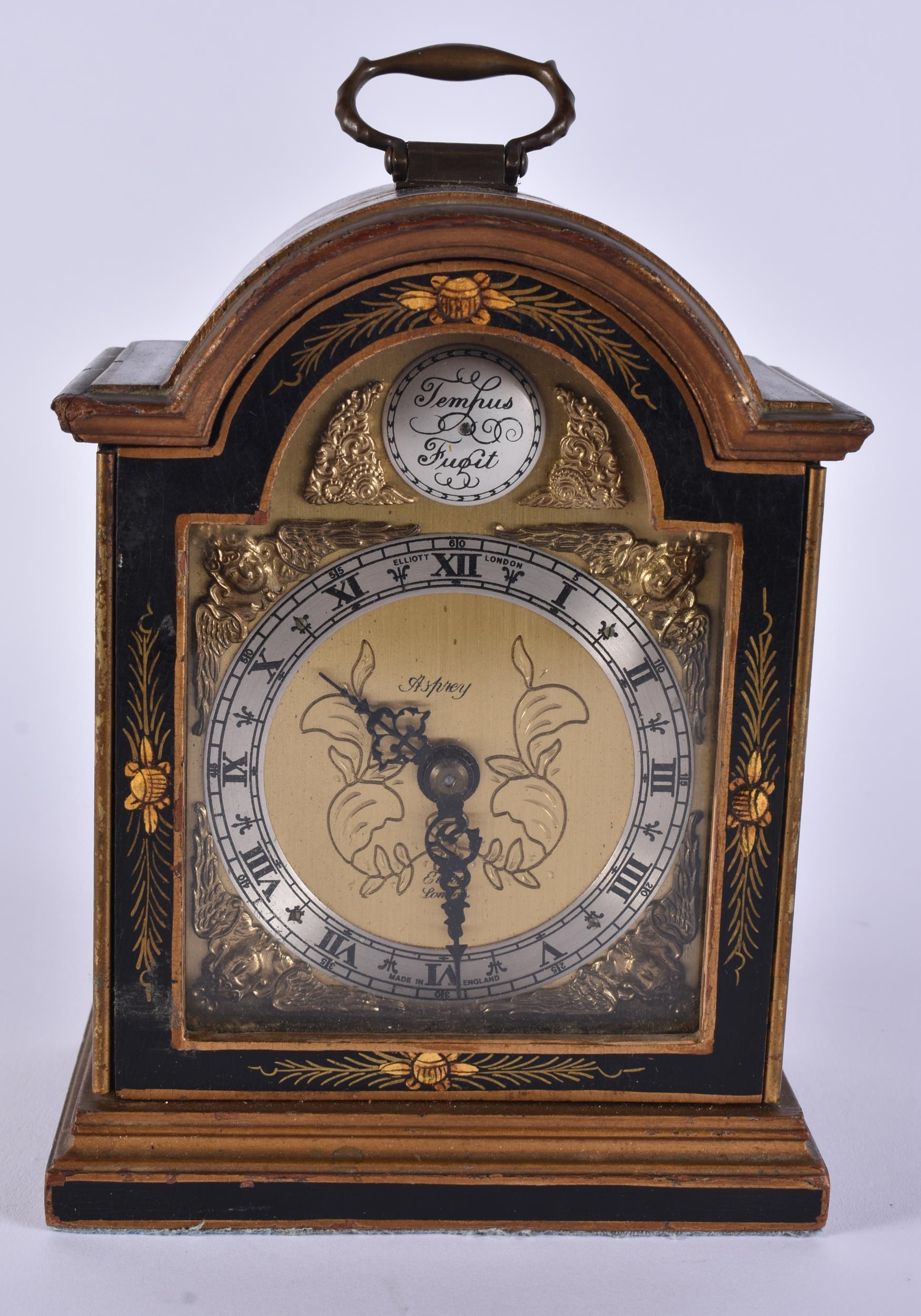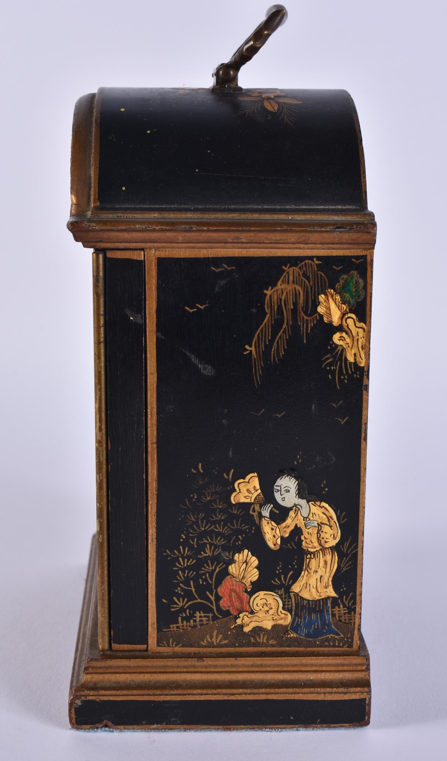 AN ASPREY ELLIOTT OF LONDON CHINOISERIE CLOCK. 23 cm high inc handle.