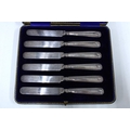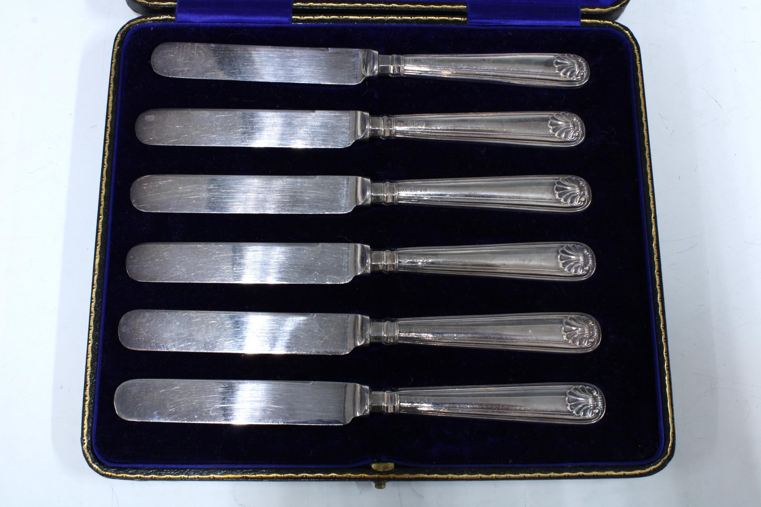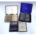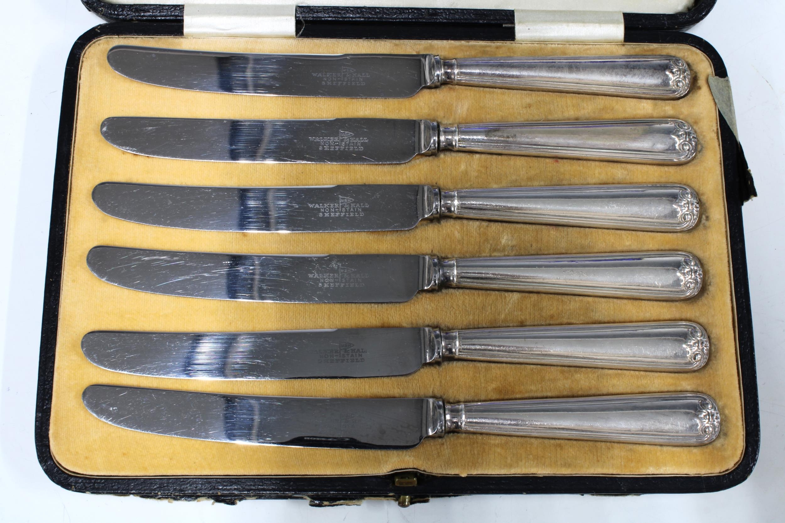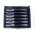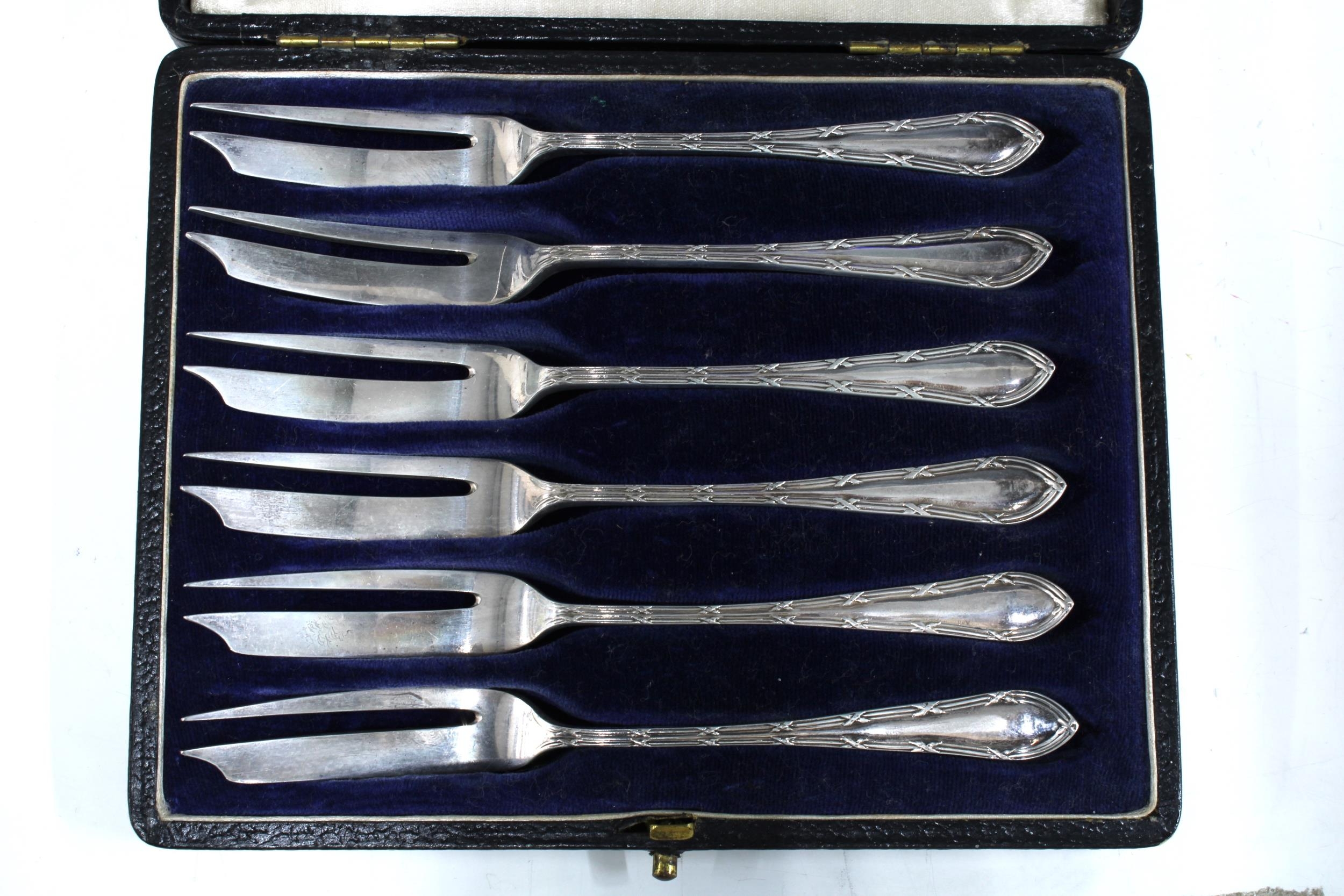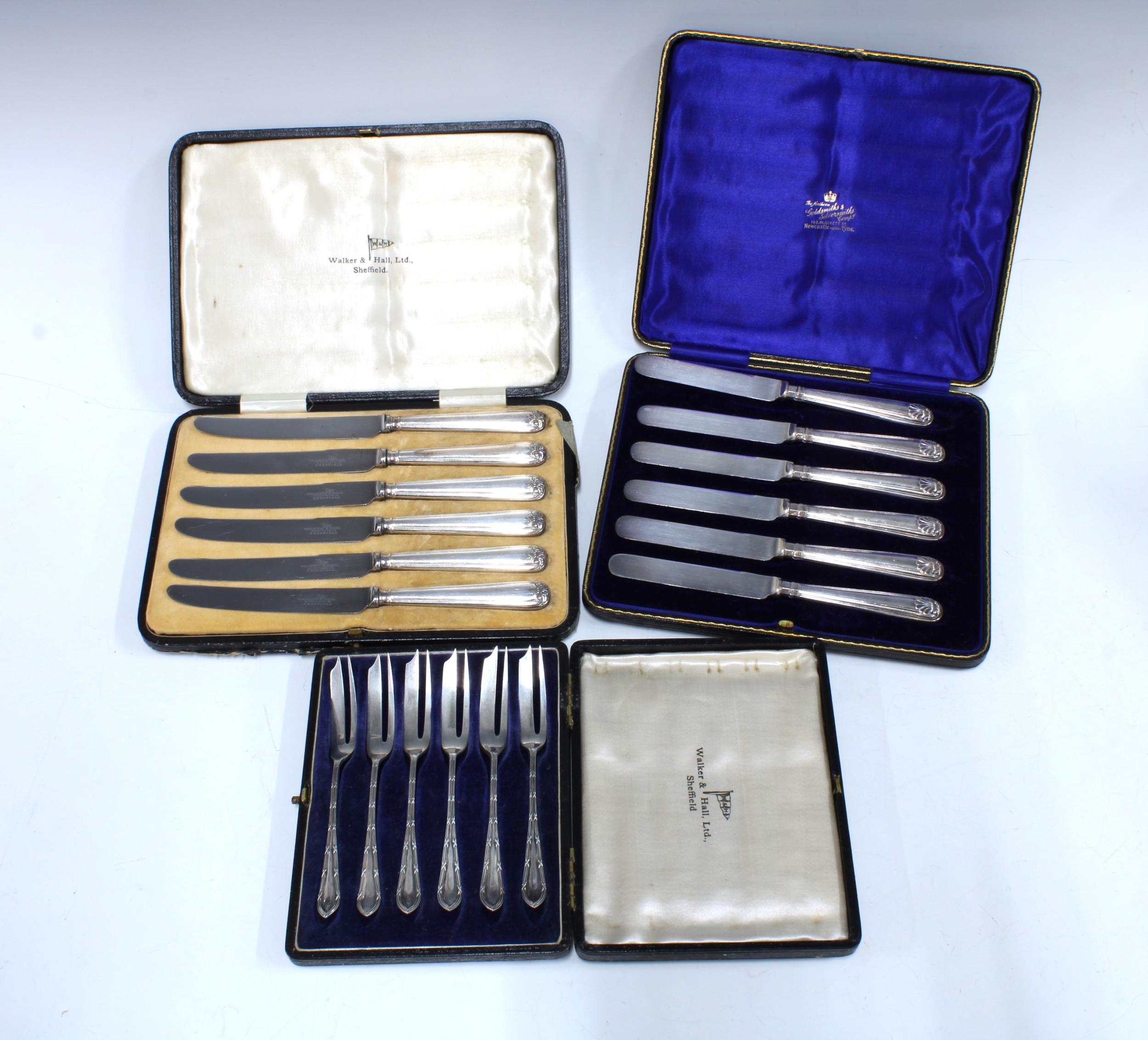 WAlker & Hall cased set of six silver pickle forks, Sheffield 1925 together with a set of six silver handled butter knives and a set of six silver plated butter knives (3)