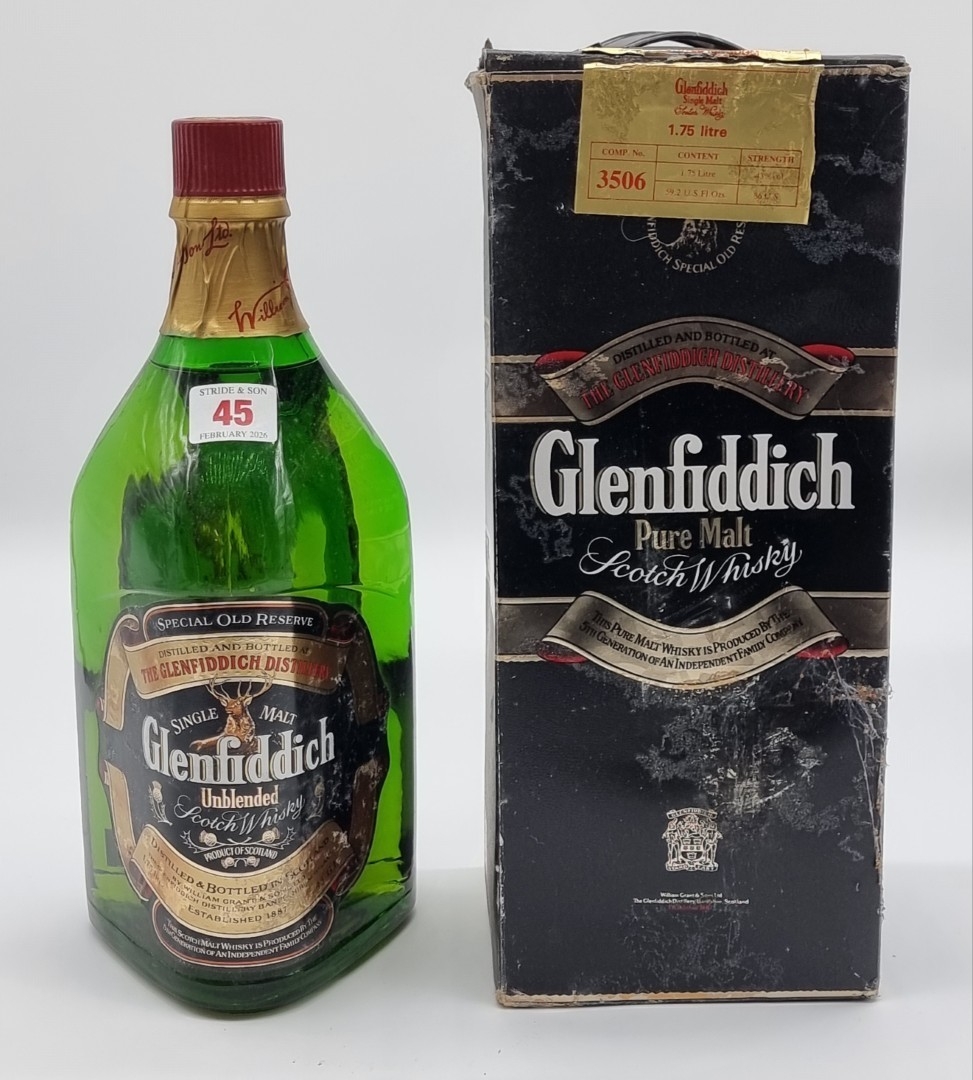 An unusual 1.75 litre bottle of Glenfiddich Whisky, in oc.
