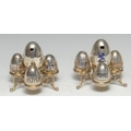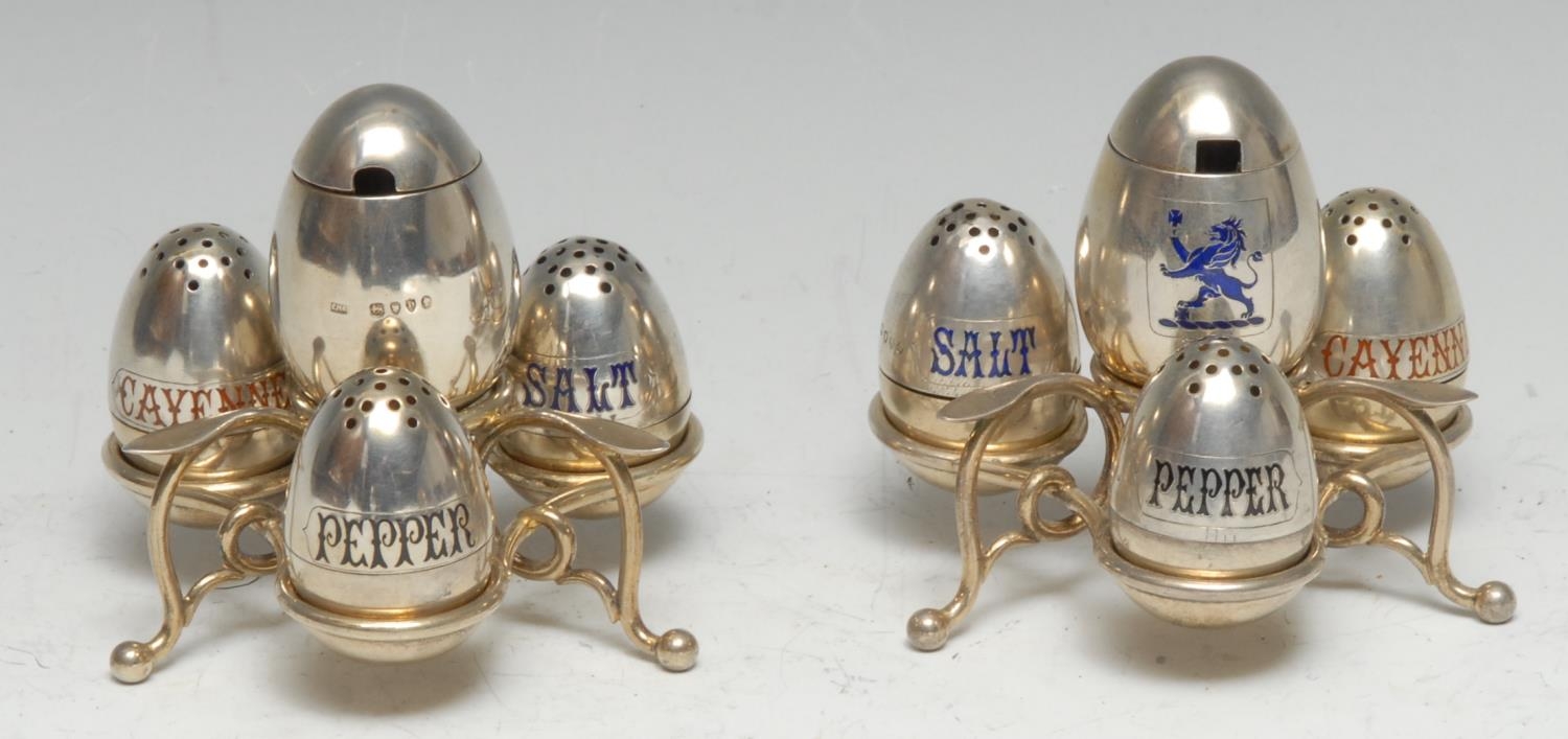 A pair of Victorian silver and enamel trefoil cruets, each with an arrangement of egg shaped condiments, crested and labelled in tones of blue and red Salt, Pepper and Cayenne, 9cm wide overall, Edward H Stockwell, London 1879
