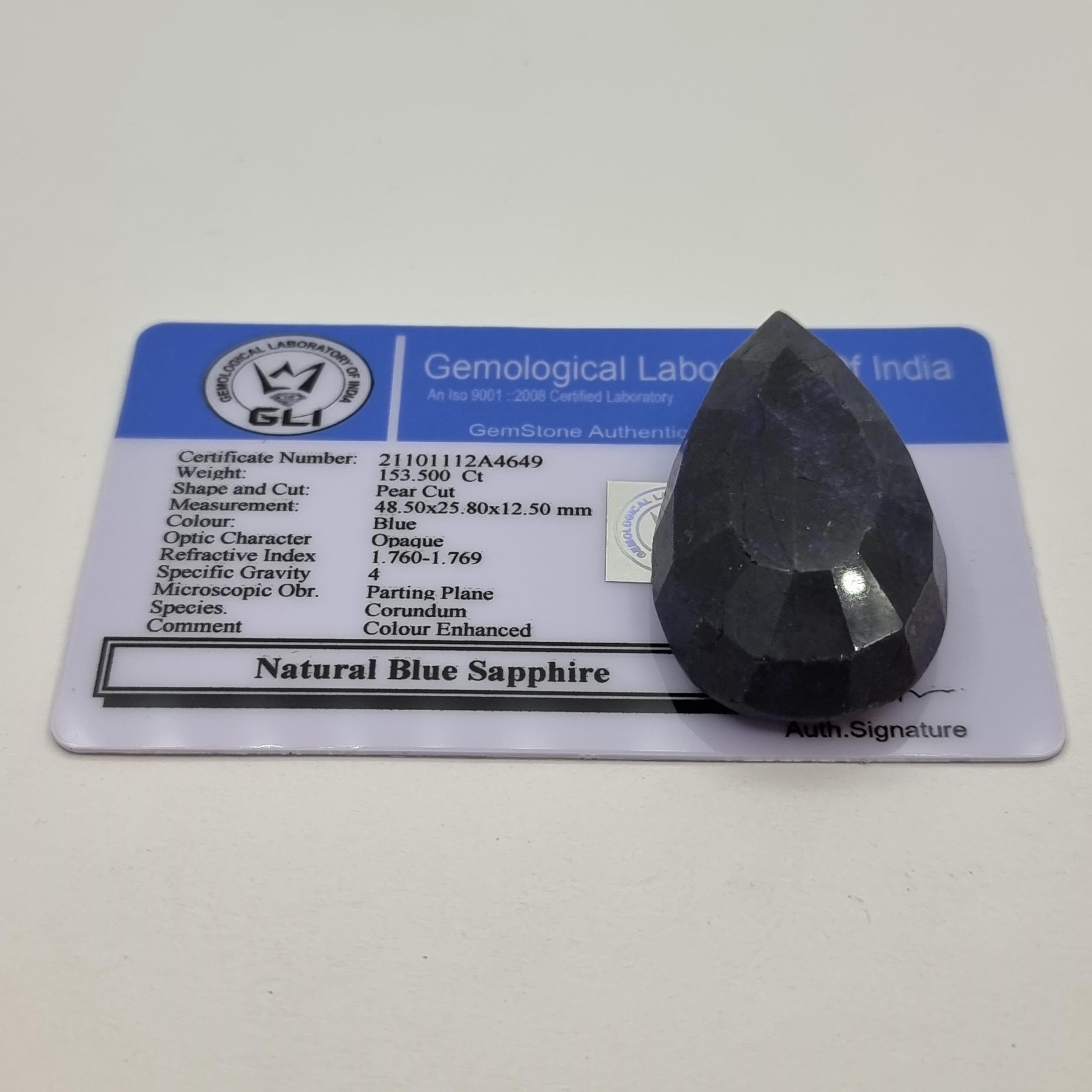 A huge pear shaped facet cut natural blue sapphire of 153.50 carats. Dimensions 5 x 2.5cm. Comes with GLI certificate. A very nice example. Amazing stone