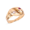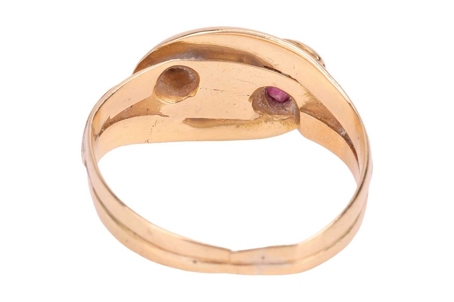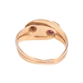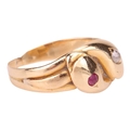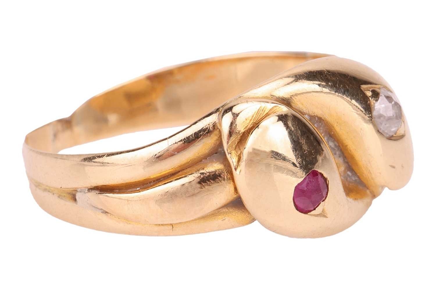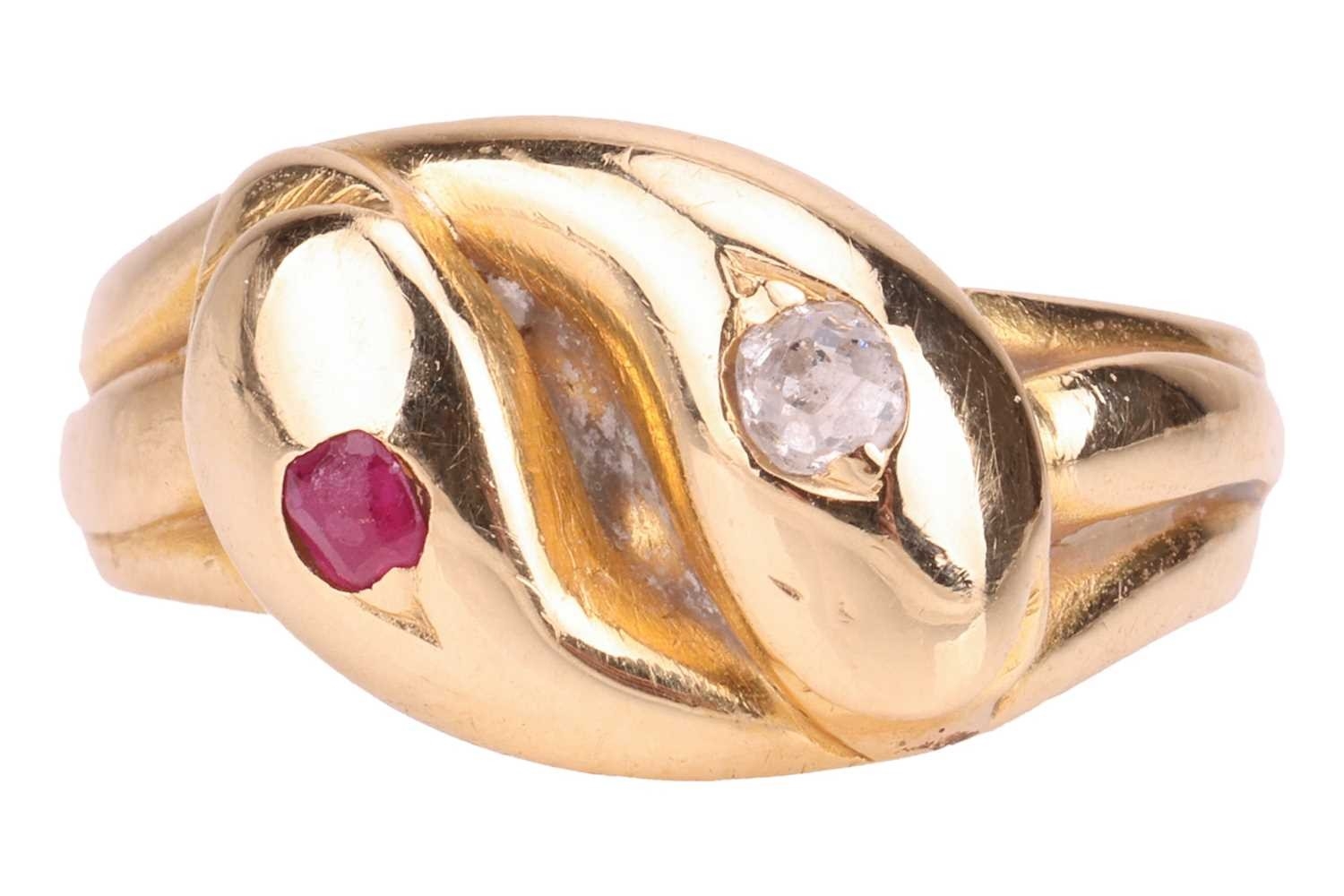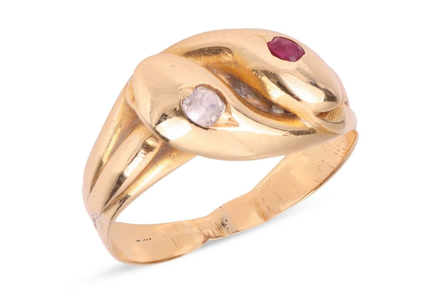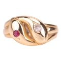 A Victorian gem-set double snake ring, the intertwined snake heads one set flush-set with a circular-cut ruby, another set with an old-cut diamond, in unmarked yellow metal surface testing as 18ct, size H, 2.7 grams. Please note: Unless otherwise stated, lots have been tested using an electronic tester. This is a surface test only and is not a guarantee of metal purity.
