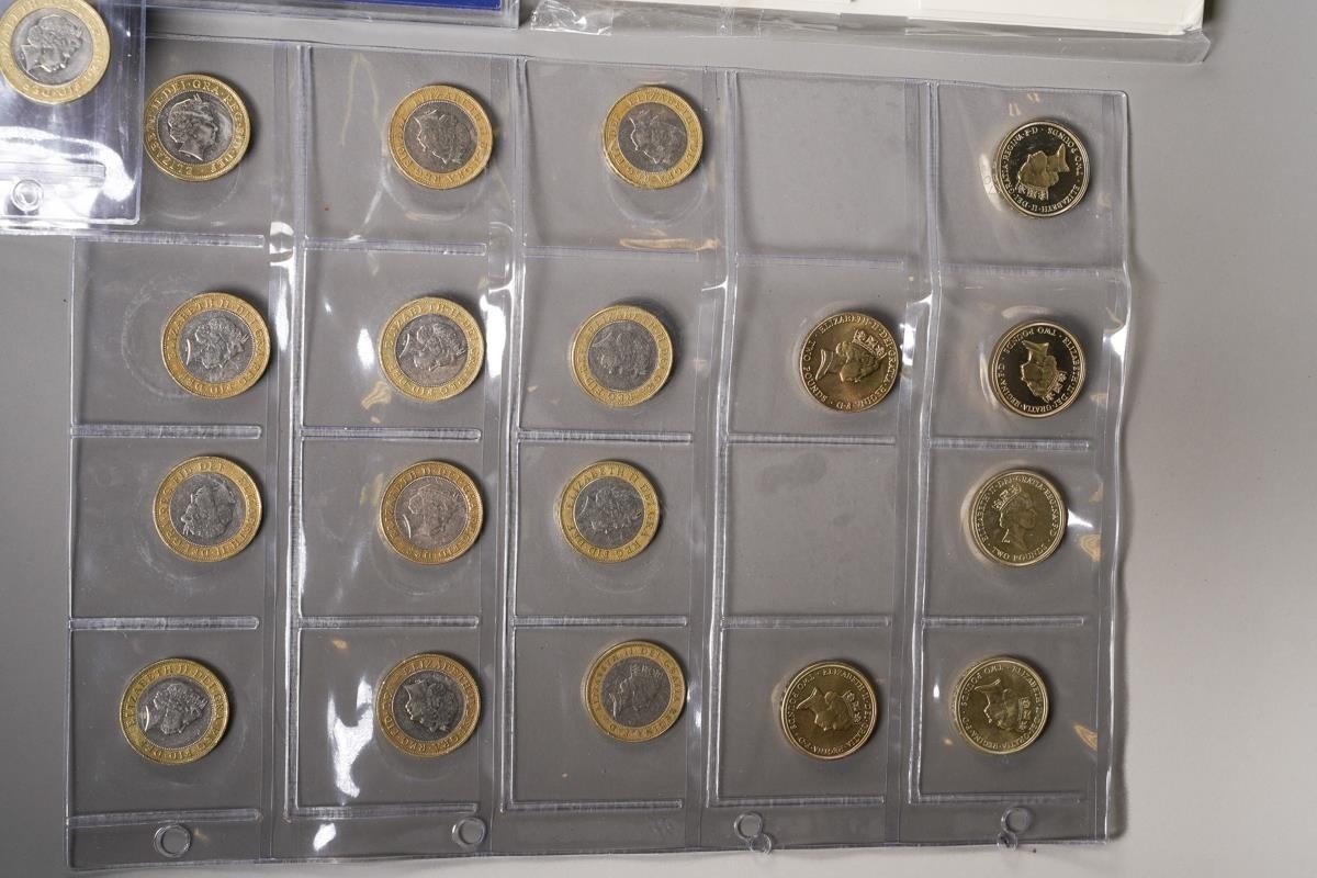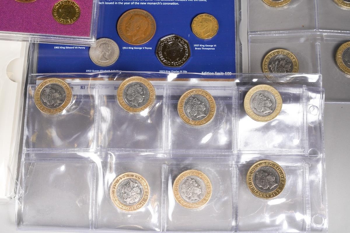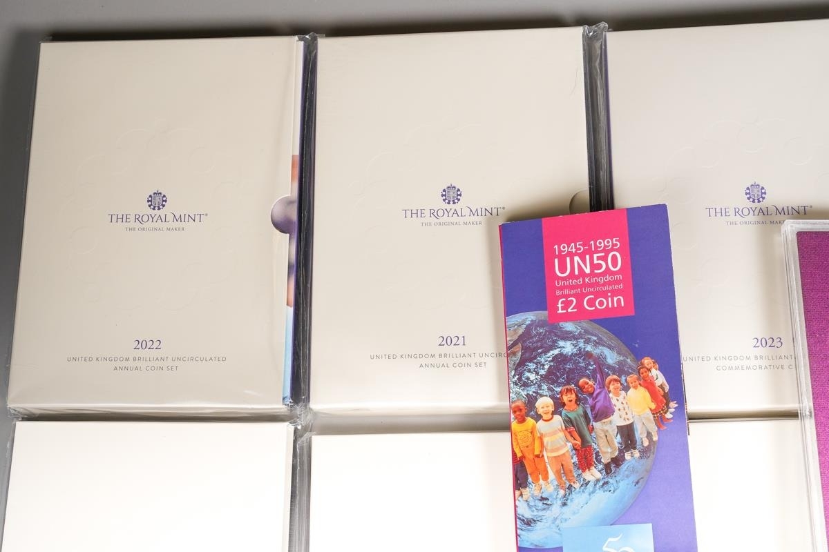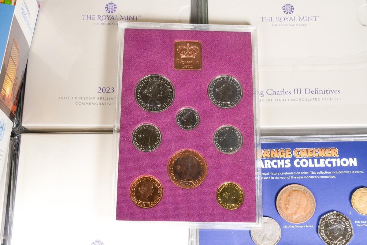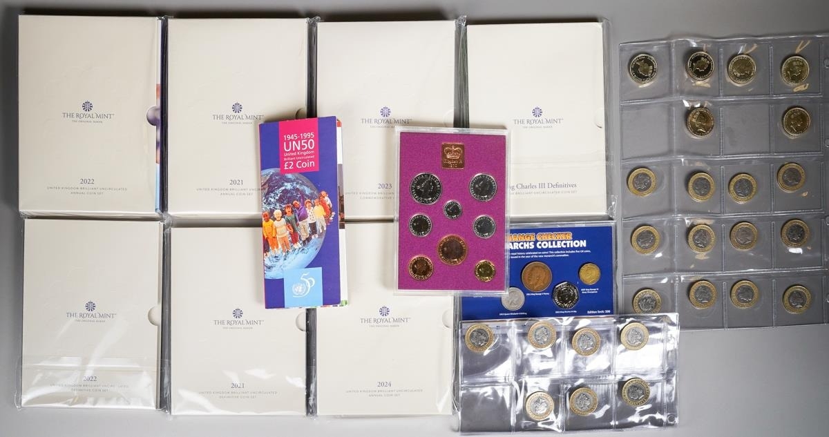 Seven Royal Mint United Kingdom Brilliant Uncirculated Definitive Coin Sets, 2 x 2021, 2 x 2022, 1 x 2023, 1 x 2024 and 1 x King Charles Definitives 2023, together with a Change Checker Monarchs Collection of five coins, a Royal Mint 1970 eight coin set, 19 x circulated legal tender £2 coins, 6 xcirculated old style £2 coins, another in a Change Checker pack and a Royal Mint 1995 UN50 UK Brilliant Uncirculated £2 coin (1 bag)