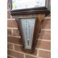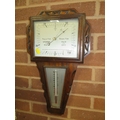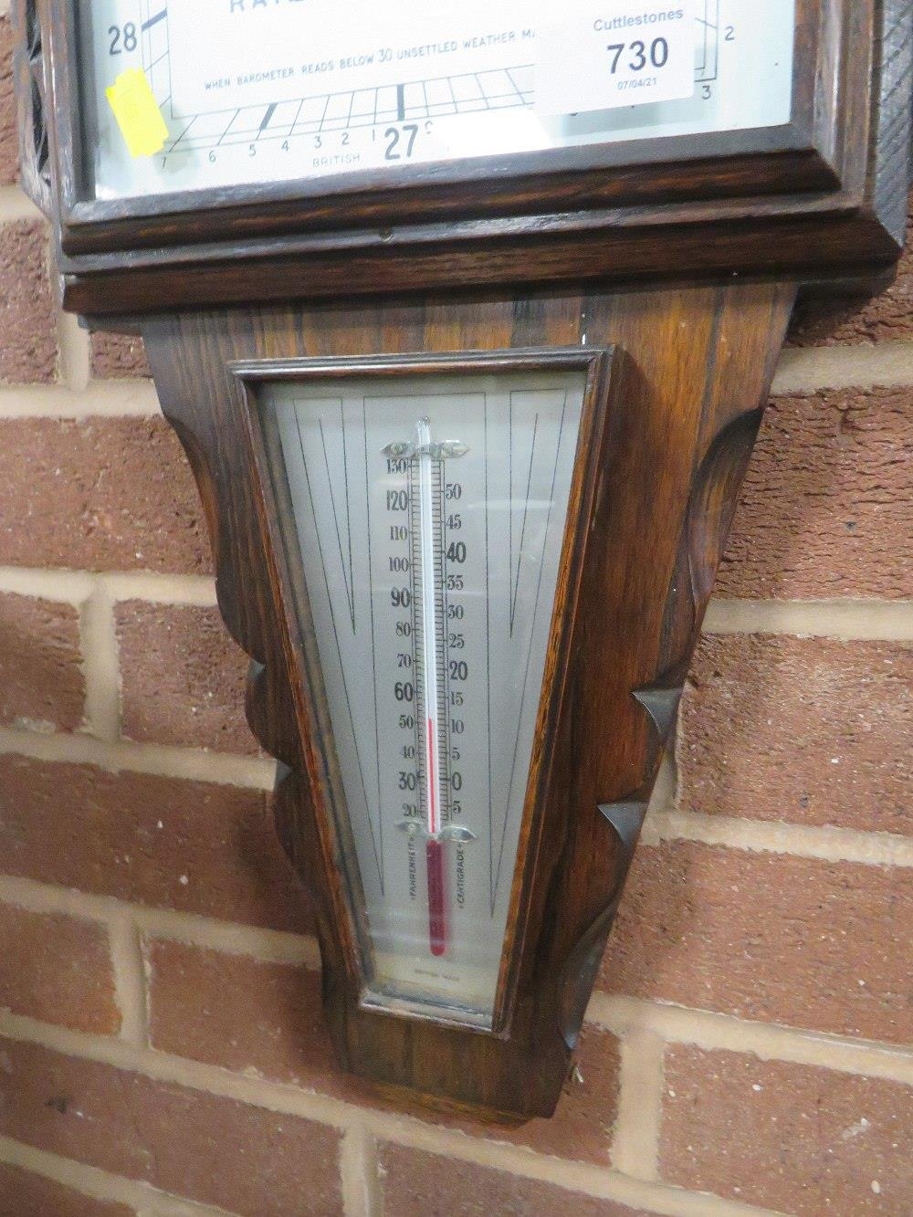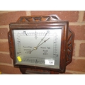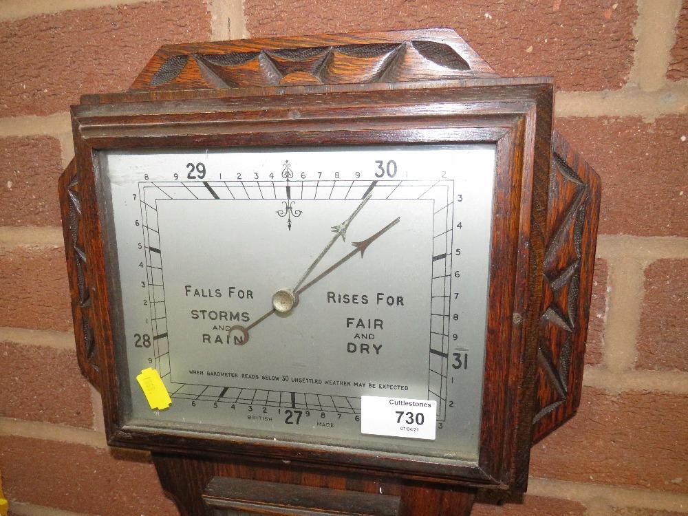 AN UNUSUAL ANGULAR OAK BAROMETER, H 55 CM, TOGETHER WITH ANOTHER SMALLER EXAMPLE (2)