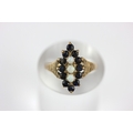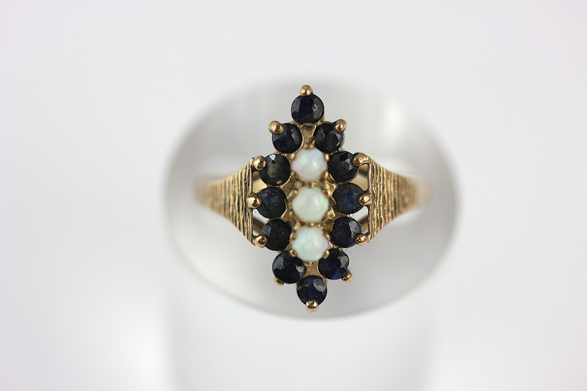 A 9ct gold opal and sapphire marquise shaped cluster ring, set with three opals and with a surround of twelve circular cut sapphires, size O, gross weight 3.1g