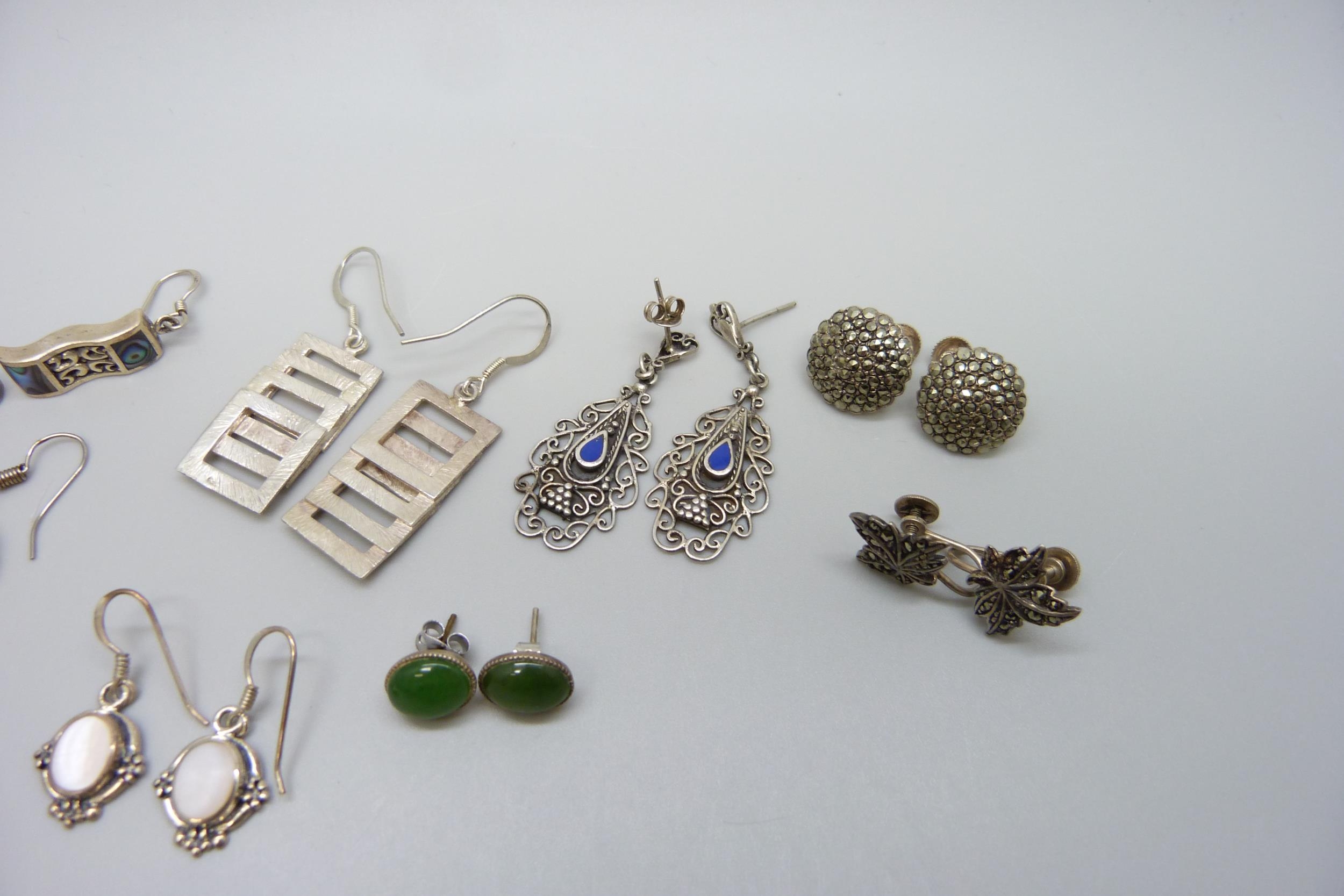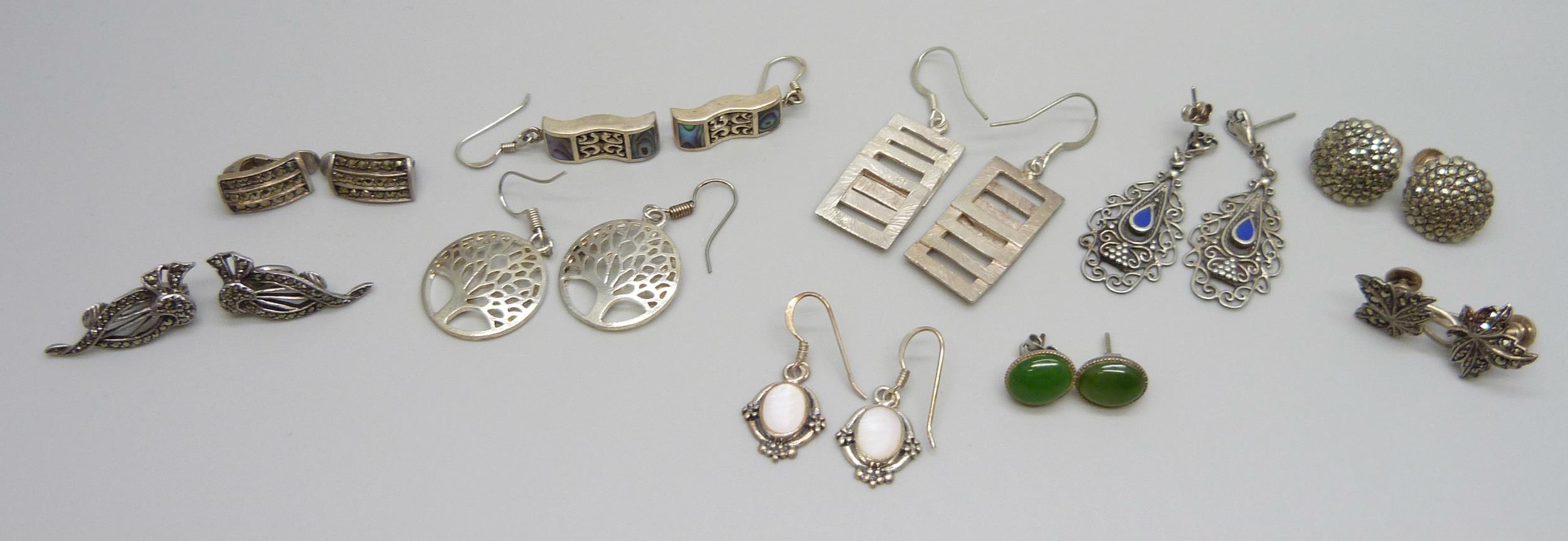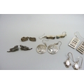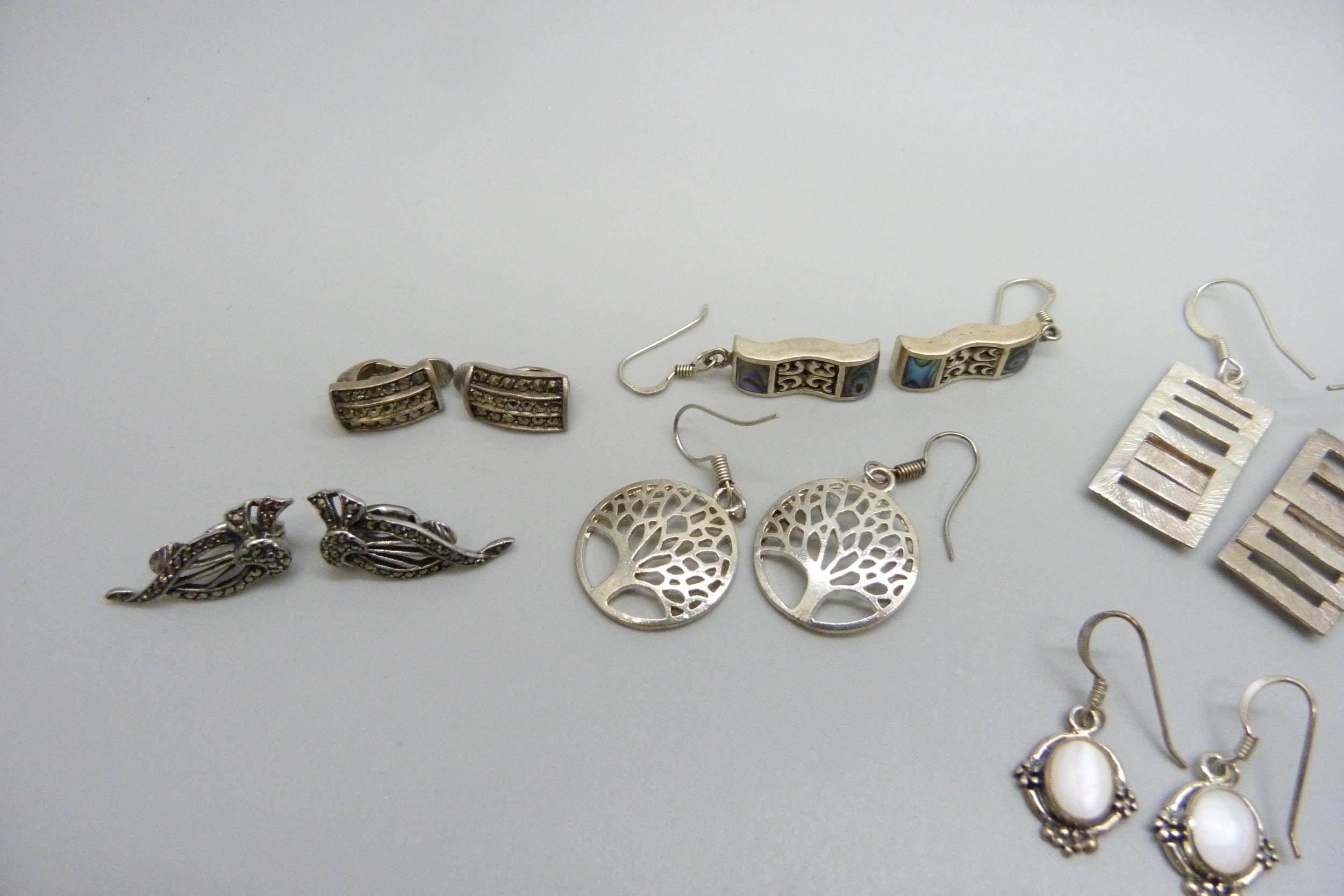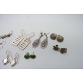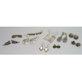 Nine pairs of silver earrings and a pair of plated tree of life earrings, 38g