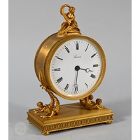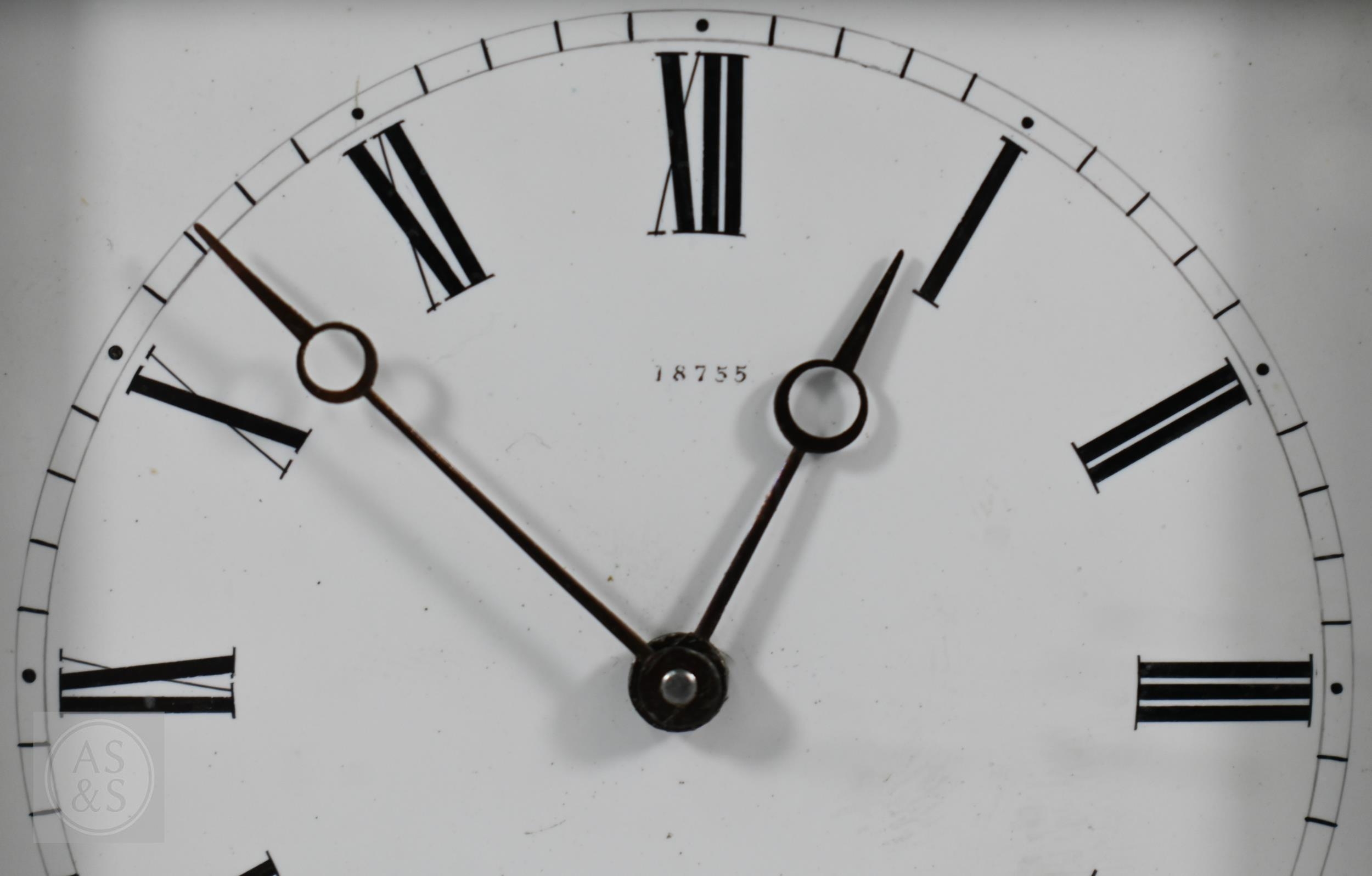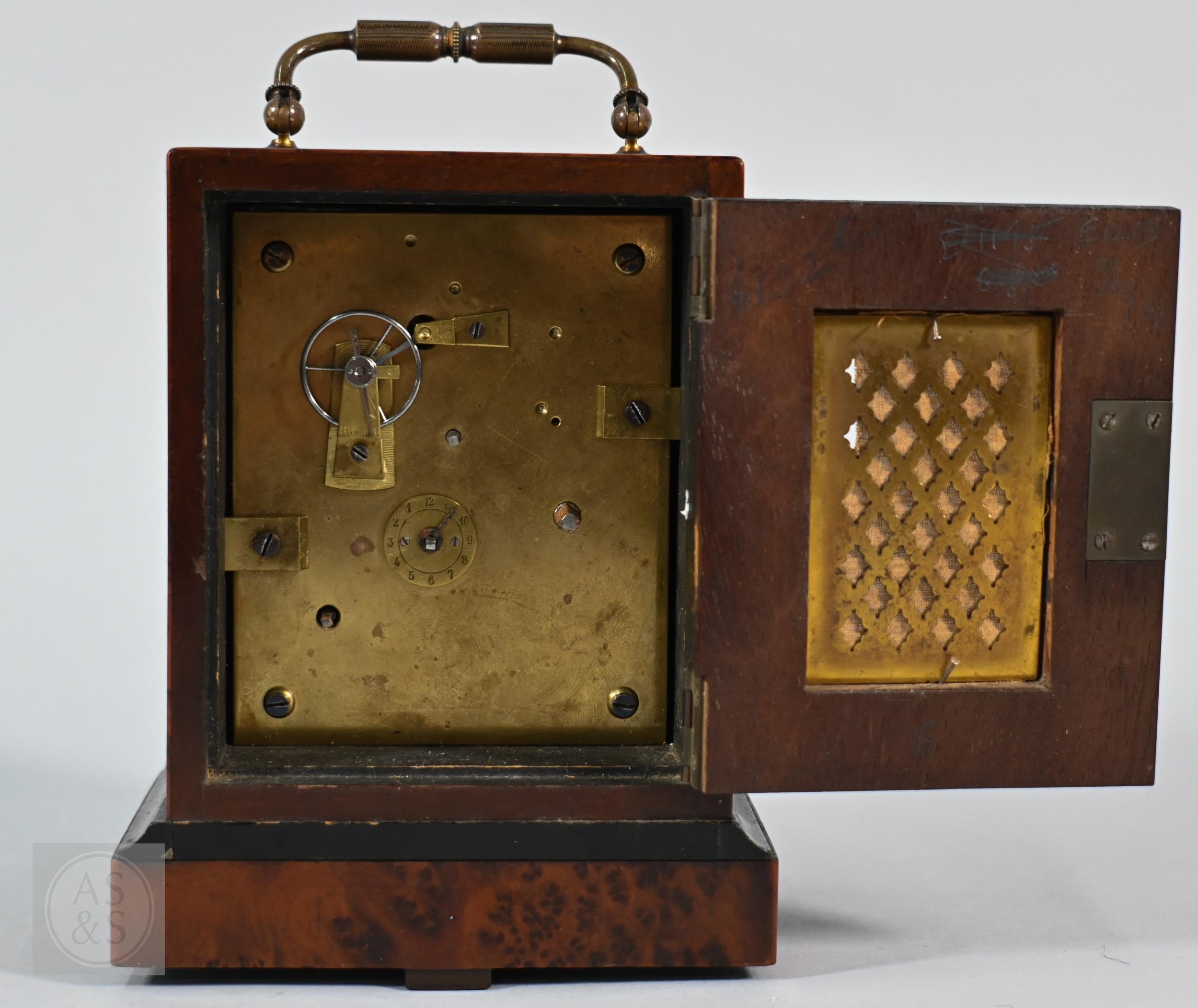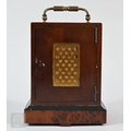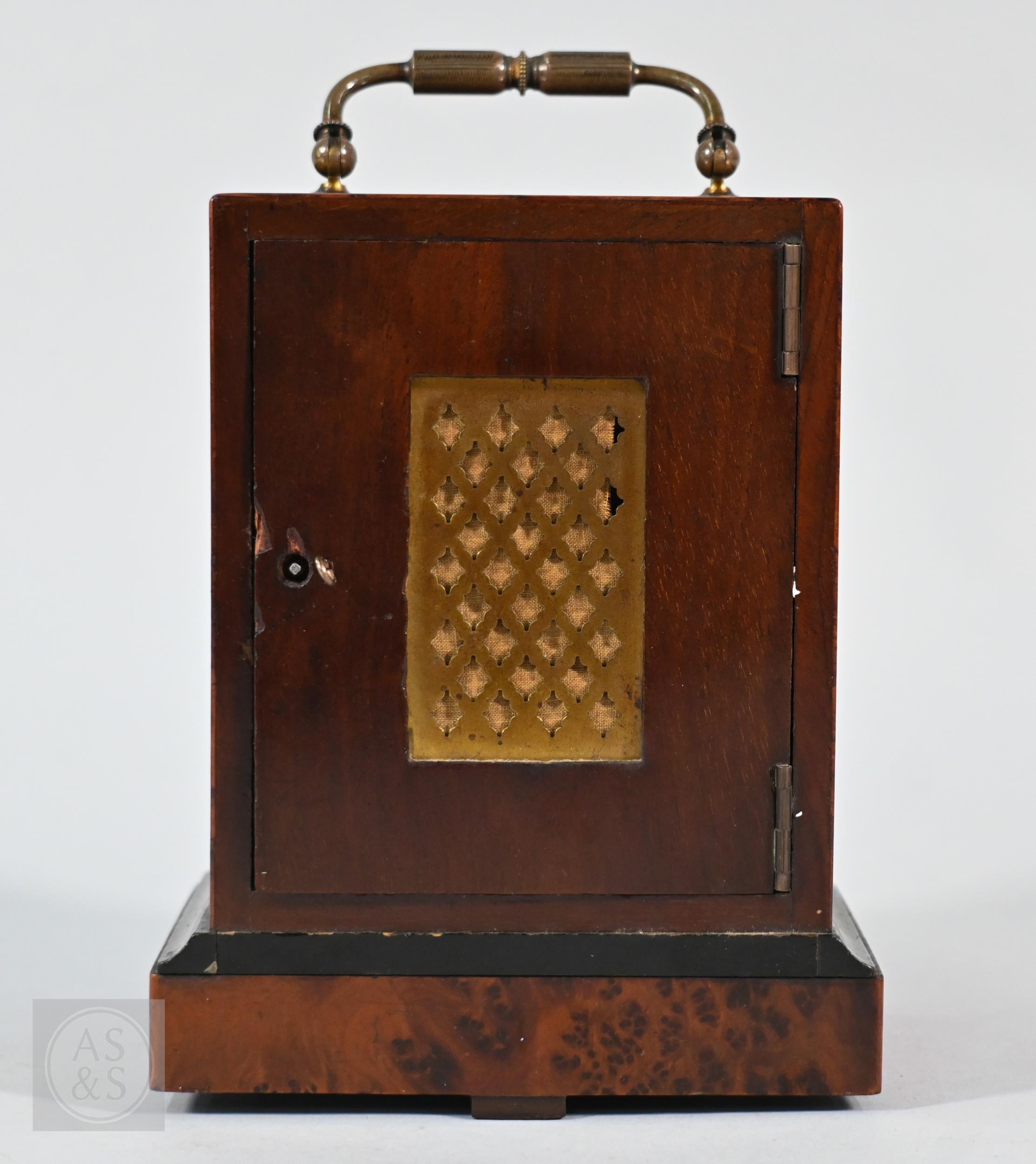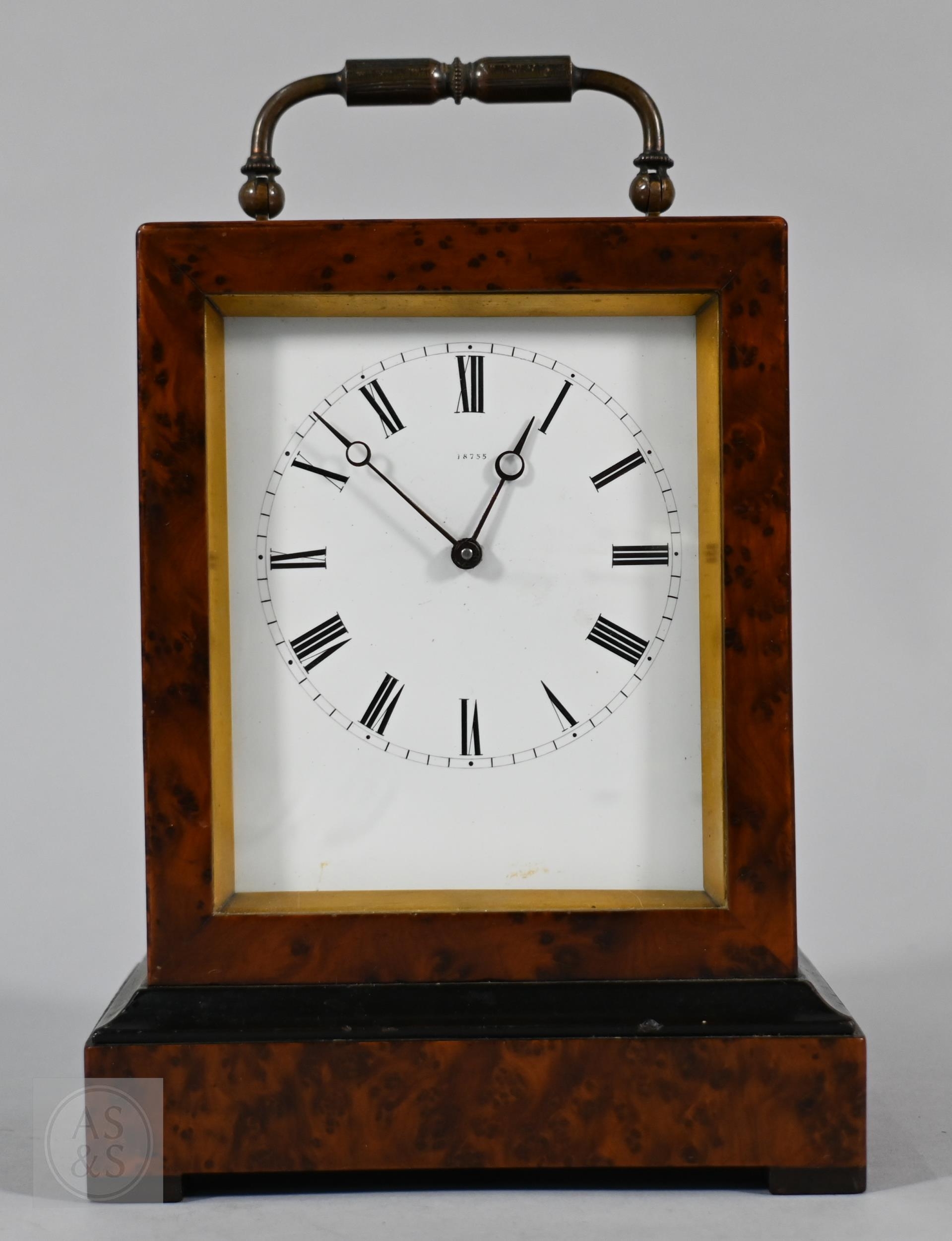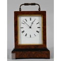 A Victorian style burr maple library clock, the 8-day single train movement with white enamelled roman numeral dial, no key