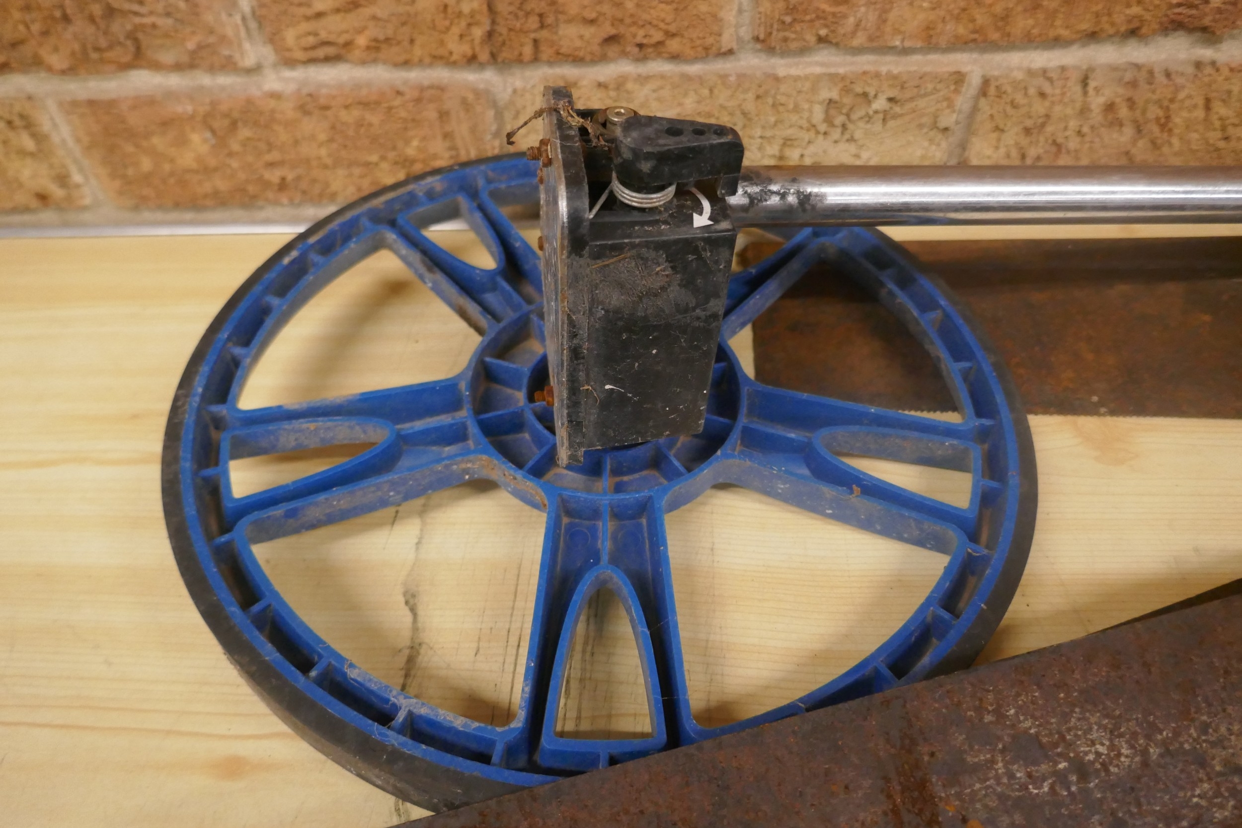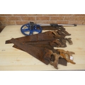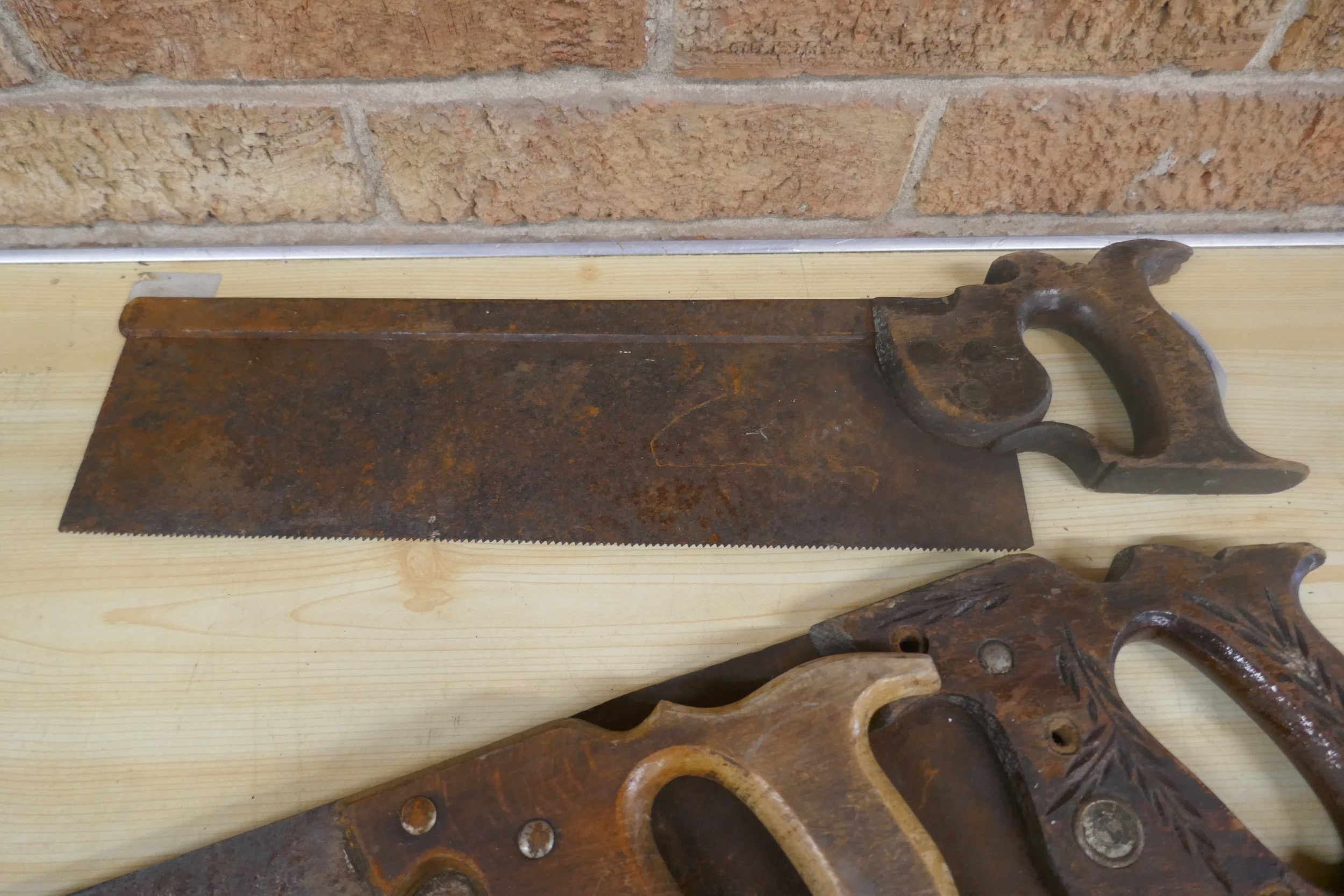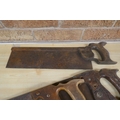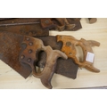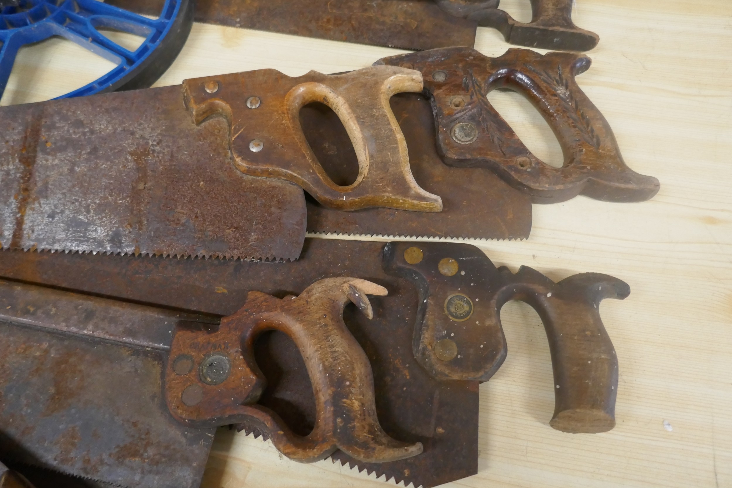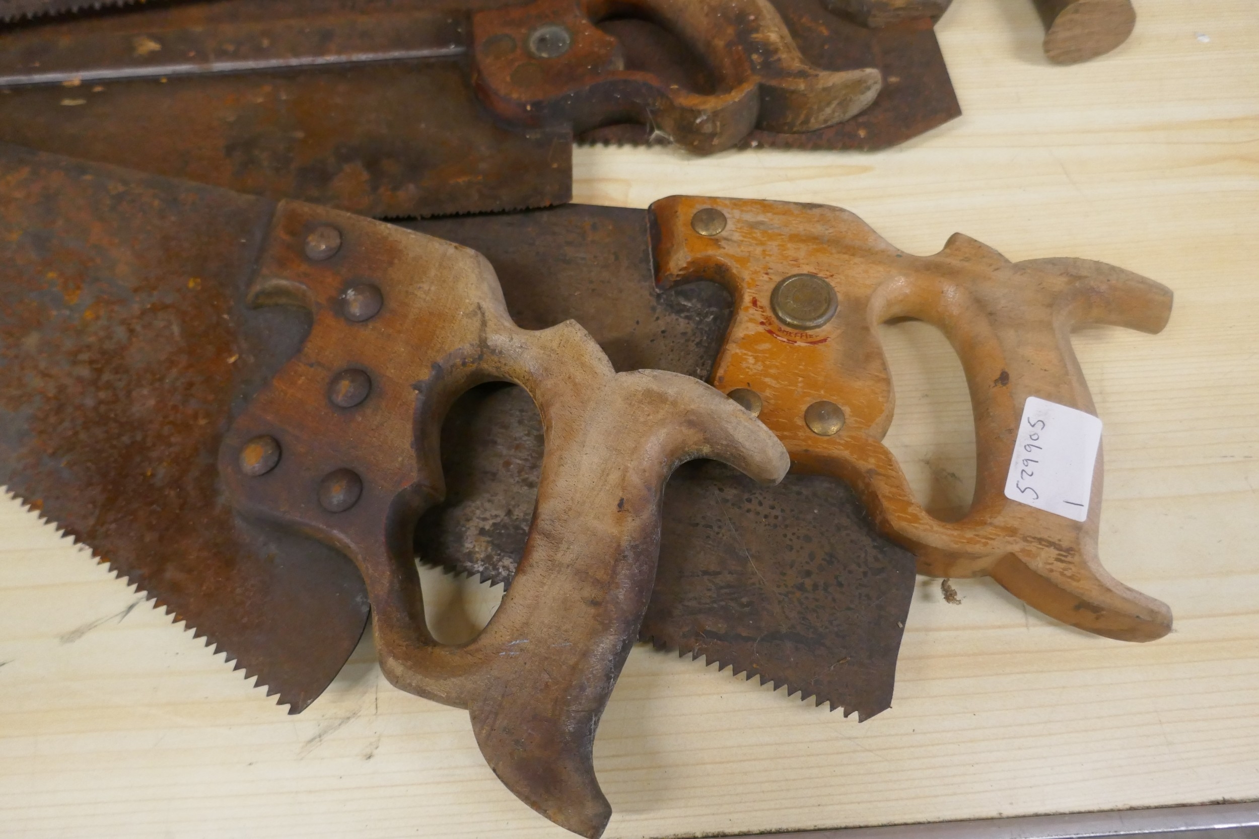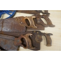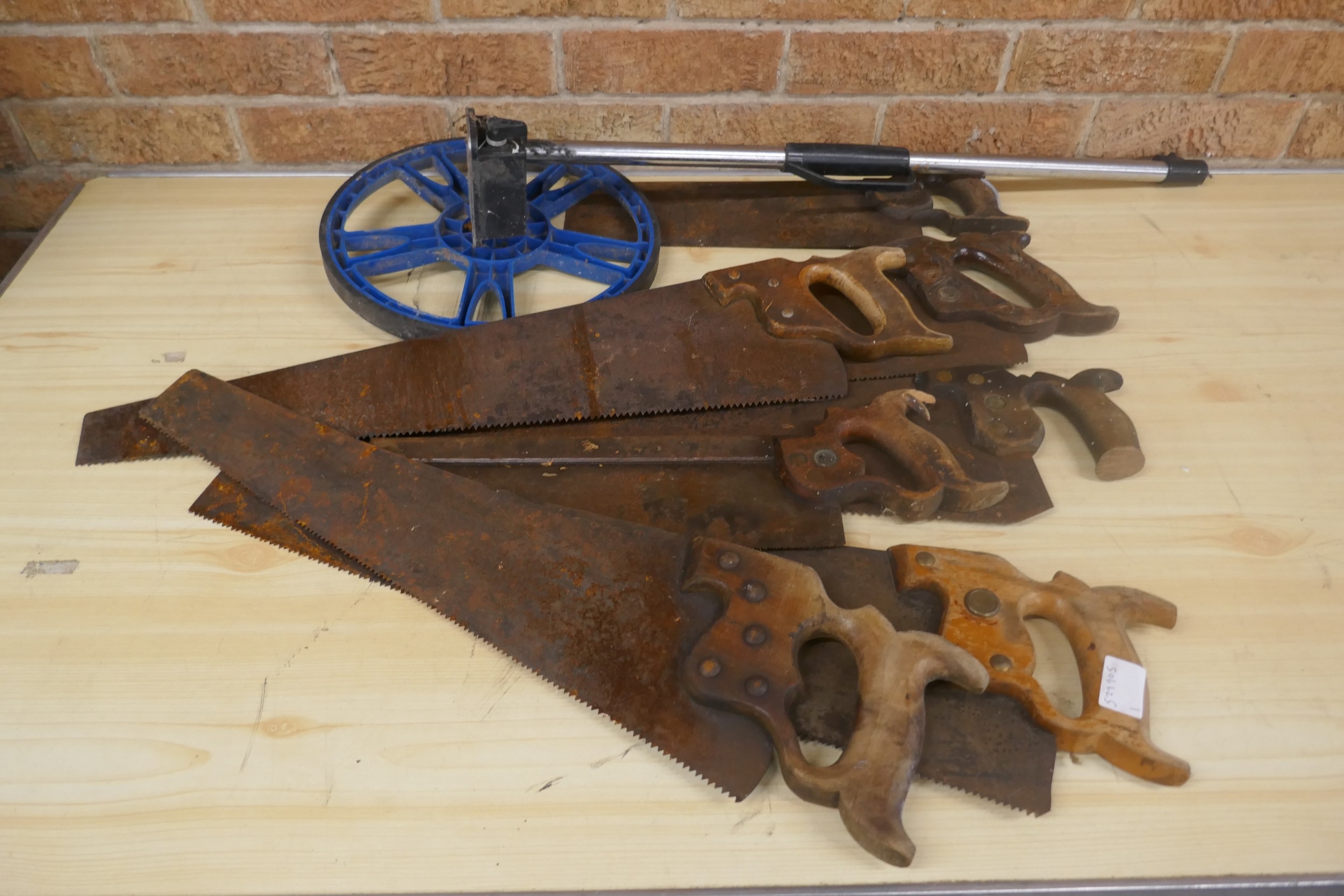 A quantity of vintage wooden handled wood saws and a measuring wheel