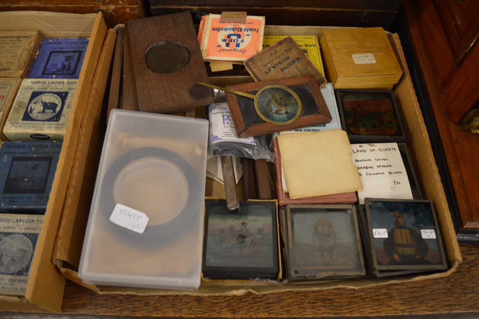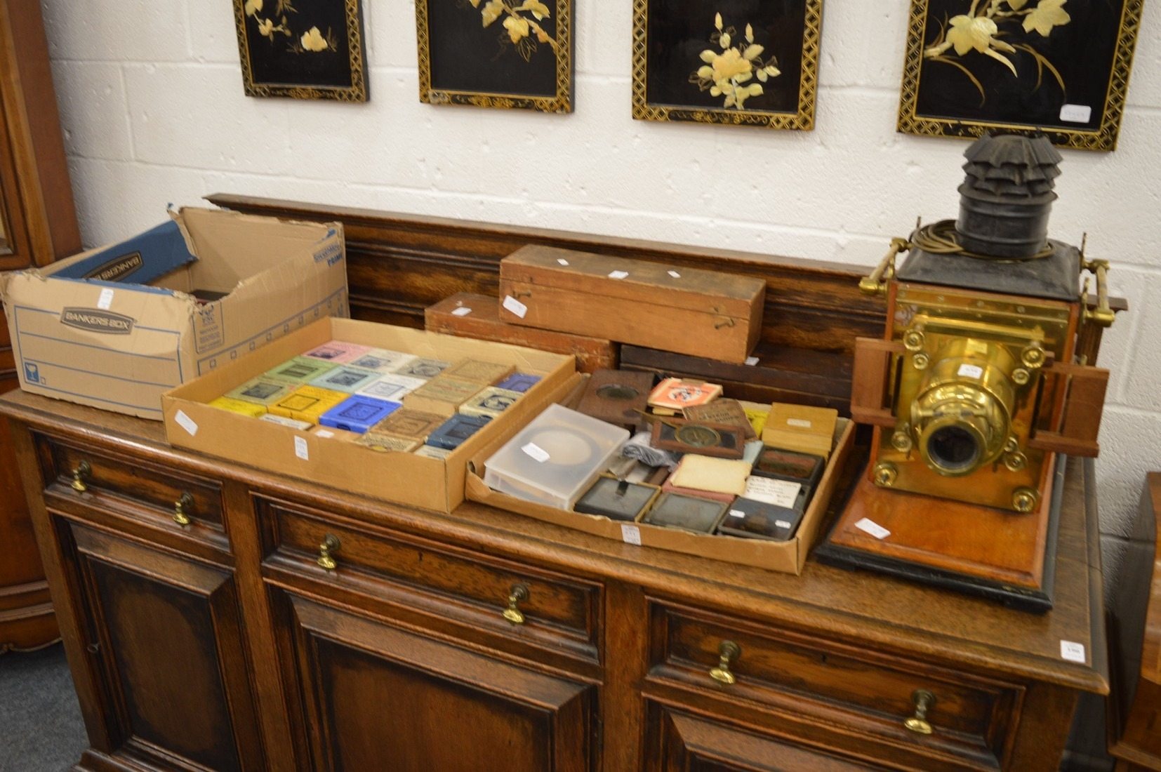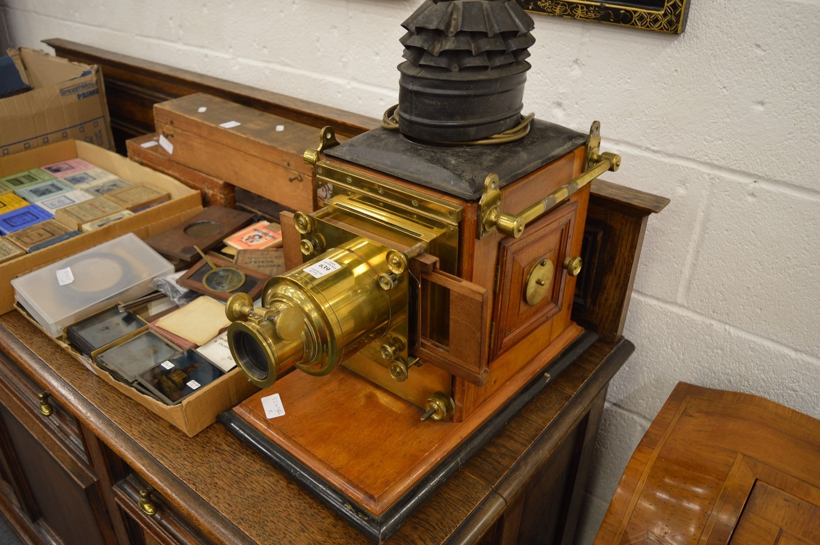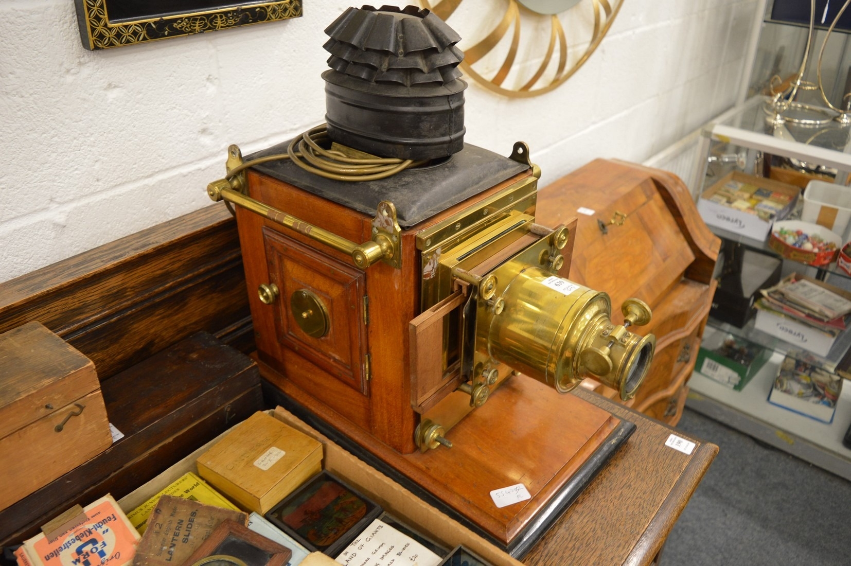 A good Victorian brass and mahogany slide projector, converted to electricity complete with numerous boxes of slides and accessories etc.