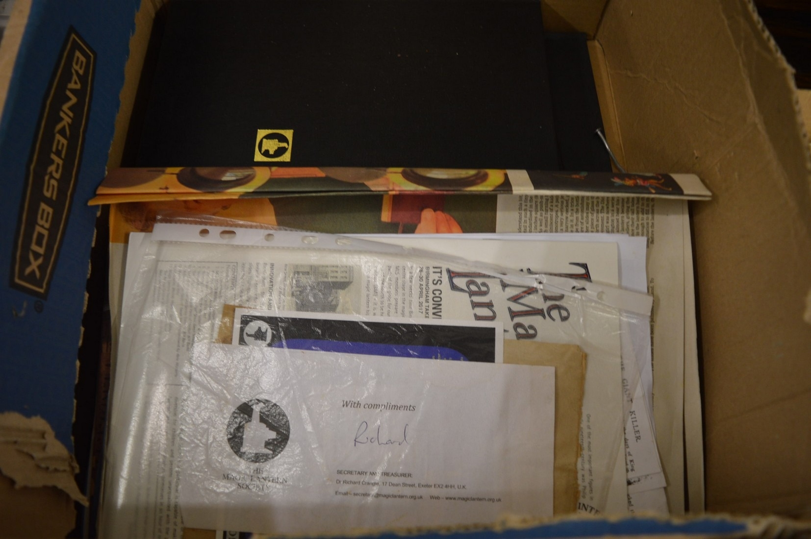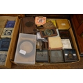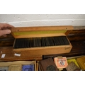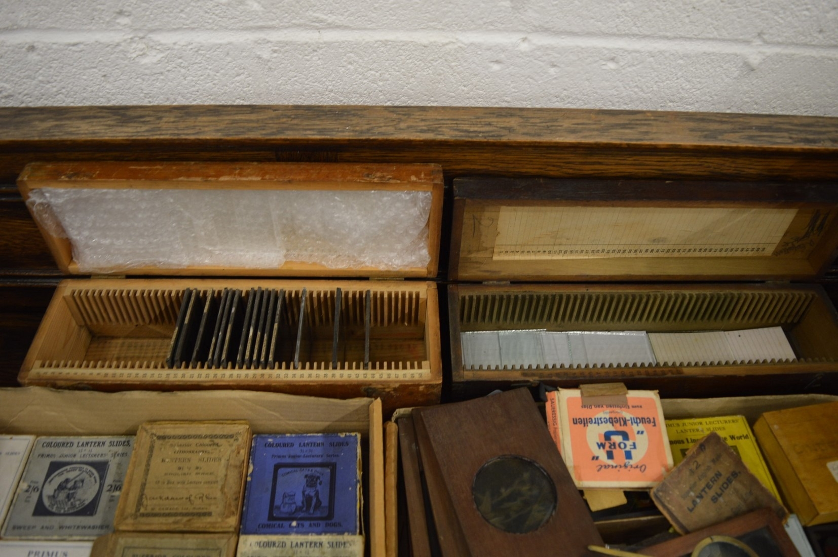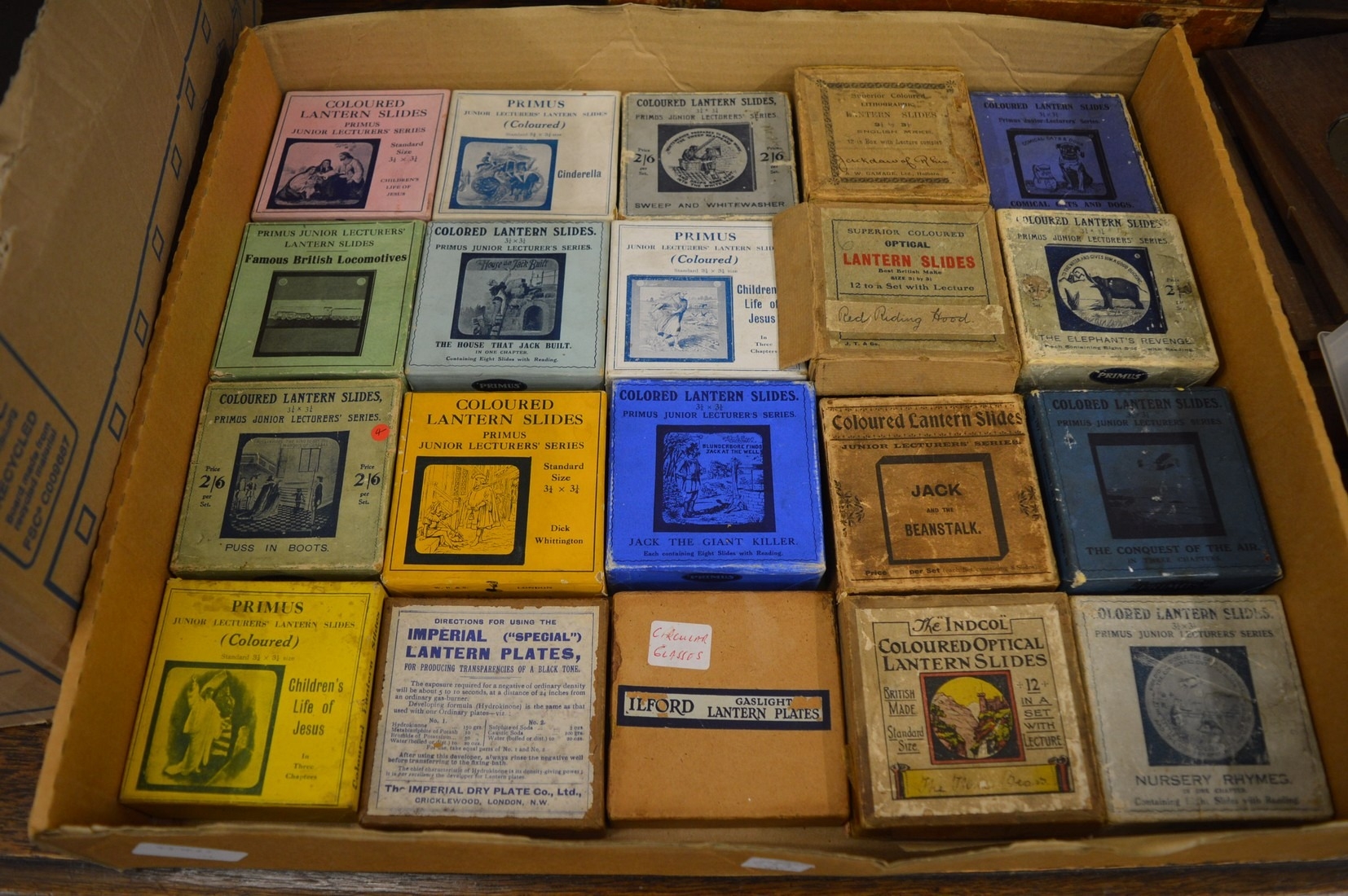 A good Victorian brass and mahogany slide projector, converted to electricity complete with numerous boxes of slides and accessories etc.
