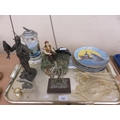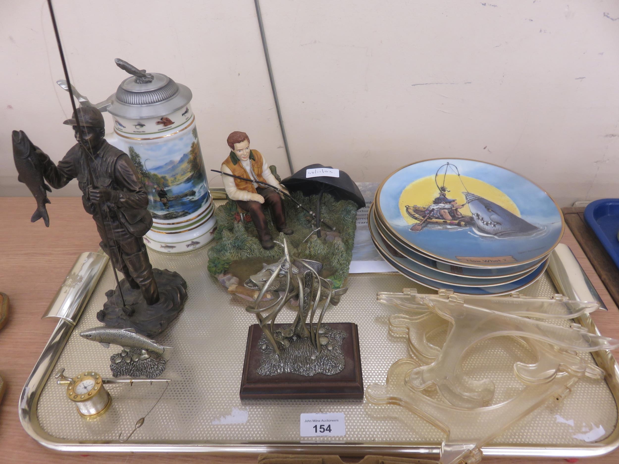 Tray Containing Fishing Related Items, Tankard, Figurines, clock, Wall Plate with Stands