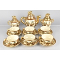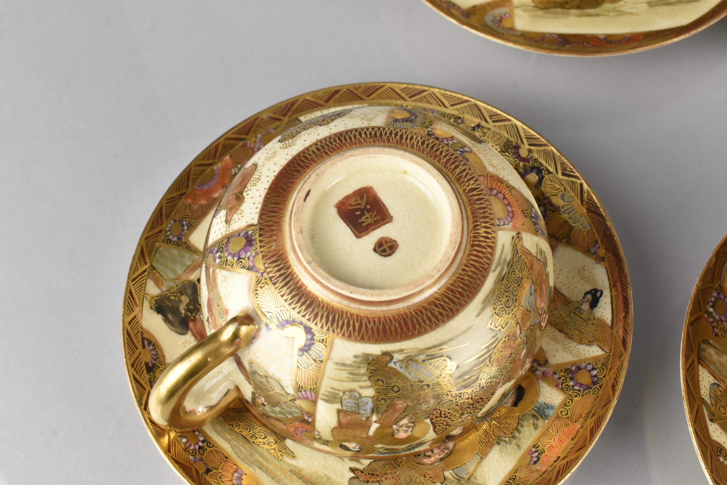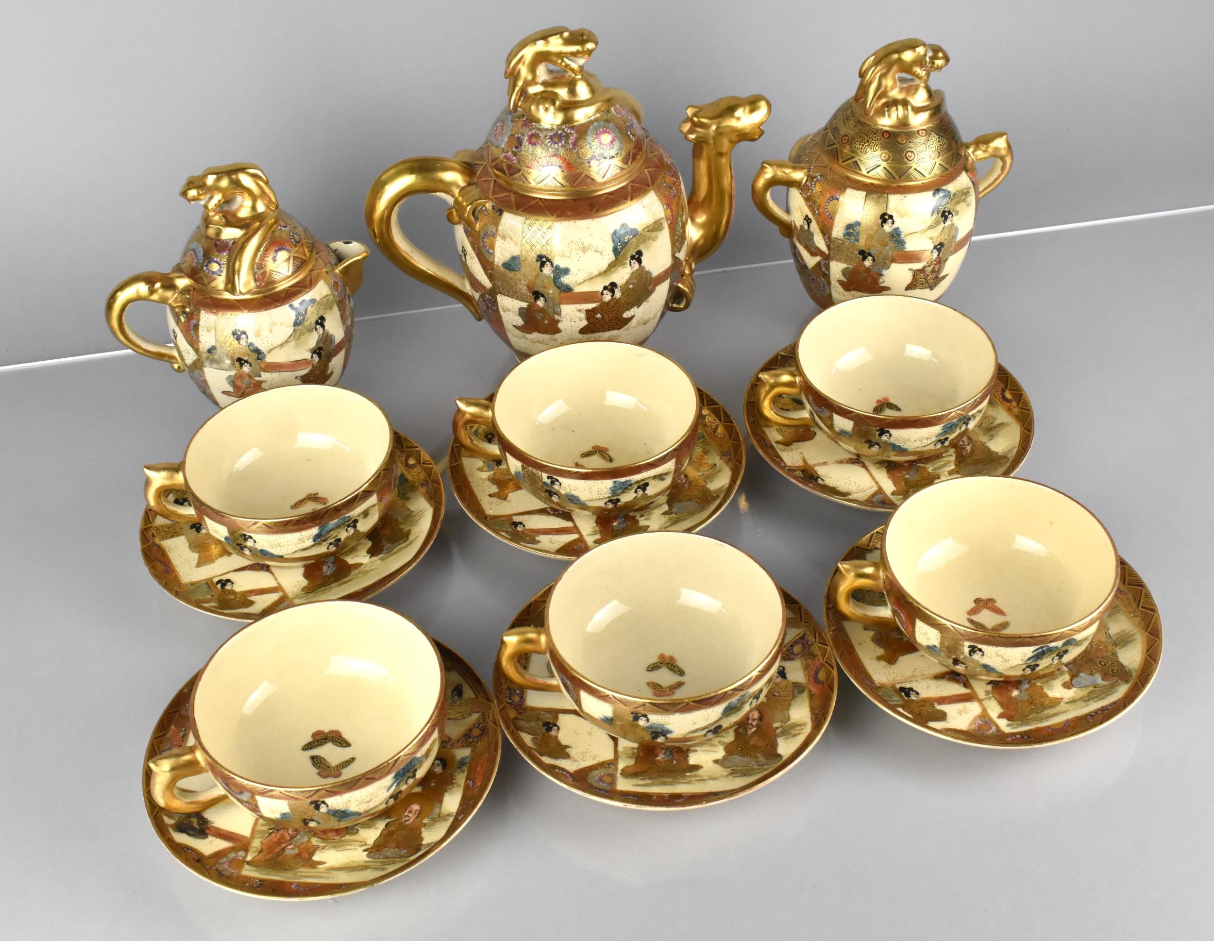 A Japanese Satsuma Tea Set Decorated with Figures in the Usual Colourway and Gilt Detailing to Comprise Six Cups, Six Saucers, Teapot, Lidded Sugar and a Lidded Milk Jug