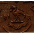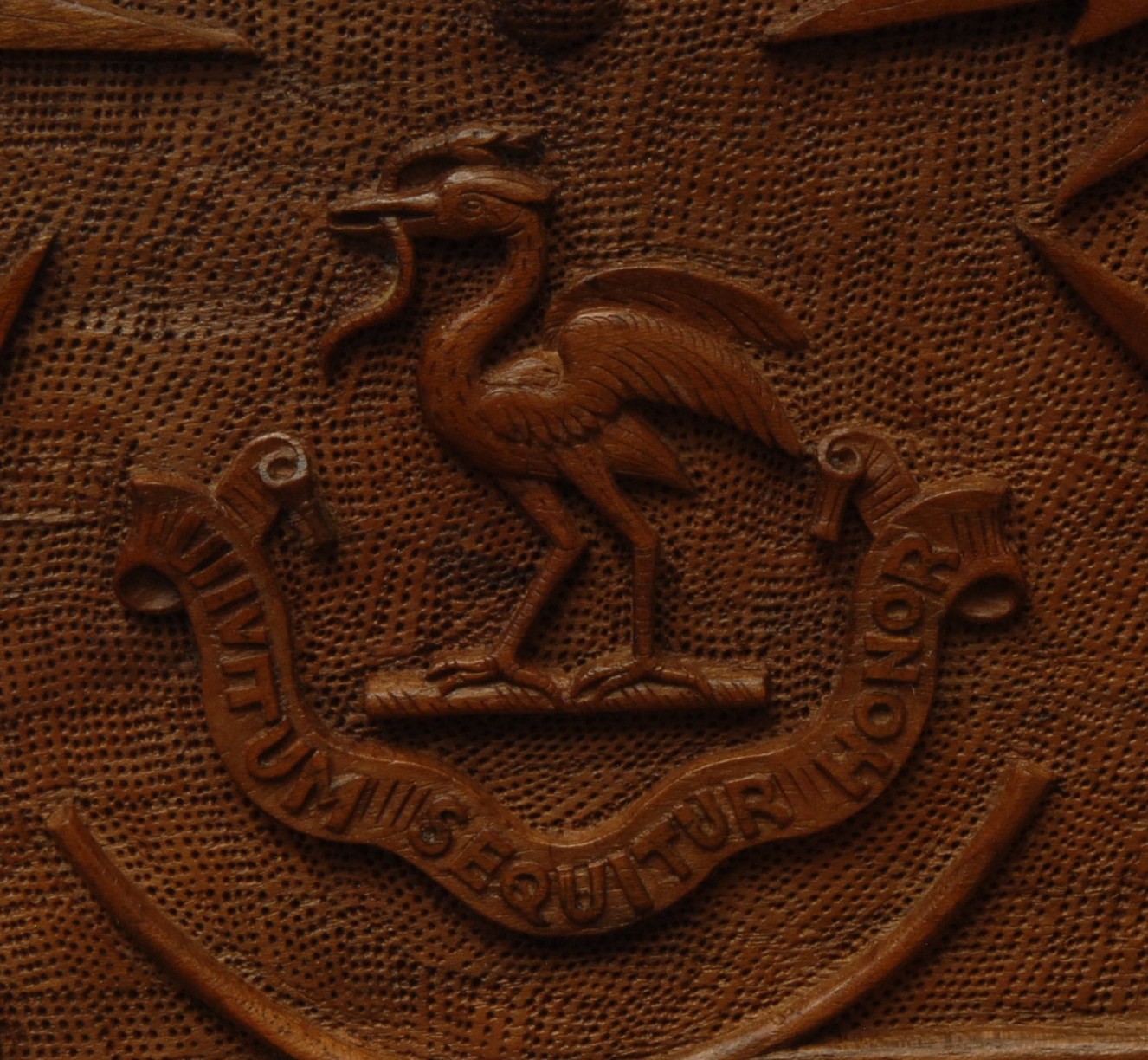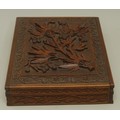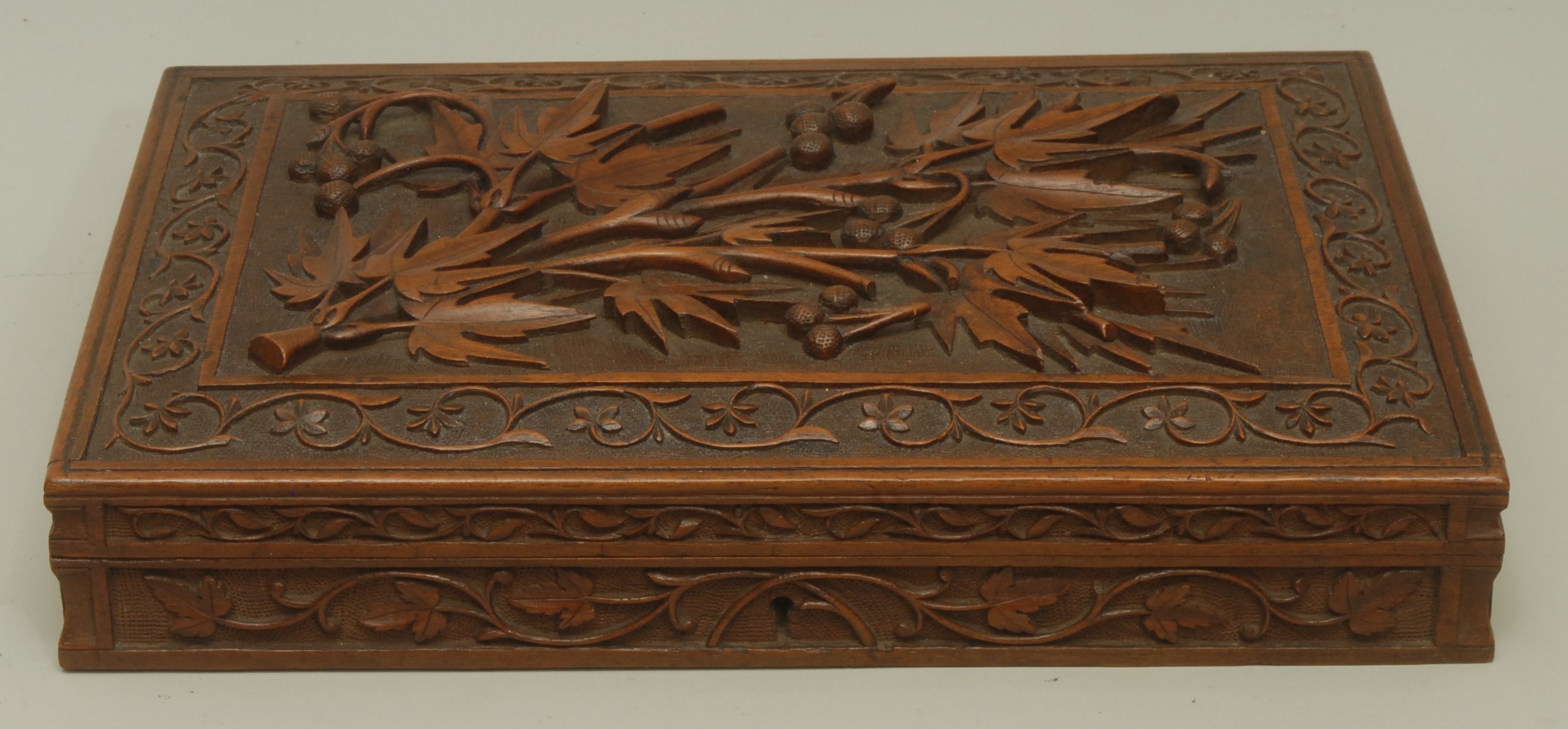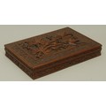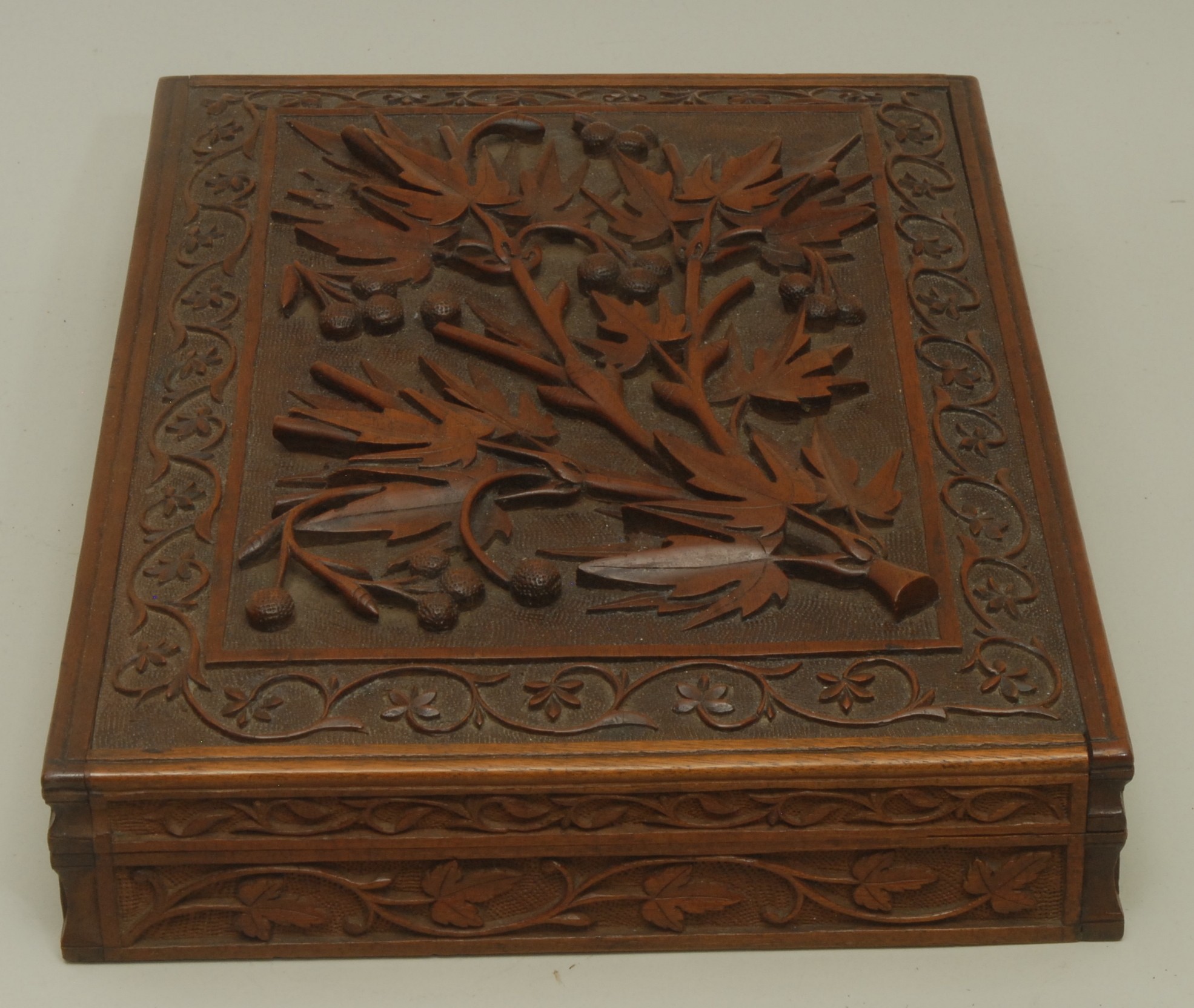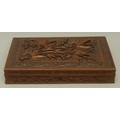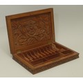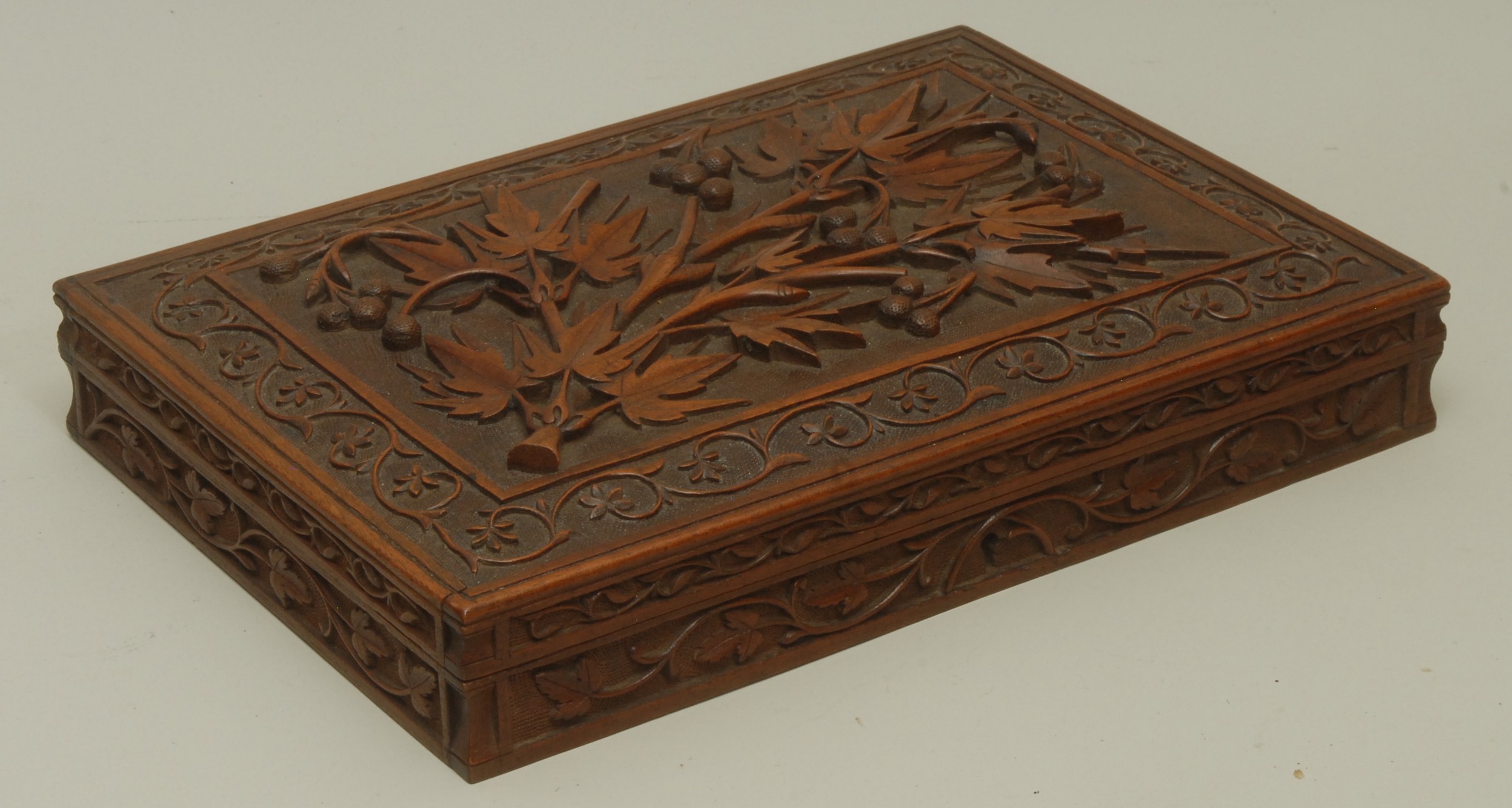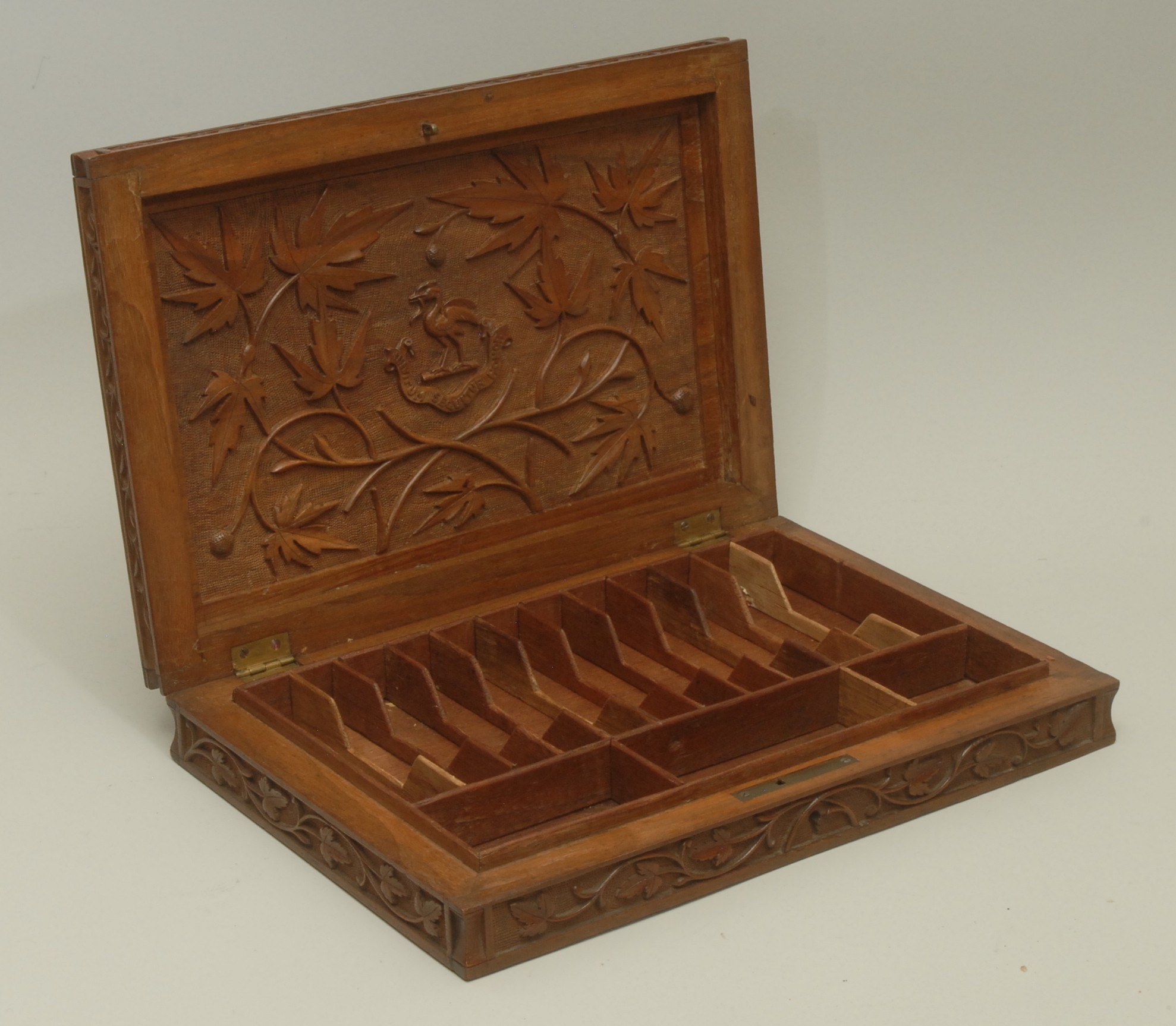 An Anglo-Indian Kashmiri hardwood rectangular armorial cigar box, hinged cover carved in bold relief with fruiting vine, to verso with crest and motto of Earl of Chichester, fitted interior, 31.5cm wide, maker's label to base, c.1900