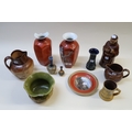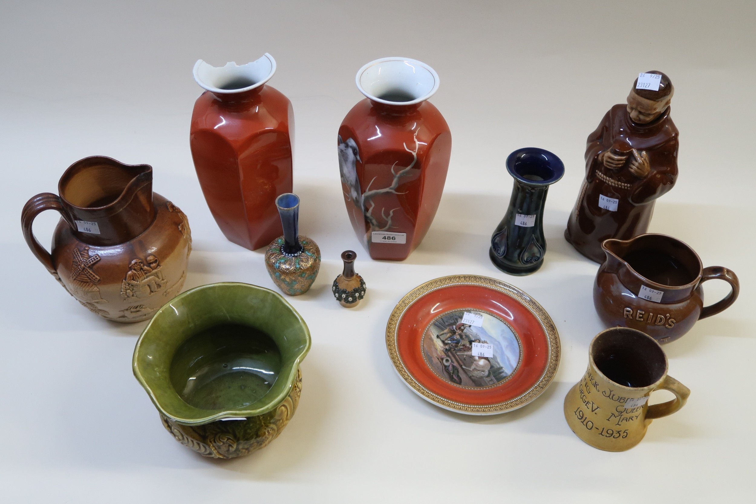 Various items of Royal Doulton stoneware, pair of Burslem vases (one at fault) and other decorative pottery including Prattware plate