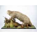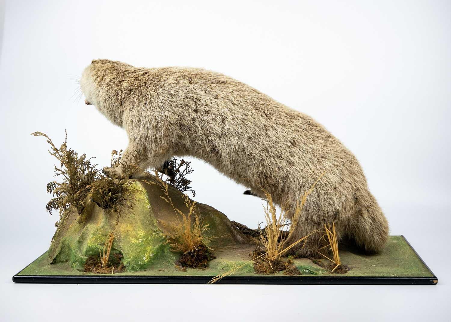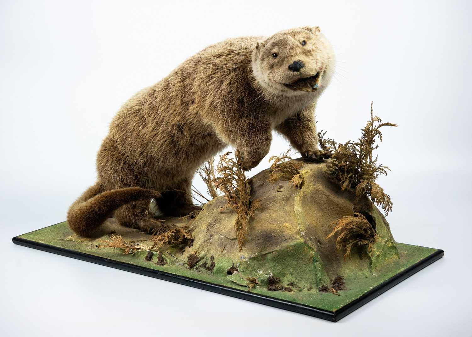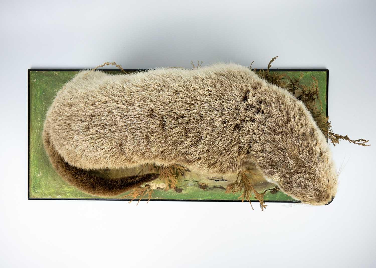 A taxidermy otter Positioned on a faux landscape base. 36cm in height. Purportedly by Kenny Everett. With stow wooden case 45.5cm high x 76.5cm wide x 41cm deep
