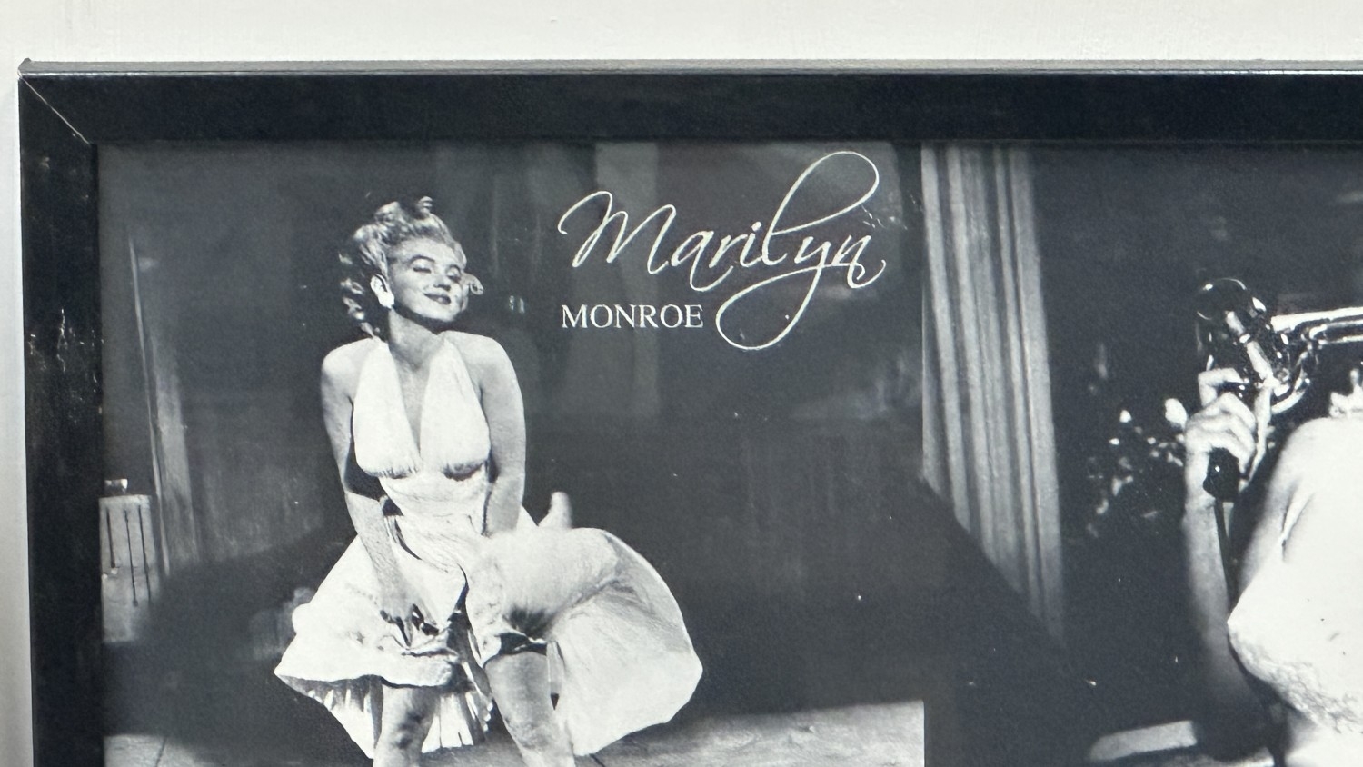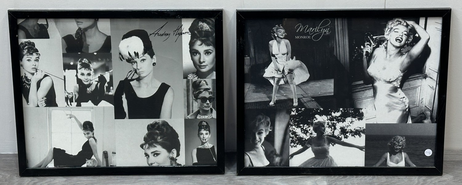 Two framed black and white collage prints, one Marilyn Monroe and one Audrey Hepburn - approx. 43cm high x 53cm wide