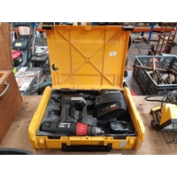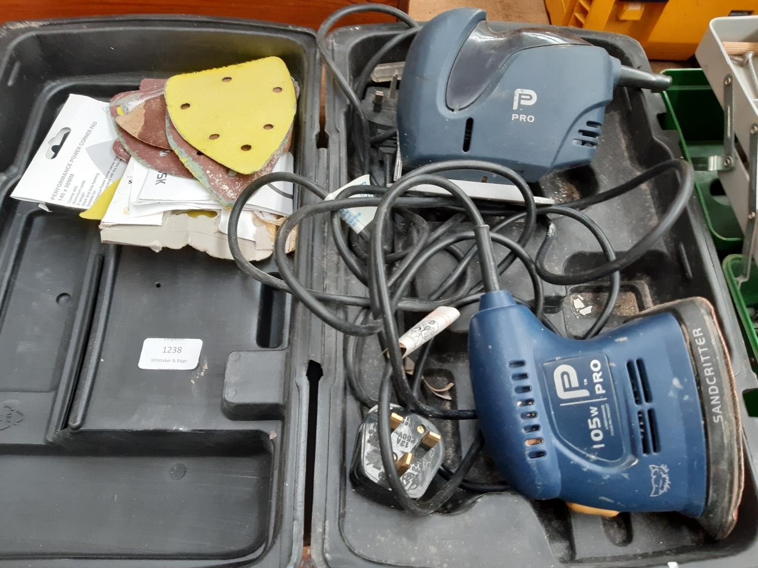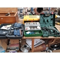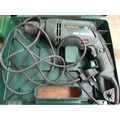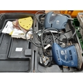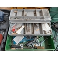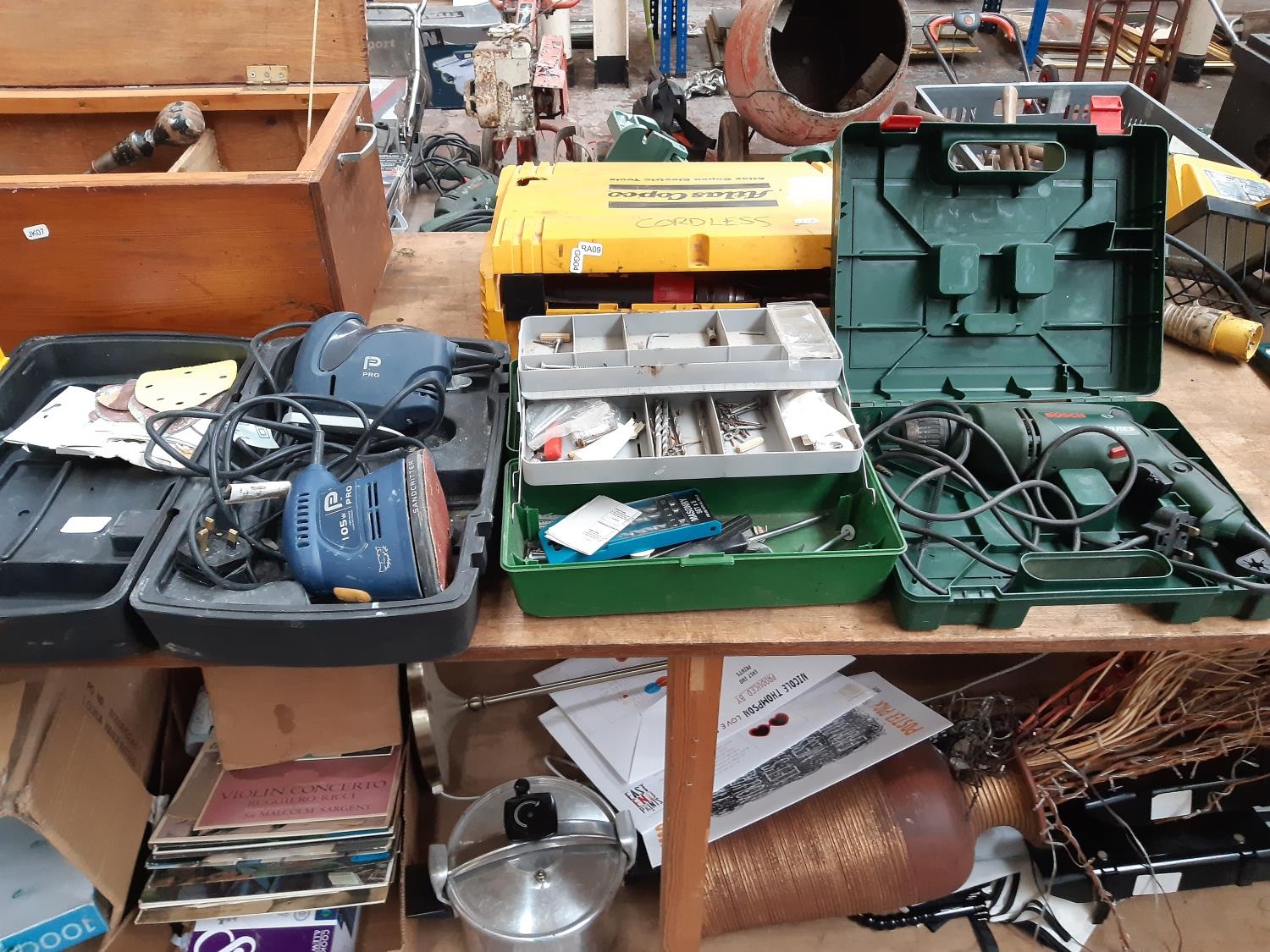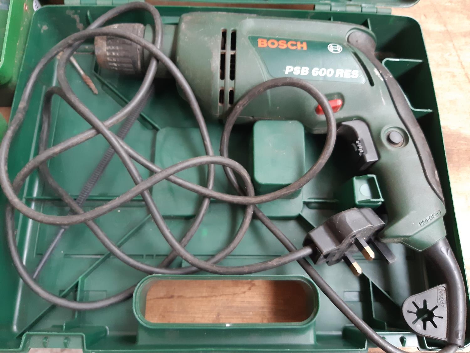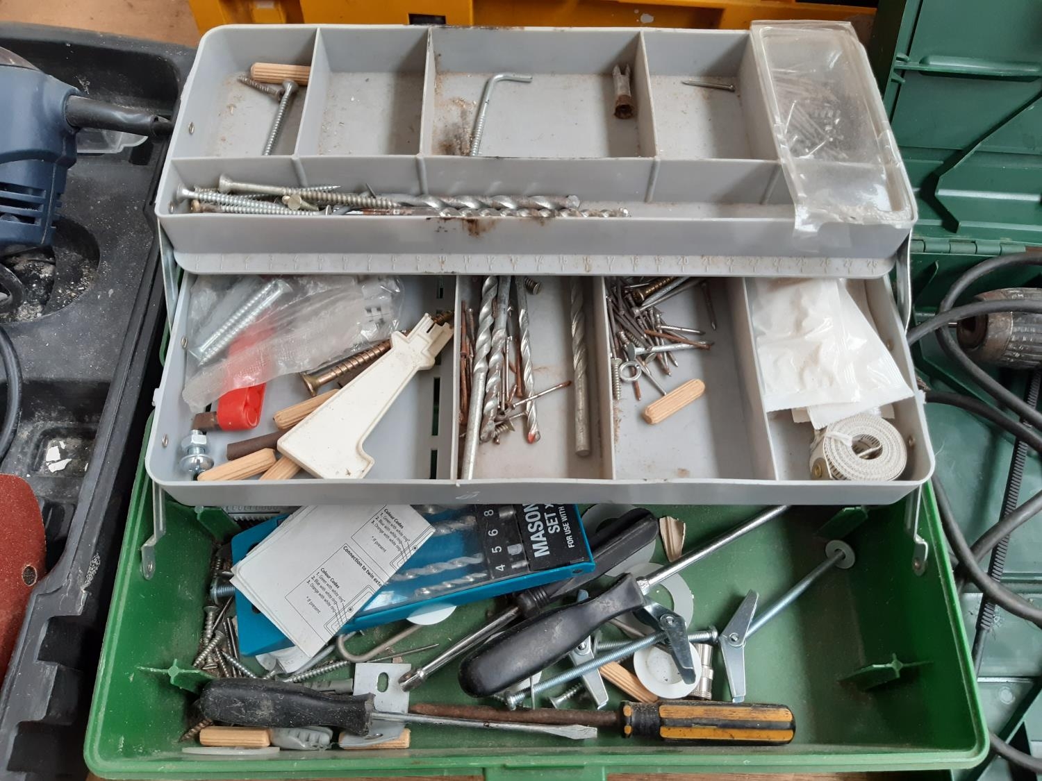 Three items, one cased green Bosch PSB600RES electric drill, one plastic fishing box containing drill bits, screwdrivers, screws and nails and one cased two piece Performance Power power tool set comprising CLM1055K palm sander and CLM180SC jigsaw