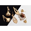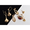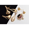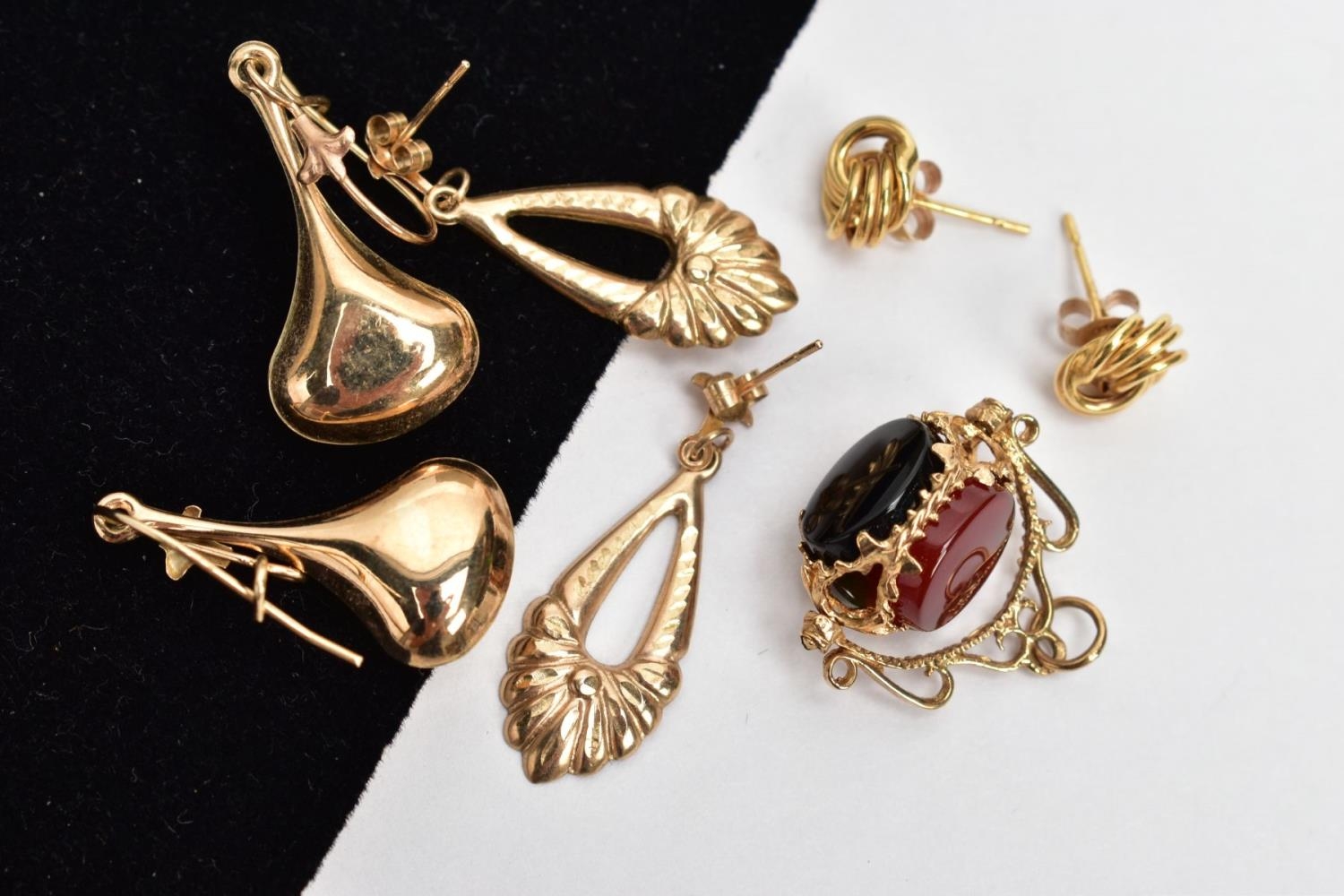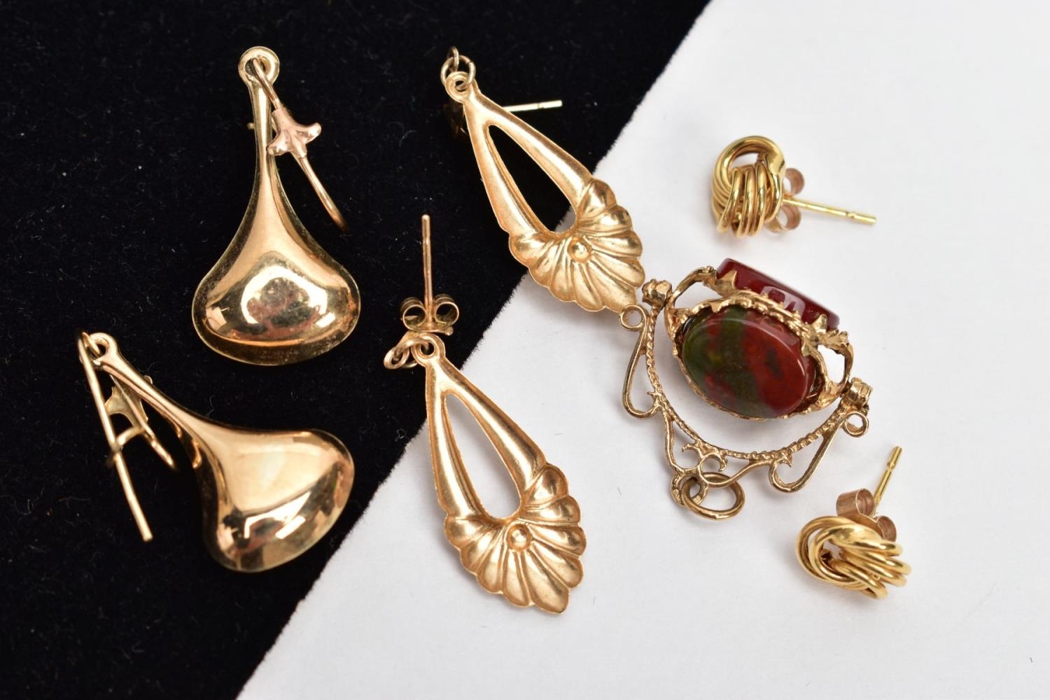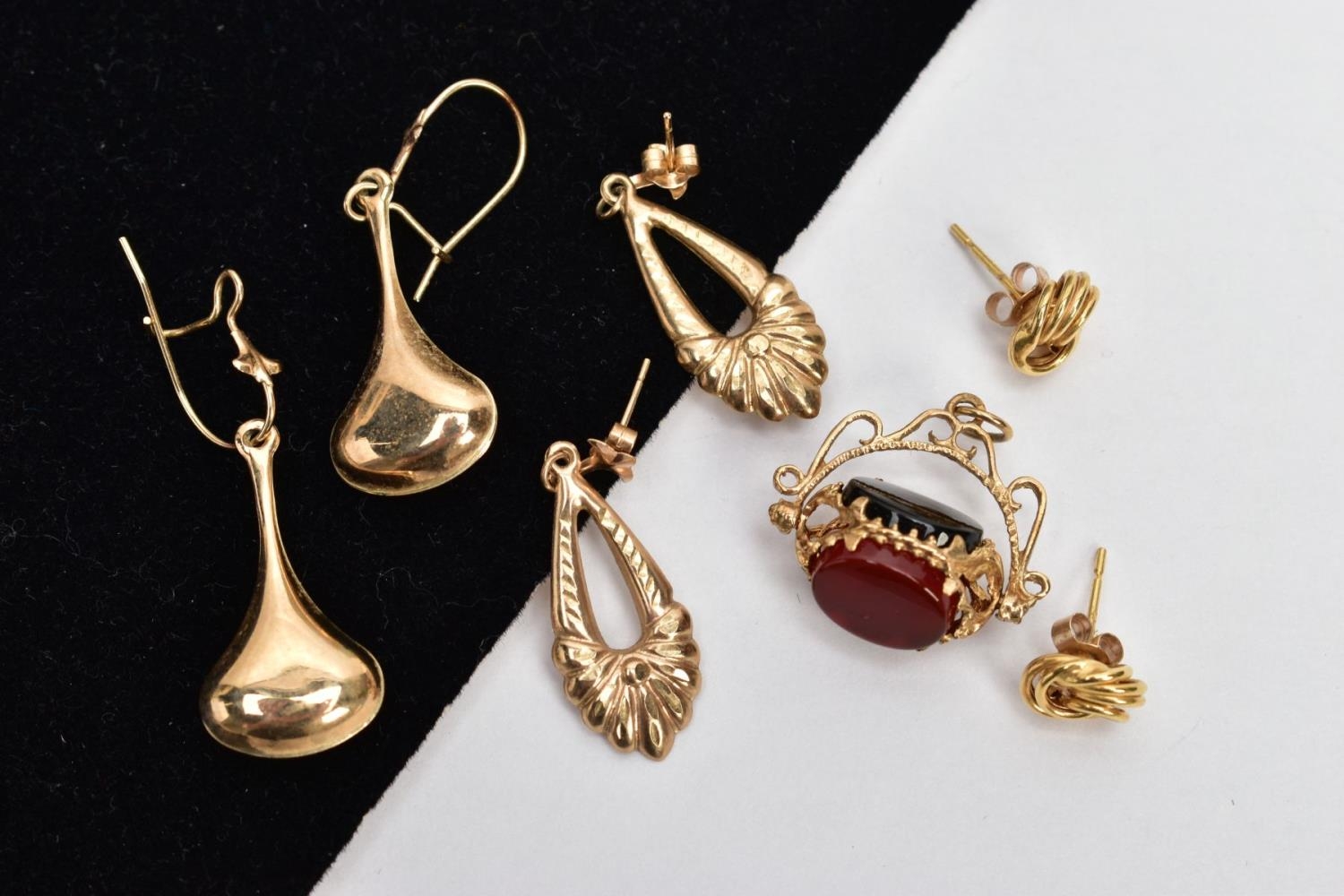 THREE PAIRS OF YELLOW METAL EARRINGS AND A SWIVEL FOB PENDANT, to include two pairs of drop earrings, one with fish hook fittings the other with post and scrolls stamped '9ct', a pair of knotted studs, post and scroll fittings and a three stone swivel fob set with onyx, carnelian and bloodstone, fitted within a scroll detailed mount with suspension loop, hallmarked 9ct gold Birmingham, approximate gross weight 5.0 grams (condition report: the earrings would benefit from a gentle clean, the swivel fob in working condition)