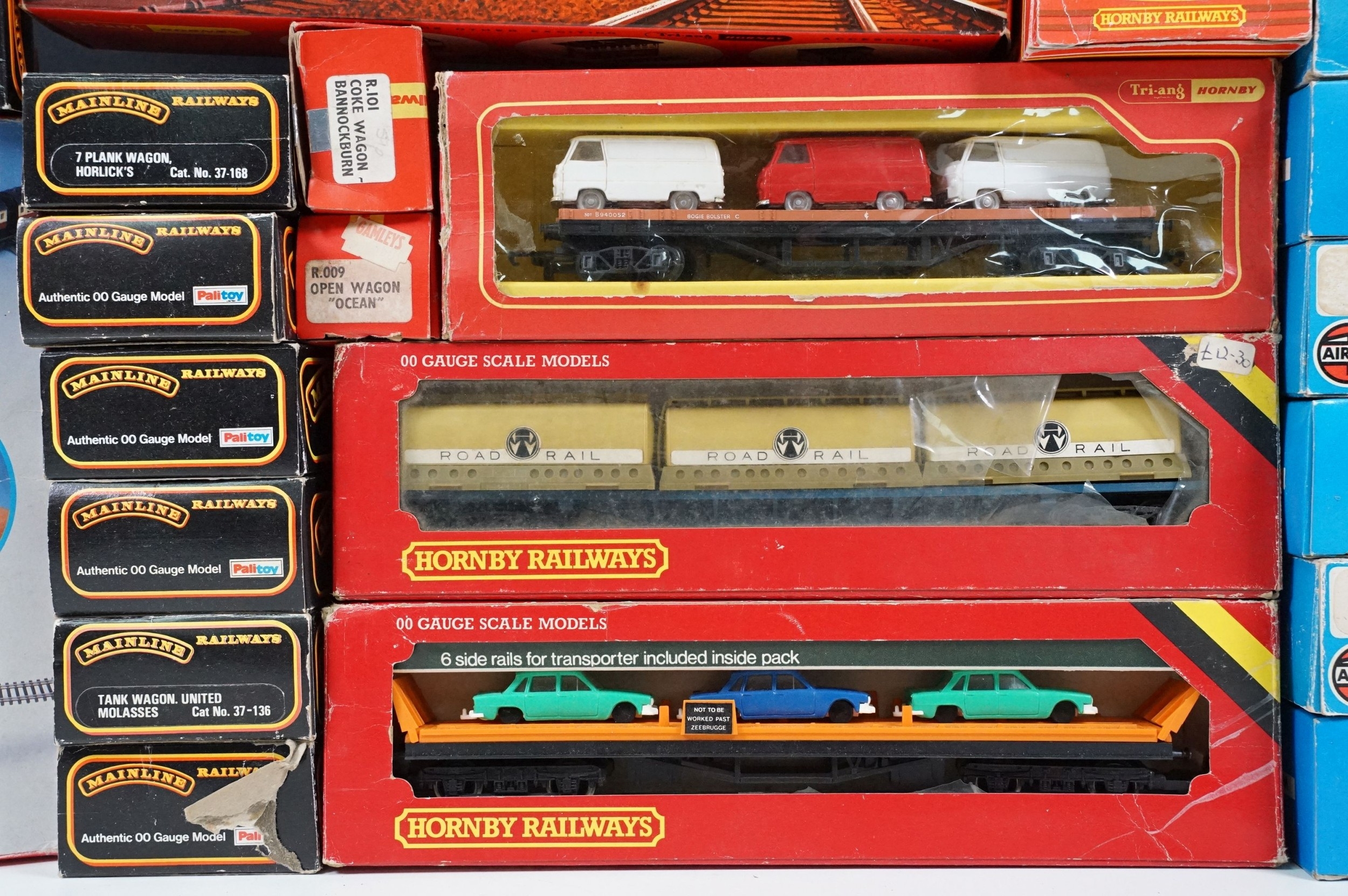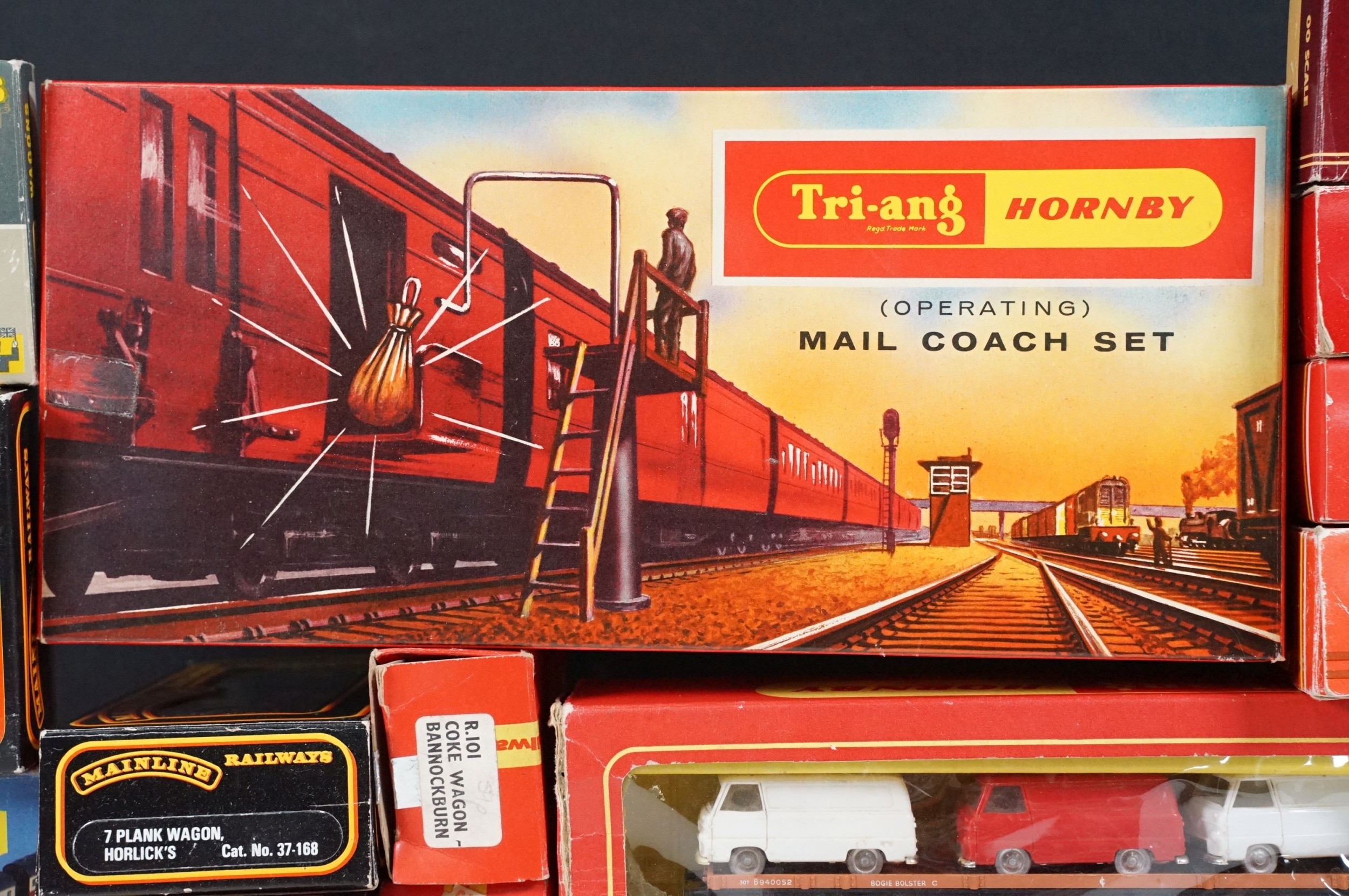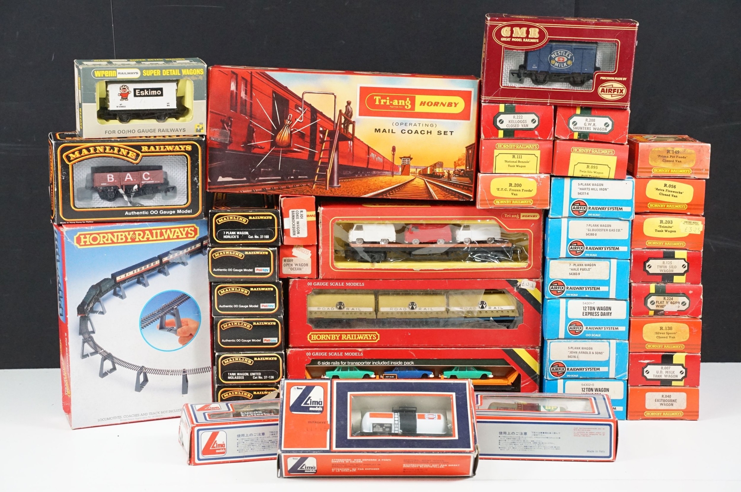 36 Boxed OO gauge items of rolling stock to include Hornby, Palitoy Mainline, Airfix, Lima and Wrenn, a few with incorrect boxes, plus boxed Triang Hornby R402 Operating Royal Mail Coach Set and a boxed Hornby R909 Elevated Track Support Set (38 items)